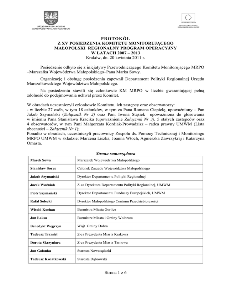 PROTOKÓŁ Z XV POSIEDZENIA KOMITETU MONITORUJĄCEGO MAŁOPOLSKI REGIONALNY PROGRAM OPERACYJNY W LATACH 2007 – 2013 Kraków, dn. 20 kwietnia 2011 r. Posiedzenie odbyło się z inicjatywy Przewodniczącego Komitetu Monitorującego MRPO –Marszałka Województwa Małopolskiego–Pana Marka Sowy. Organizację i obsługę posiedzenia zapewnił Departament Polityki Regionalnej Urzędu Marszałkowskiego Województwa Małopolskiego. Na posiedzeniu stawili się członkowie KM MRPO w liczbie gwarantującej pełną zdolność do podejmowania uchwał przez Komitet. W obradach uczestniczyli członkowie Komitetu, ich zastępcy oraz obserwatorzy: - w liczbie 27 osób, w tym 18 członków, w tym za Pana Romana Ciepielę, upoważniony – Pan Jakub Szymański (Załącznik Nr 2) oraz Pani Iwona Stąsiek upoważniona do głosowania w imieniu Pana Stanisława Kracika (upoważnienie Załącznik Nr 3), 5 stałych zastępców oraz 4 obserwatorów, w tym Pani Małgorzata Kordiak-Prowadzisz – radca prawny UMWM (Lista obecności – Załącznik Nr 1); Ponadto w obradach, uczestniczyli pracownicy Zespołu ds. Pomocy Technicznej i Monitoringu MRPO UMWM w składzie: Marzena Liszka, Joanna Włoch, Agnieszka Zawrzykraj i Katarzyna Omasta. Strona samorządowa Marek Sowa Marszałek Województwa Małopolskiego Stanisław Sorys Członek Zarządu Województwa Małopolskiego Jakub Szymański Dyrektor Departamentu Polityki Regionalnej Jacek Woźniak Z-ca Dyrektora Departamentu Polityki Regionalnej, UMWM Piotr Szymański Dyrektor Departamentu Funduszy Europejskich, UMWM Rafał Solecki Dyrektor Małopolskiego Centrum Przedsiębiorczości Witold Kochan Burmistrz Miasta Gorlice Jan Łaksa Burmistrz Miasta i Gminy Wolbrom Benedykt Węgrzyn Wójt Gminy Dobra Tadeusz Trzmiel Z-ca Prezydenta Miasta Krakowa Dorota Skrzyniarz Z-ca Prezydenta Miasta Tarnowa Jan Golonka Starosta Nowosądecki Tadeusz Kwiatkowski Starosta Dąbrowski Strona 1 z 6 Strona rządowa Marta Leśniak Z-ca Dyrektora Dep. Koordynacji i Wdrażania Programów Regionalnych, MRR Iwona Stąsiek Dyrektor Wydziału Certyfikacji i Administracji MUW Partnerzy społeczni i gospodarczy Piotr Tengowski Izba Rzemieślnicza w Nowym Sączu Franciszek Uszko Dyrektor Izby Rzemieślniczej w Tarnowie Jerzy Wrzecionek Małopolski Związek Pracodawców Tadeusz Walczak Członek Zarządu Małopolskiej Izby Rzemiosła i Przedsiębiorczości w Krakowie Paweł Kukla Prezes Sadeckiej Izby Gospodarczej dr hab. Jarosław Górniak Prodziekan Wydziału Filozoficznego UJ prof. dr hab. inż. Lidia J. Maksymowicz Akademia Górniczo-Hutnicza Piotr Rymarowicz Prezes Towarzystwa na rzecz Ziemi Obserwatorzy Błażej Gorgol Komisja Europejska Mariusz Piątkowski Dyrektor UKS w Krakowie Mariusz Borek Departament Polityki Regionalnej i Rolnictwa, MF Małgorzata KordiakProwadzisz Radca prawny UMWM I. Powitanie uczestników XV posiedzenia KM MRPO i przyjęcie porządku obrad. Posiedzeniu przewodniczył Pan Marek Sowa Marszałek Województwa Małopolskiego. Na wstępie Przewodniczący przywitał wszystkich zebranych, a w szczególności nowych członków, uczestniczących w pracach KM MRPO po raz pierwszy - Pana Witolda Kochana, Burmistrza Miasta Gorlice, wskazanego z ramienia Forum Wójtów, Burmistrzów i Prezydentów Małopolski, w miejsce Pana Zbysława Owczarskiego, Pana Jana Łaksę, Burmistrza Wolbromia, stałego zastępcę Pana Witolda Kochana oraz Pana Tadeusza Walczaka zgłoszonego przez Małopolską Izbę Rzemiosła i Przedsiębiorczości w Krakowie, w miejsce Pana Zdzisława Mąki. Następnie Pan Marek Sowa przedstawił program XV posiedzenia KM MRPO: 13.00 – 13.30 Lunch 13.30 – 13.45 Powitanie uczestników i otwarcie XV posiedzenia KM MRPO – Marek Sowa, Marszałek Województwa Małopolskiego Przyjęcie porządku obrad XV KM MRPO 13.45 – 14.15 Prezentacja bieżącego stanu realizacji MRPO – Stanisław Sorys, Członek Zarządu Województwa Małopolskiego Strona 2 z 6 14.15 – 15.00 Prezentacja projektu uchwały w sprawie propozycji zmian Małopolskiego Regionalnego Programu Operacyjnego na lata 2007-2013 w 2011 r. – Marek Sowa, Marszałek Województwa Małopolskiego Dyskusja i głosowanie Przyjęcie uchwały w sprawie zmian MRPO 15.00 – 15.15 Podsumowanie XV posiedzenia KM MRPO Wolne wnioski 15.15 Zakończenie XV posiedzenia KM MRPO Przedstawiony porządek obrad został przyjęty przez zebranych jednogłośnie (Załącznik Nr 4). Po przyjęciu porządku obrad Przewodniczący Komitetu oddał głos Panu Stanisławowi Sorysowi – Członkowi Zarządu Województwa Małopolskiego. II. Prezentacja Aktualnego stanu realizacji MRPO na lata 2007 – 2013. Prezentacji Aktualnego stanu realizacji MRPO na lata 2007 – 2013 (prezentacja Załącznik Nr 5) dokonał Pan Stanisław Sorys. Pan Stanisław Sorys w trakcie prezentacji skoncentrował się przede wszystkim na zmianach, jakie nastąpiły od ostatniego posiedzenia KM MPRO, które odbyło się w dniu 16 lutego 2011 roku. Przedstawił zebranym statystyki dotyczące wybranych projektów do dofinansowania w MRPO: ich ilość oraz wartość wg lokalizacji w powiatach, podkreślając, że wiele projektów ze względu na brak np. pozwoleń budowlanych lub problemów finansowych jest opóźnionych w realizacji. Pan Stanisław Sorys omówił również wartość dofinansowania per capita wybranych projektów, wyniki naborów, aktualnie trwające konkursy oraz przedstawił terminy konkursów planowanych do ogłoszenia. III. Prezentacja zmian zapisów MRPO. Prezentacji projektu uchwały w sprawie zmian w MRPO dokonał Pan Marek Sowa (prezentacja Załącznik Nr 6) Pan Marek Sowa zaprezentował zmiany w MRPO związane z rozdysponowaniem dodatkowych środków pochodzących z podziału Krajowej Rezerwy Wykonania. Następnie odniósł się do przekazanych IZ MRPO, na spotkaniu w MRR z udziałem przedstawicieli KE, rekomendacji w sprawie zmian do poszczególnych programów. Poinformował, że do jednej z nich, zalecającej koncentrację środków fina