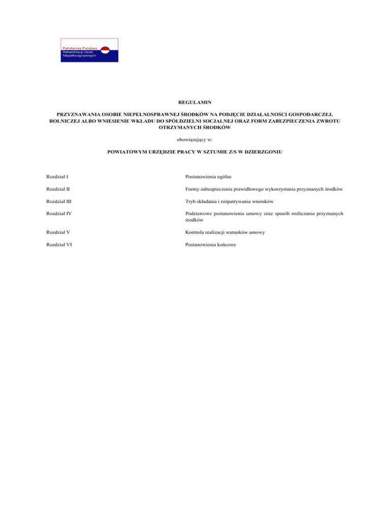 REGULAMIN PRZYZNAWANIA OSOBIE NIEPEŁNOSPRAWNEJ ŚRODKÓW NA PODJĘCIE DZIAŁALNOŚCI GOSPODARCZEJ, ROLNICZEJ ALBO WNIESIENIE WKŁADU DO SPÓŁDZIELNI SOCJALNEJ ORAZ FORM ZABEZPIECZENIA ZWROTU OTRZYMANYCH ŚRODKÓW obowiązujący w: POWIATOWYM URZĘDZIE PRACY W SZTUMIE Z/S W DZIERZGONIU Rozdział I Postanowienia ogólne Rozdział II Formy zabezpieczenia prawidłowego wykorzystania przyznanych środków Rozdział III Tryb składania i rozpatrywania wniosków Rozdział IV Podstawowe postanowienia umowy oraz sposób rozliczania przyznanych środków Rozdział V Kontrola realizacji warunków umowy Rozdział VI Postanowienia końcowe Rozdział I Postanowienia ogólne §1 Regulamin został opracowany na podstawie: 1. ustawy z dnia 20 kwietnia 2004 r. o promocji zatrudnienia i instytucjach rynku pracy (Dz.U. z 2016 r. poz. 645 z późn. zm.); 2. ustawy z dnia 27 sierpnia 1997r. o rehabilitacji zawodowej i społecznej oraz zatrudnianiu osób niepełnosprawnych (Dz.U. z 2011r. Nr 127, poz. 721 z późn. zm.); 3. rozporządzenia Ministra Pracy i Polityki Społecznej z dnia 17 października 2007 r. w sprawie przyznania osobie niepełnosprawnej środków na podjęcie działalności gospodarczej, rolniczej albo na wniesienie wkładu do spółdzielni socjalnej (Dz.U. z 2015 r., poz. 102); 4. ustawy z dnia 30 kwietnia 2004 r. o postępowaniu w sprawach dotyczących pomocy publicznej (Dz. U. z 2007 r. Nr 59, poz. 404 z późn. zm.); 5. rozporządzenia Komisji (UE) nr 1407/2013 z dnia 18 grudnia 2013r. w sprawie stosowania art. 107 i 108 Traktatu o funkcjonowaniu Unii Europejskiej do pomocy de minimis (Dz.Urz. UE L 352 z 24.12.2013, str. 1); 6. rozporządzenia Komisji (UE) nr 1408/2013 z dnia 18 grudnia 2013 r. w sprawie stosowania art. 107 i 108 Traktatu o funkcjonowaniu Unii Europejskiej do pomocy de minimis w sektorze rolnym (Dz.Urz. UE L 352 z 24.12.2013, str. 9); 7. rozporządzenia Komisji (UE) nr 717/2014 z dnia 27 czerwca 2014 r. w sprawie stosowania art. 107 i 108 Traktatu o funkcjonowaniu Unii Europejskiej do pomocy de minimis w sektorze rybołówstwa i akwakultury (Dz. Urz. UE L 190/45 z 28.06.2014, str. 45); 8. rozporządzenia Rady (WE) nr 659/1999 z 22 marca 1999 r. ustanawiającego szczegółowe zasady stosowania art. 93 TWE (Dz. Urz. UEsp. z 2008 r. 1 str. 339 z późn. zm.); 9. ustawy z dnia 2 lipca 2004 r. o swobodzie działalności gospodarczej (Dz.U. z 2013r. poz. 672 z późn. zm.); 10. ustawy z dnia 20 grudniu 1990r. o ubezpieczeniu społecznym rolników (Dz.U. z 2013r. poz. 1403 z późn.zm.); 11. ustawy z dnia 27 kwietnia 2006r. o spółdzielniach socjalnych (Dz.U. z 2006r. Nr 94, poz. 651 z późn. zm.); 12. Kodeksu Cywilnego. §2 Ilekroć w Regulaminie mowa jest o: 1.„Urzędzie" - należy przez to rozumieć Powiatowy Urząd Pracy w Sztumie z/s w Dzierzgoniu; 2. „Staroście” – oznacza to Starostę Powiatu Sztumskiego lub działającego z upoważnienia Starosty Sztumskiego, Dyrektora lub Zastępcę Dyrektora Powiatowego Urzędu Pracy w Sztumie z/s w Dzierzgoniu; 3. „ustawie" - należy przez to rozumieć ustawę z dnia 27 sierpnia 1997r. o rehabilitacji zawodowej i społecznej oraz zatrudnianiu osób niepełnosprawnych (t.j. Dz.U. z 2011r. Nr 127, poz. 721 z późn. zm.); 4. „rozporządzeniu" - należy przez to rozumieć Rozporządzenie Ministra Pracy i Polityki Społecznej z dnia 17 października 2007r. w sprawie przyznania osobie niepełnosprawnej środków na podjęcie działalności gospodarczej, rolniczej albo na wniesienie wkładu do spółdzielni socjalnej (Dz. U. z 2015r., poz. 102); 5. „Wnioskodawcy” – oznacza to osobę niepełnosprawną zarejestrowaną w Urzędzie, jako bezrobotna albo poszukująca pracy niepozostająca w zatrudnieniu; 6. „osobie niepełnosprawnej” - oznacza to osobę niepełnosprawną w rozumieniu przepisów ustawy o rehabilitacji zawodowej i społecznej oraz zatrudnianiu osób niepełnosprawnych; 7. „niepełnosprawności" - oznacza to trwałą lub okresową niezdolność do wypełniania ról społecznych z powodu stałego lub długotrwałego naruszenia sprawności organizmu, w szczególności powodującą niezdolność do pracy; 8. „przeciętnym wynagrodzeniu" - należy przez to rozumieć przeciętne miesięczne wynagrodzenie brutto w gospodarce narodowej w poprzednim kwartale od pierwszego dnia następnego miesiąca po ogłoszeniu przez Prezesa Głównego Urzędu Statystycznego w formie komunikatu w Dzienniku Urzędowym Rzeczypospolitej Polskiej „Monitor Polski", na podstawie art. 20 pkt 2 ustawy z dnia 17 grudnia 1998r. o emeryturach i rentach z Funduszu Ubezpieczeń Społecznych (Dz.U. z 2015r. poz. 748 z późn. zm.); 9. „środkach” – należy przez to rozumieć środki na: a) podjęcie po raz pierwszy działalności gospodarczej w rozumieniu przepisów o swobodzie działalności gospodarczej; b) podjęcie po raz pierwszy działalności rolniczej w rozumieniu przepisów o ubezpieczeniu społecznym rolników, w tym polegającej na prowadzeniu działów specjalnych produkcji rolnej, bez względu na formę prawną jej prowadzenia; c) wniesienie po raz pierwszy wkładu do spółdzielni socjalnej; d) ponowne podjęcie działalności, o której mowa w ust. 9 pkt a-b lub ponowne wniesienie wkładu do spółdzielni socjalnej, jeżeli zgodnie z oświadczeniem Wnioskodawcy upłynęło, co najmniej 12 miesięcy od zaprzestania prowadzenia tej działalności lub od ustania członkostwa w spółdzielni socjalnej. 10. „pomocy de minimis” – w rozumieniu art. 3 Rozporządzeń Komisji (UE) nr 1407/2013 z dnia 18 grudnia 2013 r. w sprawie stosowania art. 107 i 108 Traktatu o funkcjonowaniu Unii Europejskiej do pomocy de minimis (Dz. Urz. UE L 352 z 24.12.2013, str. 1) oznacza pomoc przyznaną jednemu przedsiębiorstwu w okresie 3 lat podatkowych (lata obrotowe stosowane przez przedsiębiorstwo w danym państwie członkowskim), która łącznie z pomocą udzieloną na podstawie wniosku nie przekroczy równowartości 200 000 EUR, w 