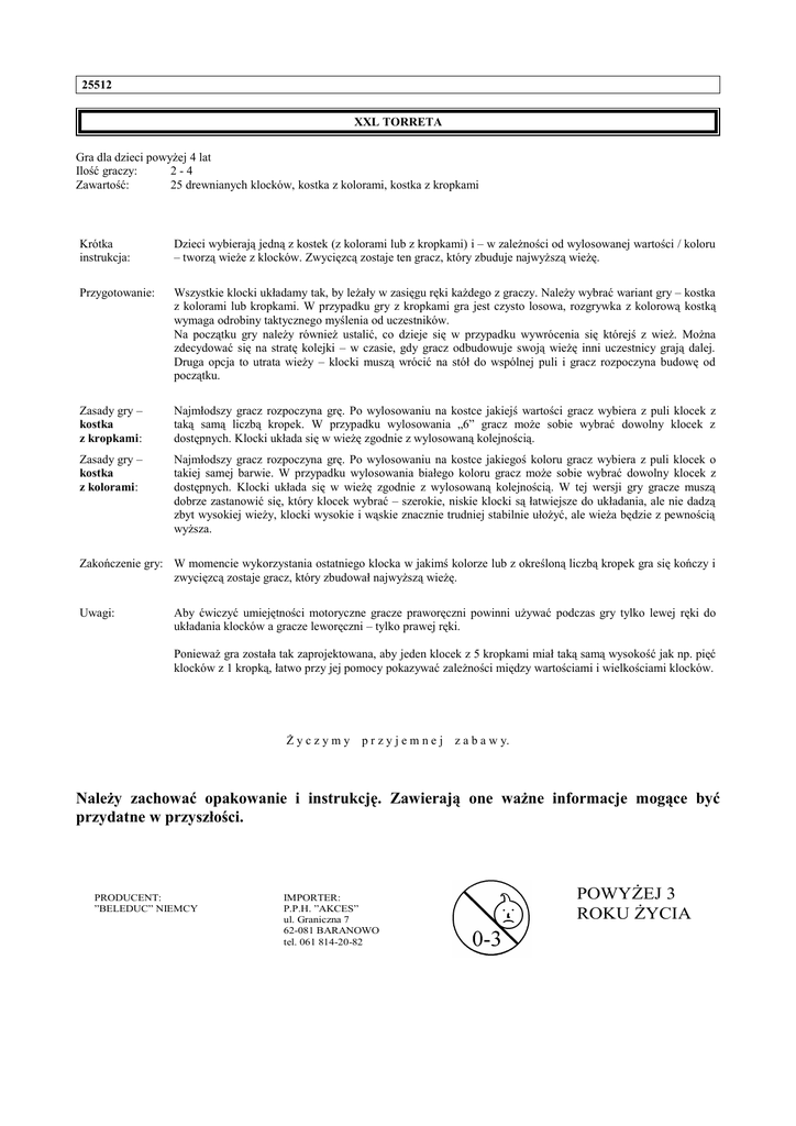 25512 XXL TORRETA Gra dla dzieci powyżej 4 lat Ilość graczy: 2-4 Zawartość: 25 drewnianych klocków, kostka z kolorami, kostka z kropkami Krótka instrukcja: Dzieci wybierają jedną z kostek (z kolorami lub z kropkami) i – w zależności od wylosowanej wartości / koloru – tworzą wieże z klocków. Zwycięzcą zostaje ten gracz, który zbuduje najwyższą wieżę. Przygotowanie: Wszystkie klocki układamy tak, by leżały w zasięgu ręki każdego z graczy. Należy wybrać wariant gry – kostka z kolorami lub kropkami. W przypadku gry z kropkami gra jest czysto losowa, rozgrywka z kolorową kostką wymaga odrobiny taktycznego myślenia od uczestników. Na początku gry należy również ustalić, co dzieje się w przypadku wywrócenia się którejś z wież. Można zdecydować się na stratę kolejki – w czasie, gdy gracz odbudowuje swoją wieżę inni uczestnicy grają dalej. Druga opcja to utrata wieży – klocki muszą wrócić na stół do wspólnej puli i gracz rozpoczyna budowę od początku. Zasady gry – kostka z kropkami: Najmłodszy gracz rozpoczyna grę. Po wylosowaniu na kostce jakiejś wartości gracz wybiera z puli klocek z taką samą liczbą kropek. W przypadku wylosowania „6” gracz może sobie wybrać dowolny klocek z dostępnych. Klocki układa się w wieżę zgodnie z wylosowaną kolejnością. Zasady gry – kostka z kolorami: Najmłodszy gracz rozpoczyna grę. Po wylosowaniu na kostce jakiegoś koloru gracz wybiera z puli klocek o takiej samej barwie. W przypadku wylosowania białego koloru gracz może sobie wybrać dowolny klocek z dostępnych. Klocki układa się w wieżę zgodnie z wylosowaną kolejnością. W tej wersji gry gracze muszą dobrze zastanowić się, który klocek wybrać – szerokie, niskie klocki są łatwiejsze do układania, ale nie dadzą zbyt wysokiej wieży, klocki wysokie i wąskie znacznie trudniej stabilnie ułożyć, ale wieża będzie z pewnością wyższa. Zakończenie gry: W momencie wykorzystania ostatniego klocka w jakimś kolorze lub z określoną liczbą kropek gra się kończy i zwycięzcą zostaje gracz, który zbudował najwyższą wieżę. Uwagi: Aby ćwiczyć umiejętności motoryczne gracze praworęczni powinni używać podczas gry tylko lewej ręki do układania klocków a gracze leworęczni – tylko prawej ręki. Ponieważ gra została tak zaprojektowana, aby jeden klocek z 5 kropkami miał taką samą wysokość jak np. pięć klocków z 1 kropką, łatwo przy jej pomocy pokazywać zależności między wartościami i wielkościami klocków. Ż y c z y m y p r z y j e m n e j z a b a w y. Należy zachować opakowanie i instrukcję. Zawierają one ważne informacje mogące być przydatne w przyszłości. PRODUCENT: ”BELEDUC” NIEMCY IMPORTER: P.P.H. ”AKCES” ul. Graniczna 7 62-081 BARANOWO tel. 061 814-20-82 POWYŻEJ 3 ROKU ŻYCIA