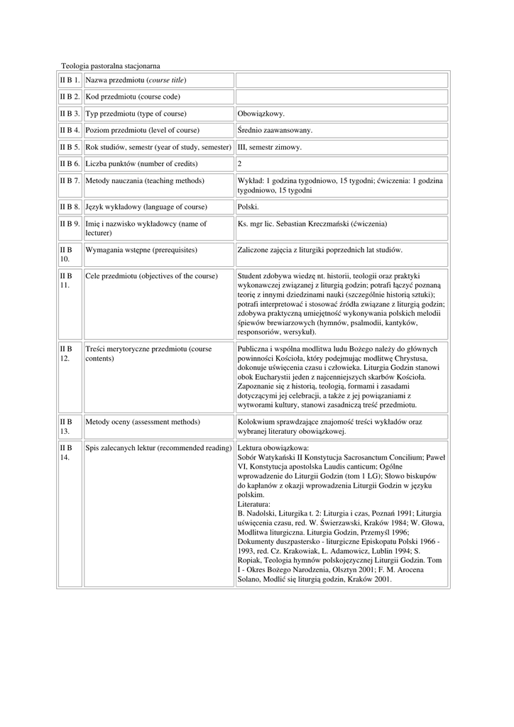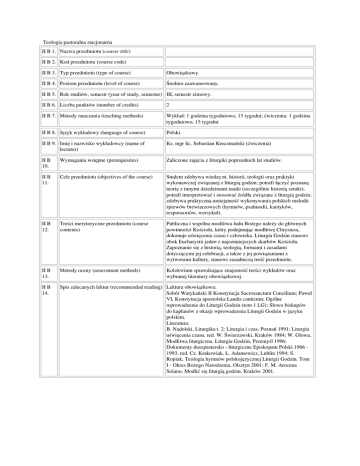Teologia pastoralna stacjonarna II B 1. Nazwa przedmiotu (course title) II B 2. Kod przedmiotu (course code) II B 3. Typ przedmiotu (type of course) Obowiązkowy. II B 4. Poziom przedmiotu (level of course) Średnio zaawansowany. II B 5. Rok studiów, semestr (year of study, semester) III, semestr zimowy. II B 6. Liczba punktów (number of credits) 2 II B 7. Metody nauczania (teaching methods) Wykład: 1 godzina tygodniowo, 15 tygodni; ćwiczenia: 1 godzina tygodniowo, 15 tygodni II B 8. Język wykładowy (language of course) Polski. II B 9. Imię i nazwisko wykładowcy (name of lecturer) Ks. mgr lic. Sebastian Kreczmański (ćwiczenia) II B 10. Wymagania wstępne (prerequisites) Zaliczone zajęcia z liturgiki poprzednich lat studiów. II B 11. Cele przedmiotu (objectives of the course) Student zdobywa wiedzę nt. historii, teologii oraz praktyki wykonawczej związanej z liturgią godzin; potrafi łączyć poznaną teorię z innymi dziedzinami nauki (szczególnie historią sztuki); potrafi interpretować i stosować źródła związane z liturgią godzin; zdobywa praktyczną umiejętność wykonywania polskich melodii śpiewów brewiarzowych (hymnów, psalmodii, kantyków, responsoriów, wersykuł). II B 12. Treści merytoryczne przedmiotu (course contents) Publiczna i wspólna modlitwa ludu Bożego należy do głównych powinności Kościoła, który podejmując modlitwę Chrystusa, dokonuje uświęcenia czasu i człowieka. Liturgia Godzin stanowi obok Eucharystii jeden z najcenniejszych skarbów Kościoła. Zapoznanie się z historią, teologią, formami i zasadami dotyczącymi jej celebracji, a także z jej powiązaniami z wytworami kultury, stanowi zasadniczą treść przedmiotu. II B 13. Metody oceny (assessment methods) Kolokwium sprawdzające znajomość treści wykładów oraz wybranej literatury obowiązkowej. II B 14. Spis zalecanych lektur (recommended reading) Lektura obowiązkowa: Sobór Watykański II Konstytucja Sacrosanctum Concilium; Paweł VI, Konstytucja apostolska Laudis canticum; Ogólne wprowadzenie do Liturgii Godzin (tom 1 LG); Słowo biskupów do kapłanów z okazji wprowadzenia Liturgii Godzin w języku polskim. Literatura: B. Nadolski, Liturgika t. 2: Liturgia i czas, Poznań 1991; Liturgia uświęcenia czasu, red. W. Świerzawski, Kraków 1984; W. Głowa, Modlitwa liturgiczna. Liturgia Godzin, Przemyśl 1996; Dokumenty duszpastersko liturgiczne Episkopatu Polski 1966 1993, red. Cz. Krakowiak, L. Adamowicz, Lublin 1994; S. Ropiak, Teologia hymnów polskojęzycznej Liturgii Godzin. Tom I Okres Bożego Narodzenia, Olsztyn 2001; F. M. Arocena Solano, Modlić się liturgią godzin, Kraków 2001.