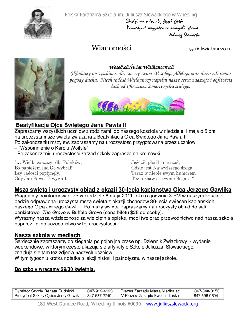 Polska Parafialna Szkoła im. Juliusza Słowackiego w Wheeling Chodzi mi o to, aby język giętki Powiedział wszystko co pomyśli głowa. Juliusz Słowacki Wiadomości 15-16 kwietnia 2011 Wesoł Wesołych Świą wiąt Wielkanocnych Składamy wszystkim serdeczne Ŝyczenia Wesołego Alleluja oraz duŜo zdrowia i pogody ducha. Niech radość Wielkanocy napełni nasze serca nadzieją i obfitością łask od Chrystusa Zmartwychwstałego. Beatyfikacja Ojca Świętego Jana Pawła II Zapraszamy wszystkich uczniow z rodzinami do naszego kosciola w niedziele 1 maja o 5 pm. na uroczysta msze swieta zwiazana z Beatyfikacja Ojca Swietego Jana Pawla II. Po zakonczeniu mszy sw. zapraszamy na uroczystosc przygotowana przez uczniow – “Wspomnienie o Karolu Wojtyle” . Po zakonczeniu uroczystosci zarzad szkoly zaprasza na kremowki. ”… Wielki zaszczyt dla Polaków, Jeździł, głosił i nauczał, Gdzie jest NajwyŜszego droga. Teraz w niebie swym humorem TeŜ rozbawia pewnie Boga… “ Bo papieŜem lud Go wybrał! Łzy radości popłynęły, Gdy Jan Paweł II wygrał. Msza swieta i uroczysty obiad z okazji 30-lecia kaplanstwa Ojca Jerzego Gawlika Pragniemy poinformowac, ze w niedziele 8 maja 2011 roku o godzinie 3 PM w naszym kosciele bedzie odprawiona uroczysta msza swieta z okazji obchodow 30-lecia swiecen kaplanskich naszego Ojca Jerzego Gawlik. Po mszy swietej zapraszamy na uroczysty obiad do sali bankietowej The Grove w Buffalo Grove (cena biletu $25 od osoby). Wyrazmy nasza wdziecznosc za wieloletnia opieke, modlitwe oraz przewodnictwo nad nasza szkola poprzez liczne uczestnictwo w tej uroczystosci Nasza szkola w mediach Serdecznie zapraszamy do siegania po polonijna prase np. Dziennik Zwiazkowy - wydanie weekendowe, w ktorym czesto ukazuja sie artykuly o Szkole Juliusza. Slowackiego, znajduja sie tam tez zdjecia naszych uczniow. W tym tygodniu krotka notatka o lekcji historii i patriotyzmu w naszej szkole. Do szkoly wracamy 29/30 kwietnia. Dyrektor Szkoly Renata Rudnicki Prezydent Szkoły Ojciec Jerzy Gawlik 847-912-4193 847-537-2740 Prezes Zarządu Marta Niedbalec V-Prezes Zarządu Ewelina Laska 181 West Dundee Road, Wheeling Illinois 60090 847-848-0150 847-596-0604 www.juliuszslowacki.org
