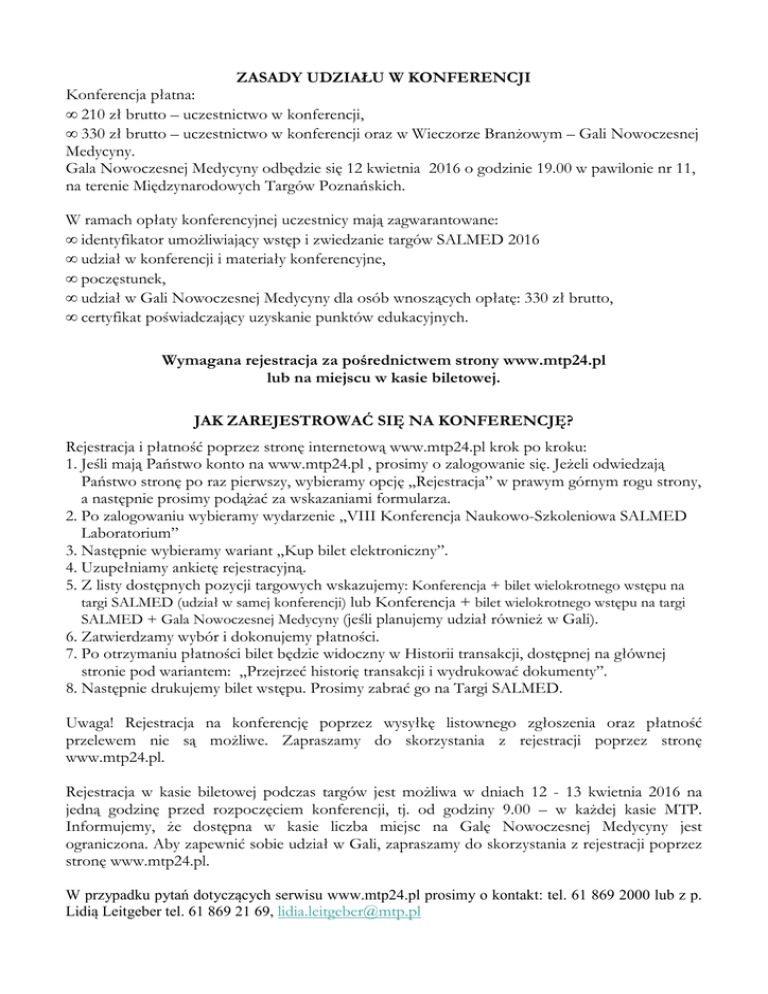 ZASADY UDZIAŁU W KONFERENCJI Konferencja płatna: • 210 zł brutto – uczestnictwo w konferencji, • 330 zł brutto – uczestnictwo w konferencji oraz w Wieczorze Branżowym – Gali Nowoczesnej Medycyny. Gala Nowoczesnej Medycyny odbędzie się 12 kwietnia 2016 o godzinie 19.00 w pawilonie nr 11, na terenie Międzynarodowych Targów Poznańskich. W ramach opłaty konferencyjnej uczestnicy mają zagwarantowane: • identyfikator umożliwiający wstęp i zwiedzanie targów SALMED 2016 • udział w konferencji i materiały konferencyjne, • poczęstunek, • udział w Gali Nowoczesnej Medycyny dla osób wnoszących opłatę: 330 zł brutto, • certyfikat poświadczający uzyskanie punktów edukacyjnych. Wymagana rejestracja za pośrednictwem strony www.mtp24.pl lub na miejscu w kasie biletowej. JAK ZAREJESTROWAĆ SIĘ NA KONFERENCJĘ? Rejestracja i płatność poprzez stronę internetową www.mtp24.pl krok po kroku: 1. Jeśli mają Państwo konto na www.mtp24.pl , prosimy o zalogowanie się. Jeżeli odwiedzają Państwo stronę po raz pierwszy, wybieramy opcję „Rejestracja” w prawym górnym rogu strony, a następnie prosimy podążać za wskazaniami formularza. 2. Po zalogowaniu wybieramy wydarzenie „VIII Konferencja Naukowo-Szkoleniowa SALMED Laboratorium” 3. Następnie wybieramy wariant „Kup bilet elektroniczny”. 4. Uzupełniamy ankietę rejestracyjną. 5. Z listy dostępnych pozycji targowych wskazujemy: Konferencja + bilet wielokrotnego wstępu na targi SALMED (udział w samej konferencji) lub Konferencja + bilet wielokrotnego wstępu na targi SALMED + Gala Nowoczesnej Medycyny (jeśli planujemy udział również w Gali). 6. Zatwierdzamy wybór i dokonujemy płatności. 7. Po otrzymaniu płatności bilet będzie widoczny w Historii transakcji, dostępnej na głównej stronie pod wariantem: „Przejrzeć historię transakcji i wydrukować dokumenty”. 8. Następnie drukujemy bilet wstępu. Prosimy zabrać go na Targi SALMED. Uwaga! Rejestracja na konferencję poprzez wysyłkę listownego zgłoszenia oraz płatność przelewem nie są możliwe. Zapraszamy do skorzystania z rejestracji poprzez stronę www.mtp24.pl. Rejestracja w kasie biletowej podczas targów jest możliwa w dniach 12 - 13 kwietnia 2016 na jedną godzinę przed rozpoczęciem konferencji, tj. od godziny 9.00 – w każdej kasie MTP. Informujemy, że dostępna w kasie liczba miejsc na Galę Nowoczesnej Medycyny jest ograniczona. Aby zapewnić sobie udział w Gali, zapraszamy do skorzystania z rejestracji poprzez stronę www.mtp24.pl. W przypadku pytań dotyczących serwisu www.mtp24.pl prosimy o kontakt: tel. 61 869 2000 lub z p. Lidią Leitgeber tel. 61 869 21 69, [email protected]