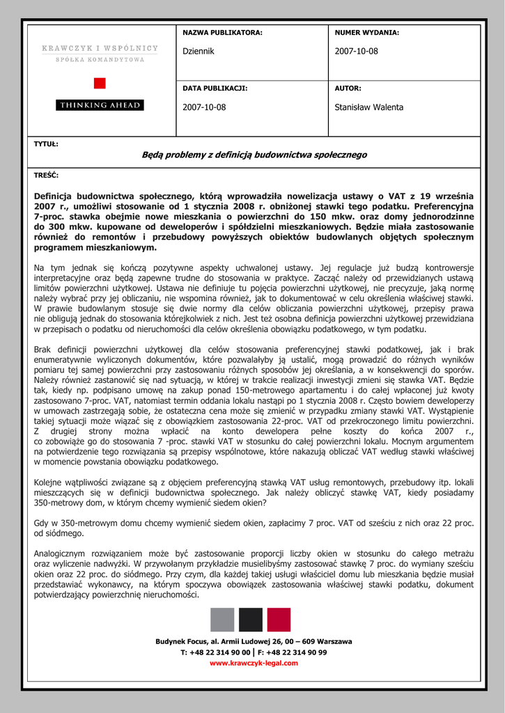 NAZWA PUBLIKATORA: NUMER WYDANIA: Dziennik 2007-10-08 DATA PUBLIKACJI: AUTOR: 2007-10-08 Stanisław Walenta TYTUŁ: Będą problemy z definicją budownictwa społecznego TREŚĆ: Definicja budownictwa społecznego, którą wprowadziła nowelizacja ustawy o VAT z 19 września 2007 r., umożliwi stosowanie od 1 stycznia 2008 r. obniżonej stawki tego podatku. Preferencyjna 7-proc. stawka obejmie nowe mieszkania o powierzchni do 150 mkw. oraz domy jednorodzinne do 300 mkw. kupowane od deweloperów i spółdzielni mieszkaniowych. Będzie miała zastosowanie również do remontów i przebudowy powyższych obiektów budowlanych objętych społecznym programem mieszkaniowym. Na tym jednak się kończą pozytywne aspekty uchwalonej ustawy. Jej regulacje już budzą kontrowersje interpretacyjne oraz będą zapewne trudne do stosowania w praktyce. Zacząć należy od przewidzianych ustawą limitów powierzchni użytkowej. Ustawa nie definiuje tu pojęcia powierzchni użytkowej, nie precyzuje, jaką normę należy wybrać przy jej obliczaniu, nie wspomina również, jak to dokumentować w celu określenia właściwej stawki. W prawie budowlanym stosuje się dwie normy dla celów obliczania powierzchni użytkowej, przepisy prawa nie obligują jednak do stosowania którejkolwiek z nich. Jest też osobna definicja powierzchni użytkowej przewidziana w przepisach o podatku od nieruchomości dla celów określenia obowiązku podatkowego, w tym podatku. Brak definicji powierzchni użytkowej dla celów stosowania preferencyjnej stawki podatkowej, jak i brak enumeratywnie wyliczonych dokumentów, które pozwalałyby ją ustalić, mogą prowadzić do różnych wyników pomiaru tej samej powierzchni przy zastosowaniu różnych sposobów jej określania, a w konsekwencji do sporów. Należy również zastanowić się nad sytuacją, w której w trakcie realizacji inwestycji zmieni się stawka VAT. Będzie tak, kiedy np. podpisano umowę na zakup ponad 150-metrowego apartamentu i do całej wpłaconej już kwoty zastosowano 7-proc. VAT, natomiast termin oddania lokalu nastąpi po 1 stycznia 2008 r. Często bowiem deweloperzy w umowach zastrzegają sobie, że ostateczna cena może się zmienić w przypadku zmiany stawki VAT. Wystąpienie takiej sytuacji może wiązać się z obowiązkiem zastosowania 22-proc. VAT od przekroczonego limitu powierzchni. Z drugiej strony można wpłacić na konto dewelopera pełne koszty do końca 2007 r., co zobowiąże go do stosowania 7 -proc. stawki VAT w stosunku do całej powierzchni lokalu. Mocnym argumentem na potwierdzenie tego rozwiązania są przepisy wspólnotowe, które nakazują obliczać VAT według stawki właściwej w momencie powstania obowiązku podatkowego. Kolejne wątpliwości związane są z objęciem preferencyjną stawką VAT usług remontowych, przebudowy itp. lokali mieszczących się w definicji budownictwa społecznego. Jak należy obliczyć stawkę VAT, kiedy posiadamy 350-metrowy dom, w którym chcemy wymienić siedem okien? Gdy w 350-metrowym domu chcemy wymienić siedem okien, zapłacimy 7 proc. VAT od sześciu z nich oraz 22 proc. od siódmego. Analogicznym rozwiązaniem może być zastosowanie proporcji liczby okien w stosunku do całego metrażu oraz wyliczenie nadwyżki. W przywołanym przykładzie musielibyśmy zastosować stawkę 7 proc. do wymiany sześciu okien oraz 22 proc. do siódmego. Przy czym, dla każdej takiej usługi właściciel domu lub mieszkania będzie musiał przedstawiać wykonawcy, na którym spoczywa obowiązek zastosowania właściwej stawki podatku, dokument potwierdzający powierzchnię nieruchomości. Budynek Focus, al. Armii Ludowej 26, 00 – 609 Warszawa T: +48 22 314 90 00 | F: +48 22 314 90 99 www.krawczyk-legal.com Faktura dokumentująca wykonane usługi będzie musiała pokazywać rozbicie prac na dwie pozycje opodatkowane według różnych stawek VAT. Należy również zauważyć problem, jaki może powstać przy przebudowie obiektów. Jaką stawkę VAT należy zastosować w przypadku, gdy właściciel dwóch 100-metrowych lokali postanowi połączyć je w jeden? Czy to będzie miało wpływ na zmianę stawki VAT, czy jednak pozostanie neutralne podatkowo z uwagi na to, że podatek VAT już został raz zapłacony od całej powierzchni obu lokali? Czy to może oznaczać, że od 50 metrów niemieszczących się w limicie należy zapłacić dodatkowo 15 proc. VAT? Wydaje się, że w takiej sytuacji wyższą stawką będą objęte tylko usługi przebudowy lokali. Budynek Focus, al. Armii Ludowej 26, 00 – 609 Warszawa T: +48 22 314 90 00 | F: +48 22 314 90 99 www.krawczyk-legal.com