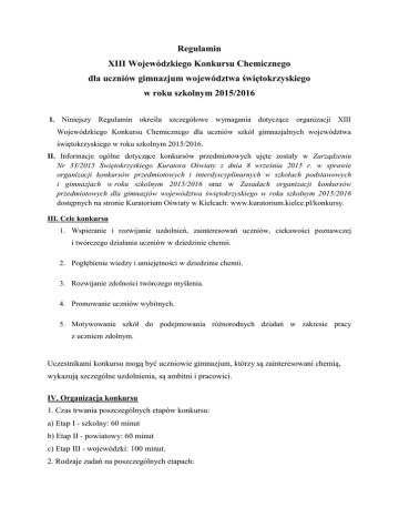 Regulamin XIII Wojewódzkiego Konkursu Chemicznego dla uczniów gimnazjum województwa świętokrzyskiego w roku szkolnym 2015/2016 I. Niniejszy Regulamin określa szczegółowe wymagania dotyczące organizacji XIII Wojewódzkiego Konkursu Chemicznego dla uczniów szkół gimnazjalnych województwa świętokrzyskiego w roku szkolnym 2015/2016. II. Informacje ogólne dotyczące konkursów przedmiotowych ujęte zostały w Zarządzeniu Nr 33/2015 Świętokrzyskiego Kuratora Oświaty z dnia 8 września 2015 r. w sprawie organizacji konkursów przedmiotowych i interdyscyplinarnych w szkołach podstawowych i gimnazjach w roku szkolnym 2015/2016 oraz w Zasadach organizacji konkursów przedmiotowych dla gimnazjów województwa świętokrzyskiego w roku szkolnym 2015/2016 dostępnych na stronie Kuratorium Oświaty w Kielcach: www.kuratorium.kielce.pl/konkursy. III. Cele konkursu 1. Wspieranie i rozwijanie uzdolnień, zainteresowań uczniów, ciekawości poznawczej i twórczego działania uczniów w dziedzinie chemii. 2. Pogłębienie wiedzy i umiejętności w dziedzinie chemii. 3. Rozwijanie zdolności twórczego myślenia. 4. Promowanie uczniów wybitnych. 5. Motywowanie szkół do podejmowania różnorodnych działań w zakresie pracy z uczniem zdolnym. Uczestnikami konkursu mogą być uczniowie gimnazjum, którzy są zainteresowani chemią, wykazują szczególne uzdolnienia, są ambitni i pracowici. IV. Organizacja konkursu 1. Czas trwania poszczególnych etapów konkursu: a) Etap I - szkolny: 60 minut b) Etap II - powiatowy: 60 minut c) Etap III - wojewódzki: 100 minut. 2. Rodzaje zadań na poszczególnych etapach: a) Etap I - szkolny: zadania zamknięte i otwarte b) Etap II - powiatowy: zadania zamknięte c) Etap III - wojewódzki: zadania zamknięte i otwarte. 3. Podczas eliminacji konkursowych na każdym etapie uczeń jest zobowiązany okazać się legitymacją szkolną lub innym ważnym dokumentem tożsamości. 4. Na każdym etapie Konkursu uczeń może korzystać z prostego kalkulatora. Zabrania się wnoszenia do sal, w których odbywa się konkurs innych pomocy, w tym: układu okresowego pierwiastków, tabeli rozpuszczalności, podręczników, książek, telefonów komórkowych, sprzętu elektronicznego. 5. Podczas rozwiązywania zadań na I i III etapie uczeń używa pióra lub długopisu, nie może używać korektora, a błędne zapisy powinien przekreślić. 6. Na II etapie Konkursu uczniowie mogą korzystać z brudnopisów przygotowanych przez dyrektora szkoły, w której odbywa się II etap Konkursu. Po zakończeniu pracy z arkuszem zadań brudnopis zostaje zwrócony do Szkolnego Zespołu Nadzorującego i nie podlega sprawdzeniu. V. Tematyka i wymagane umiejętności na poszczególnych etapach konkursu Na każdym etapie obowiązuje podstawa programowa chemii dla III etapu edukacyjnego (chemia organiczna tylko na etapie III Konkursu) I etap –szkolny obowiązuje 1. WEWNĘTRZNA BUDOWA MATERII (dotyczy pierwiastków grup głównych) – budowa atomu, powłokowe konfiguracje elektronowe, rdzeń atomowy, - wiązania chemiczne (kowalencyjne, kowalencyjne spolaryzowane, jonowe), - układ okresowy pierwiastków (aktywność, charakter chemiczny, promień atomu, jonu) - izotopy, promieniotwórczość naturalna (, -). 2. WŁAŚCIWOŚCI FIZYCZNE, ZASTOSOWANIE METALI I NIEMETALI (sód, magnez, wapń, miedź, żelazo, cynk, srebro, glin, ołów, siarka, fosfor, węgiel, chlor, brom). 3. TYPY REAKCJI CHEMICZNYCH - synteza, analiza, wymiana, - reakcje egzo- i endoenergetyczne. 4. TLENKI, WODOROTLENKI, KWASY, SOLE, WODOROSOLE, HYDRATY – wzory sumaryczne i strukturalne, - nazewnictwo systematyczne i zwyczajowe, - otrzymywanie, właściwości, - zastosowanie oraz ich wpływ na środowisko. 5. WODA I ROZTWORY WODNE - typy roztworów, - rozpuszczalność, - dysocjacja jonowa elektrolitów (również stopniowa), - odczyn, skala pH roztworu (w ujęciu jakościowym), - wskaźniki kwasowo –zasadowe (uniwersalny papierek wskaźnikowy, oranż metylowy, fenoloftaleina, lakmus), - reakcje jonowe --reakcje metali z kwasami (szereg aktywności, pasywacja), --zobojętnianie, -- reakcje strącania osadów, Zadania rachunkowe dotyczące: - stężenia procentowego (rozcieńczania, zatężania, mieszania roztworów), - rozpuszczalności, - prawa stałości składu, - prawa zachowania masy. II etap - powiatowy Obowiązują zagadnienia z I etapu oraz: 1. REAKCJE UTLENIENIA I REDUKCJI - stopień utlenienia, utleniacz, reduktor, - bilansowanie reakcji redoks (jonowych i cząsteczkowych). 2. ELEKTROLITY MOCNE I SŁABE, HYDROLIZA 3. TWARDOŚĆ WODY. 4. AMFOTERYCZNOŚĆ (tlenki, wodorotlenki) Zadania rachunkowe dotyczące : - obliczeń stechiometrycznych i niestechiometrycznych w odniesieniu do reagentów reakcji. III etap Obowiązują zagadnienia z I i II etapu, 1. WĘGLOWODORY NASYCONE I NIENASYCONE (do 10 atomów węgla) - nomenklatura, - otrzymywanie i właściwości fizyczne metanu, etylenu, acetylenu, - reakcje spalania, substytucji, addycji, eliminacji, 2. ALKOHOLE (metanol, etanol, glicerol) - otrzymywanie, - właściwości fizyczne i chemiczne. 3. ALDEHYD MRÓWKOWY I OCTOWY - otrzymywanie, - właściwości fizyczne i chemiczne, - identyfikacja próbą Tollensa, Trommera. 4. KWASY KARBOKSYLOWE (mrówkowy, octowy, masłowy, palmitynowy, stearynowy, oleinowy) - właściwości fizyczne i chemiczne. 5. MYDŁA - otrzymywanie, - nazewnictwo, - właściwości fizyczne i chemiczne, - zastosowanie. 6. ESTRY KWASÓW KARBOKSYLOWYCH I NIEORGANICZNYCH - nazewnictwo, - otrzymywanie, - hydroliza estrów, - właściwości fizyczne, - zastosowanie. 7. TŁUSZCZE - otrzymywanie, podział ze względu na pochodzenie, stan skupienia, - właściwości fizyczne i chemiczne. 8. AMINY I AMINOKWASY (metyloamina, glicyna, alanina) - właściwości fizyczne i chemiczne. 9. BIAŁKA - reakcje charakterystyczne (ksantoproteinowa, biuretowa), - denaturacja i wysalanie. 10. WĘGLOWODANY - podział (proste, złożone), - właściwości fizyczn