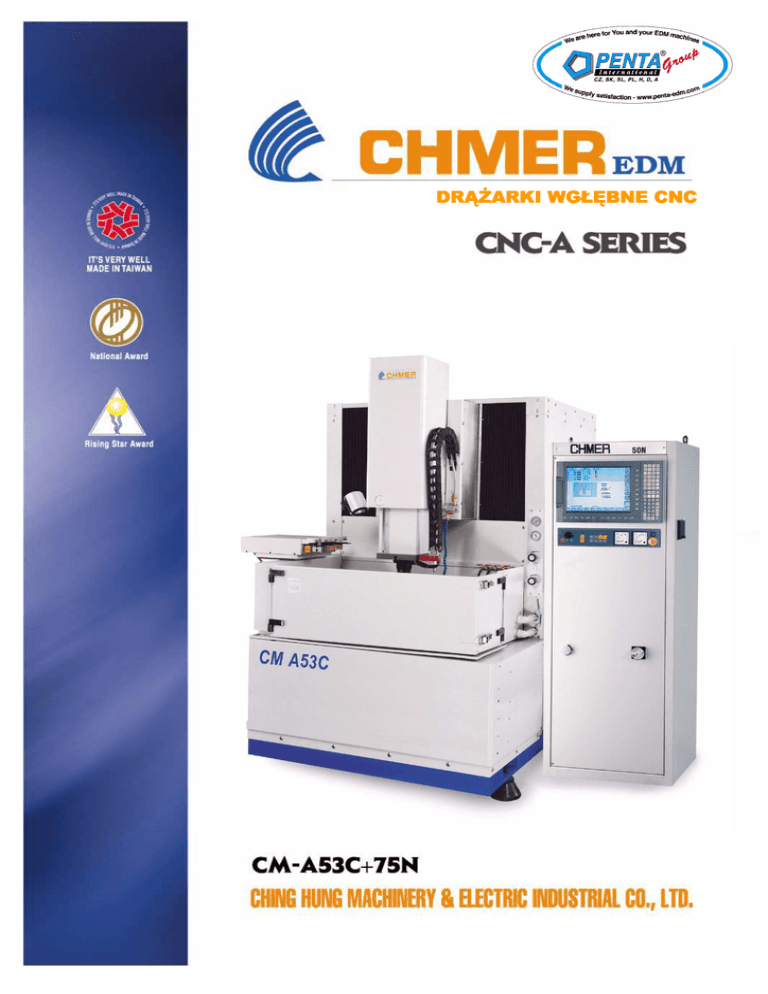 DRĄśARKI WGŁĘBNE CNC Zgodność z CE Stabilna konstrukcja z ruchomą głowicą odpowiednia dla cięŜkich detali Wysokiej klasy cyfrowe liniały optyczne Proste i wygodne programowanie dialogowe w języku polskim Automatyczny dobór parametrów do zadanej elektrody, materiału i chropowatości CE Dane techniczne Typ Przesuw w osi X Przesuw w osi Y Przesuw w osi Z Wielkość stołu Wielkość wanny Wysokość wanny Odległość stół-głowica Masa detalu max (kg) Masa elektrody max (kg) Wymiary urządzenia Wysokość urządzenia Masa urządzenia (kg) Seria A – konstrukcja zwarta „COMPACT” CM-A43C CM-A53C CM-A64C 350 500 600 250 300 400 350 350 350 550x400 600x400 800x500 1100x640 1100x600 1420x740 400 400 450 200-600 200-550 300-650 1000 1000 1500 60 100 100 1 750x1650 1 830x1650 2 100x2 000 2 280 2 280 2 290 2 150 kg 2 200 kg 3 000 kg Generator Typ Prąd maks. (A) Przyłącze (kVA) Maks. szybkość drąŜenia ZuŜycie elektrody Najlepsza gładkość Wymiary CięŜar (kg) 50N 50 4 350 mm3/min 0,2 % 0,45 /0,2 Ra zintegrowany z urzadz. zintegrowany z urzadz. 75N 75 5 550 mm3/min 0,2 % 045 / 0,2 Ra zintegrowany z urzadz. zintegrowany z urzadz. Zespół dielektryka Typ Pojemność ( l ) Filtry Wymiary CięŜar (kg) DA43 440 Papierowe zintegrowany z urzadz. zintegrowany z urzadz. DA53 480 Papierowe zintegrowany z urzadz. zintegrowany z urzadz. DA64 850 Papierowe zintegrowany z urzadz. zintegrowany z urzadz. Układ sterowania CNC Komputer Wprowadzanie danych Monitor Procesor Osie sterowane Rozdzielczość Maks. wartość Interpolacja Jednostki Pamięć technolog. Pamięć erodowania Przemysłowy PC klawiatura, RS-232C, dyskietka 3,5“ 15“ kolorowy LCD 32 bit, 1CPU X, Y, Z, 0,0001 mm ±9999,999 mm liniowa 3D, kołowa 2D, spiralna 3D, cykle planetarne mm / cale 99 999 WyposaŜenie Standardowe WyposaŜenie opcjonalne Filtry papierowe Zest. do mocowania detalu Skrzynka z narzędziami Dysze natryskowe Gaśnica System mocujący Sterowana Oś - C Stopy pod urządz. Zacisk Uchwyt elektrod Lampa halogenowa Stół magnetyczny Chłodnica dielektryka Magazyn elektrod PENTA Polska Sp. z o.o. Tel. 071- 7805277 ul. Powstańców Śl. 82/44 FAX: 071 - 3672708 Biuro: ul. Powstańców Śl. 20 53-333 Wrocław E-mail: [email protected] www.penta-polska.com