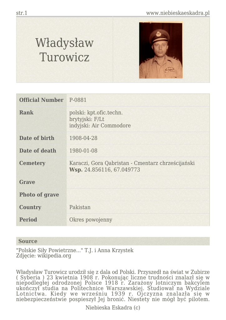 str.1 www.niebieskaeskadra.pl Władysław Turowicz Official Number P-0881 Rank polski: kpt.ofic.techn. brytyjski: F/Lt indyjski: Air Commodore Date of birth 1908-04-28 Date of death 1980-01-08 Cemetery Karaczi, Gora Qabristan - Cmentarz chrześcijański Wsp. 24.856116, 67.049773 Grave Photo of grave Country Pakistan Period Okres powojenny Source "Polskie Siły Powietrzne..." T.J. i Anna Krzystek Zdjęcie: wikipedia.org Władysław Turowicz urodził się z dala od Polski. Przyszedł na świat w Zubirze ( Syberia ) 23 kwietnia 1908 r. Pokonując liczne trudności znalazł się w niepodległej odrodzonej Polsce 1918 r. Zarażony lotniczym bakcylem ukończył studia na Politechnice Warszawskiej. Studiował na Wydziale Lotnictwa. Kiedy we wrześniu 1939 r. Ojczyzna znalazła się w niebezpieczeństwie pospieszył Jej bronić. Niestety nie mógł być pilotem. Niebieska Eskadra (c) str.2 www.niebieskaeskadra.pl Przeszkodą był slaby wzrok. Co nie przeszkadzało żeby pozostawał jako rezerwistą między rycerzami biało ? czerwonej szachownicy. Kiedy Polska padła zaatakowana przez wojska III Rzeszy i Armię Czerwoną nie odszedł od swoich fascynacji dla spadkobierców Ikara. Nie odrzucił ich również gdy padła Francja. Znalazł się w Wielkiej Brytanii. Tam na Wyspie Ostatniej Nadziei znalazł dla siebie miejsce. Pracował w brytyjskim lotnictwie spożytkowując swoją techniczną wiedzę. Do nowej tej wyzwolonej Polski w 1945 r. nie wrócił. Zdawał sobie sprawę z tego co go czeka. Doświadczył również rozczarowania jak z kolegami w powojennej Europie zaczynali postępowa nie tak dawni Brytyjscy sojusznicy. Skorzystał z okazji. Udał się do Pakistanu. Razem z nim wyruszyła 30 osobowa grupa techników i oficerów polskiego lotnictwa. To oni pod koniec 1948 i na początku 1949 r. organizowali i szkolili przez blisko dwadzieścia lat kadry dla Pakistańskich Sił Powietrznych. Początkowo prowadził szkolenie techniczne na terenie bazy lotniczej w Karaczi a następnie w Peszawarze. W swojej pionierskiej pracy pomagała żona. Pani Zofia był instruktorką szybownictwa Pakistańskich Sił Powietrznych. Swoje umiejętności lotnicze zdobyła w Polsce przed wybuchem II wojny światowej. Wykorzystała te już wcześniej pod niebem Polski w kampanii wrześniowej. Gdy wiek, zdrowie nie pozwoliło na latanie została nauczycielką w szkole w Karaczi. Jej mąż w wieku 44 lat objął dowodzenie jednej z baz Pakistańskich Sił Powietrznych. Po jednym z awansów na swojej lotniczej drodze został zastępcy dowódcy Sztabu Sił Powietrznych do spraw szkolenia. W 1967 r. przeszedł na zasłużoną emeryturę. Na tej nie przerwał swoich kontaktów z lotnictwem. Zapomniany w Polsce zmarł w Karaczi 8 stycznia 1980 r. w stopniu generała Pakistańskich Sił Powietrznych. Tu również został pochowany. Konrad Rydołowski Niebieska Eskadra (c)