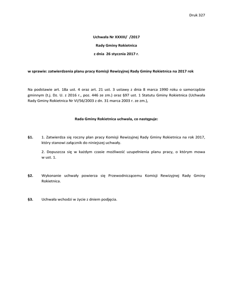 Druk 327 Uchwała Nr XXXIII/ /2017 Rady Gminy Rokietnica z dnia 26 stycznia 2017 r. w sprawie: zatwierdzenia planu pracy Komisji Rewizyjnej Rady Gminy Rokietnica na 2017 rok Na podstawie art. 18a ust. 4 oraz art. 21 ust. 3 ustawy z dnia 8 marca 1990 roku o samorządzie gminnym (t.j. Dz. U. z 2016 r., poz. 446 ze zm.) oraz §97 ust. 1 Statutu Gminy Rokietnica (Uchwała Rady Gminy Rokietnica Nr VI/56/2003 z dn. 31 marca 2003 r. ze zm.), Rada Gminy Rokietnica uchwala, co następuje: §1. 1. Zatwierdza się roczny plan pracy Komisji Rewizyjnej Rady Gminy Rokietnica na rok 2017, który stanowi załącznik do niniejszej uchwały. 2. Dopuszcza się w każdym czasie możliwość uzupełnienia planu pracy, o którym mowa w ust. 1. §2. Wykonanie uchwały powierza się Przewodniczącemu Komisji Rewizyjnej Rady Gminy Rokietnica. §3. Uchwała wchodzi w życie z dniem podjęcia. Druk 327 UZASADNIENIE do Uchwały Nr XXXIII/ /2017 Rady Gminy Rokietnica z dnia 26 stycznia 2017 r. w sprawie: zatwierdzenia planu pracy Komisji Rewizyjnej Rady Gminy Rokietnica na 2017 rok Zgodnie z zapisami par. 97 ust. 1 Statutu Gminy Rokietnica Komisja Rewizyjna jest zobowiązana do przedłożenia Radzie Gminy planu pracy do zatwierdzenia na pierwszej sesji zwyczajnej w danym roku kalendarzowym. Wobec powyższego podjęcie niniejszej uchwały jest uzasadnione. Projekt sporządził: Arkadiusz Chołżyński Druk 327 Załącznik Do Uchwały Nr XXXIII/ /2017 Rady Gminy Rokietnica z dnia 26 stycznia 2017 r. PLAN PRACY KOMISJI REWIZYJNEJ RADY GMINY ROKIETNICA NA ROK 2017 Lp. Miesiąc 1 styczeń 2 luty 3 marzec 4 kwiecień 5 maj 6 czerwiec 7 lipiec 8 sierpień 9 wrzesień 10 październik 11 listopad 12 grudzień Cały rok Tematyka posiedzeń Rozpatrywanie skarg, wniosków i bieżących spraw.