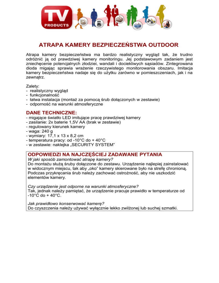 ATRAPA KAMERY BEZPIECZEŃSTWA OUTDOOR Atrapa kamery bezpieczeństwa ma bardzo realistyczny wygląd tak, że trudno odróżnić ją od prawdziwej kamery monitoringu. Jej podstawowym zadaniem jest zniechęcenie potencjalnych złodziei, wandali i dociekliwych sąsiadów. Zintegrowana dioda migając sprawia wrażenie rzeczywistego monitorowania obszaru. Imitacja kamery bezpieczeństwa nadaje się do użytku zarówno w pomieszczeniach, jak i na zewnątrz. Zalety: - realistyczny wygląd - funkcjonalność - łatwa instalacja (montaż za pomocą śrub dołączonych w zestawie) - odporność na warunki atmosferyczne DANE TECHNICZNE: - migające światło LED imitujące pracę prawdziwej kamery - zasilanie: 2x baterie 1,5V AA (brak w zestawie) - regulowany kierunek kamery - waga: 240 g - wymiary: 17,1 x 13 x 8,2 cm - temperatura pracy: od -10°C do + 40°C - w zestawie: naklejka „SECURITY SYSTEM” ODPOWIEDZI NA NAJCZĘŚCIEJ ZADAWANE PYTANIA W jaki sposób zamontować atrapę kamery? Do montażu służą śruby dołączone do zestawu. Urządzenie najlepiej zainstalować w widocznym miejscu, tak aby „oko” kamery skierowane było na strefę chronioną. Podczas przykręcania śrub należy zachować ostrożność, aby nie uszkodzić elementów kamery. Czy urządzenie jest odporne na warunki atmosferyczne? Tak, jednak należy pamiętać, że urządzenie pracuje prawidło w temperaturze od -10°C do + 40°C. Jak prawidłowo konserwować kamerę? Do czyszczenia należy używać wyłącznie lekko zwilżonej lub suchej szmatki.