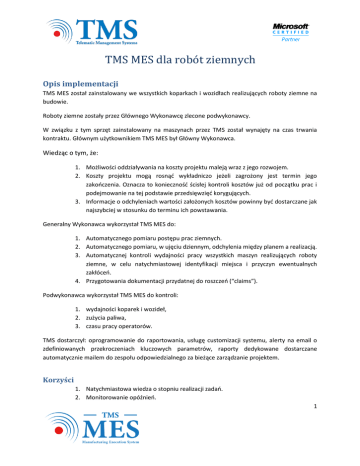 TMS MES dla robót ziemnych Opis implementacji TMS MES został zainstalowany we wszystkich koparkach i wozidłach realizujących roboty ziemne na budowie. Roboty ziemne zostały przez Głównego Wykonawcę zlecone podwykonawcy. W związku z tym sprzęt zainstalowany na maszynach przez TMS został wynajęty na czas trwania kontraktu. Głównym użytkownikiem TMS MES był Główny Wykonawca. Wiedząc o tym, że: 1. Możliwości oddziaływania na koszty projektu maleją wraz z jego rozwojem. 2. Koszty projektu mogą rosnąć wykładniczo jeżeli zagrożony jest termin jego zakończenia. Oznacza to konieczność ścisłej kontroli kosztów już od początku prac i podejmowanie na tej podstawie przedsięwzięć korygujących. 3. Informacje o odchyleniach wartości założonych kosztów powinny być dostarczane jak najszybciej w stosunku do terminu ich powstawania. Generalny Wykonawca wykorzystał TMS MES do: 1. Automatycznego pomiaru postępu prac ziemnych. 2. Automatycznego pomiaru, w ujęciu dziennym, odchylenia między planem a realizacją. 3. Automatycznej kontroli wydajności pracy wszystkich maszyn realizujących roboty ziemne, w celu natychmiastowej identyfikacji miejsca i przyczyn ewentualnych zakłóceń. 4. Przygotowania dokumentacji przydatnej do roszczeń (“claims”). Podwykonawca wykorzystał TMS MES do kontroli: 1. wydajności koparek i wozideł, 2. zużycia paliwa, 3. czasu pracy operatorów. TMS dostarczył: oprogramowanie do raportowania, usługę customizacji systemu, alerty na email o zdefiniowanych przekroczeniach kluczowych parametrów, raporty dedykowane dostarczane automatycznie mailem do zespołu odpowiedzialnego za bieżące zarządzanie projektem. Korzyści 1. Natychmiastowa wiedza o stopniu realizacji zadań. 2. Monitorowanie opóźnień. 1 3. Identyfikacja przyczyn opóźnień: a. Związanych ze spadkiem wydajności pracy maszyn. b. Zakłóceniami w procesie. 4. Akumulacja danych na potrzeby roszczeń (“claims”). 5. Zebranie kluczowych danych do wyceny wartości roszczeń: a. Bezpośrednie koszty eksploatacji maszyn. b. Wiarygodna estymacja czasu opóźnienia oraz kosztu zaangażowania dodatkowych maszyn. 6. Lepsza kontrola podwykonawców. 7. Automatyzacja raportowania. Kluczowe cechy TMS MES dla robót ziemnych: 1. Monitorowanie online postępu prac w obszarach podzielonych na strefy. 2. Automatyczne rozliczenie m3 przewiezionych z każdej strefy w miejsce przeznaczenia w rozbiciu na podwykonawcę, pojazd, strefę i rodzaj materiału. 3. Porównanie m3 przetransportowanych z planem w odniesieniu do każdego podwykonawcy, pojazdu, strefy oraz materiału. 4. Porównanie m3 przetransportowanych ze zmierzonym załadunkiem w rozbiciu na podwykonawców, pojazdy i strefy. 5. Monitorowanie każdego pojazdu w zakresie lokalizacji, przejazdów, czasu jazdy, postojów i pracy na biegu jałowym. 6. Monitorowanie położenia każdej koparki, kontrola m3 materiału załadowanego na pojazd, całkowitego czasu pracy, postojów, pracy na biegu jałowym, zużycia paliwa przez koparki. 7. Przesył alarmów na SMS lub email w razie zaistnienia zdarzeń wykraczających poza zdefiniowane wartości brzegowe, takie jak: Ustalone trasy dla pojazdów ze stref załadunków do stref rozładunków Rozbieżności w ładunku załadowanym przez koparkę a nominalną ładownością wozidła, Nieuzasadniony (dłuższy niż zdefiniowany) bieg jałowy w pojazdach i koparkach. 8. Raporty Managerskie w ujęciu dziennym, tygodniowym, miesięcznym takie jak: Porównanie m3 przetransportowanych z planem - w rozbiciu na podwykonawcę, pojazd, koparkę i strefę. Rozliczenie pracy koparki z uwzględnieniem ładunku, godzin pracy, pracy pod obciążeniem i na biegu jałowym oraz kursów zrealizowanych przez wywrotki. 2