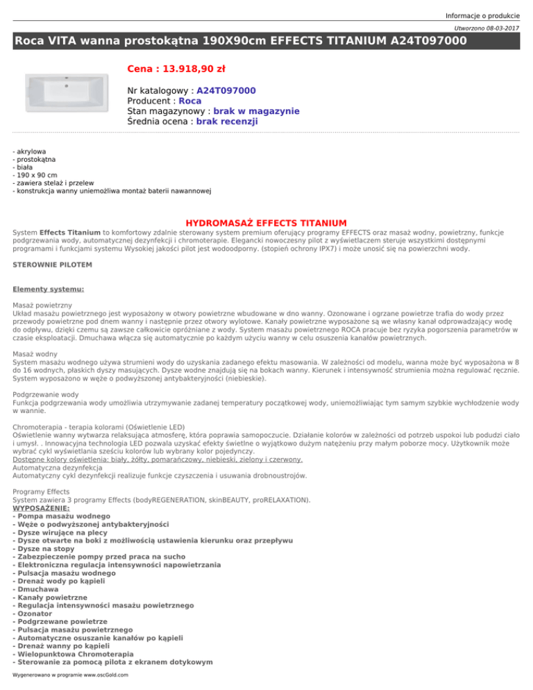 Informacje o produkcie Utworzono 08-03-2017 Roca VITA wanna prostokątna 190X90cm EFFECTS TITANIUM A24T097000 Cena : 13.918,90 zł Nr katalogowy : A24T097000 Producent : Roca Stan magazynowy : brak w magazynie Średnia ocena : brak recenzji - akrylowa - prostokątna - biała - 190 x 90 cm - zawiera stelaż i przelew - konstrukcja wanny uniemożliwa montaż baterii nawannowej HYDROMASAŻ EFFECTS TITANIUM System Effects Titanium to komfortowy zdalnie sterowany system premium oferujący programy EFFECTS oraz masaż wodny, powietrzny, funkcje podgrzewania wody, automatycznej dezynfekcji i chromoterapie. Elegancki nowoczesny pilot z wyświetlaczem steruje wszystkimi dostępnymi programami i funkcjami systemu Wysokiej jakości pilot jest wodoodporny. (stopień ochrony IPX7) i może unosić się na powierzchni wody. STEROWNIE PILOTEM Elementy systemu: Masaż powietrzny Układ masażu powietrznego jest wyposażony w otwory powietrzne wbudowane w dno wanny. Ozonowane i ogrzane powietrze trafia do wody przez przewody powietrzne pod dnem wanny i następnie przez otwory wylotowe. Kanały powietrzne wyposażone są we własny kanał odprowadzający wodę do odpływu, dzięki czemu są zawsze całkowicie opróżniane z wody. System masażu powietrznego ROCA pracuje bez ryzyka pogorszenia parametrów w czasie eksploatacji. Dmuchawa włącza się automatycznie po każdym użyciu wanny w celu osuszenia kanałów powietrznych. Masaż wodny System masażu wodnego używa strumieni wody do uzyskania zadanego efektu masowania. W zależności od modelu, wanna może być wyposażona w 8 do 16 wodnych, płaskich dyszy masujących. Dysze wodne znajdują się na bokach wanny. Kierunek i intensywność strumienia można regulować ręcznie. System wyposażono w węże o podwyższonej antybakteryjności (niebieskie). Podgrzewanie wody Funkcja podgrzewania wody umożliwia utrzymywanie zadanej temperatury początkowej wody, uniemożliwiając tym samym szybkie wychłodzenie wody w wannie. Chromoterapia - terapia kolorami (Oświetlenie LED) Oświetlenie wanny wytwarza relaksująca atmosferę, która poprawia samopoczucie. Działanie kolorów w zależności od potrzeb uspokoi lub podudzi ciało i umysł. . Innowacyjna technologia LED pozwala uzyskać efekty świetlne o wyjątkowo dużym natężeniu przy małym poborze mocy. Użytkownik może wybrać cykl wyświetlania sześciu kolorów lub wybrany kolor pojedynczy. Dostępne kolory oświetlenia: biały, żółty, pomarańczowy, niebieski, zielony i czerwony. Automatyczna dezynfekcja Automatyczny cykl dezynfekcji realizuje funkcje czyszczenia i usuwania drobnoustrojów. Programy Effects System zawiera 3 programy Effects (bodyREGENERATION, skinBEAUTY, proRELAXATION). WYPOSAŻENIE: - Pompa masażu wodnego - Węże o podwyższonej antybakteryjności - Dysze wirujące na plecy - Dysze otwarte na boki z możliwością ustawienia kierunku oraz przepływu - Dysze na stopy - Zabezpieczenie pompy przed praca na sucho - Elektroniczna regulacja intensywności napowietrzania - Pulsacja masażu wodnego - Drenaż wody po kąpieli - Dmuchawa - Kanały powietrzne - Regulacja intensywności masażu powietrznego - Ozonator - Podgrzewane powietrze - Pulsacja masażu powietrznego - Automatyczne osuszanie kanałów po kąpieli - Drenaż wanny po kąpieli - Wielopunktowa Chromoterapia - Sterowanie za pomocą pilota z ekranem dotykowym Wygenerowano w programie www.oscGold.com - Wyłącznik czasowy masażu Podgrzewacz wody Automatyczna dezynfekcja 3 programy Effects 2 programy użytkownika Napełnianie przez dysze Tryb STAND-BY (oszczędność energii, wyłączenie podświetlenia czujników) Funkcja włączania i wyłączania podgrzewacza wody
