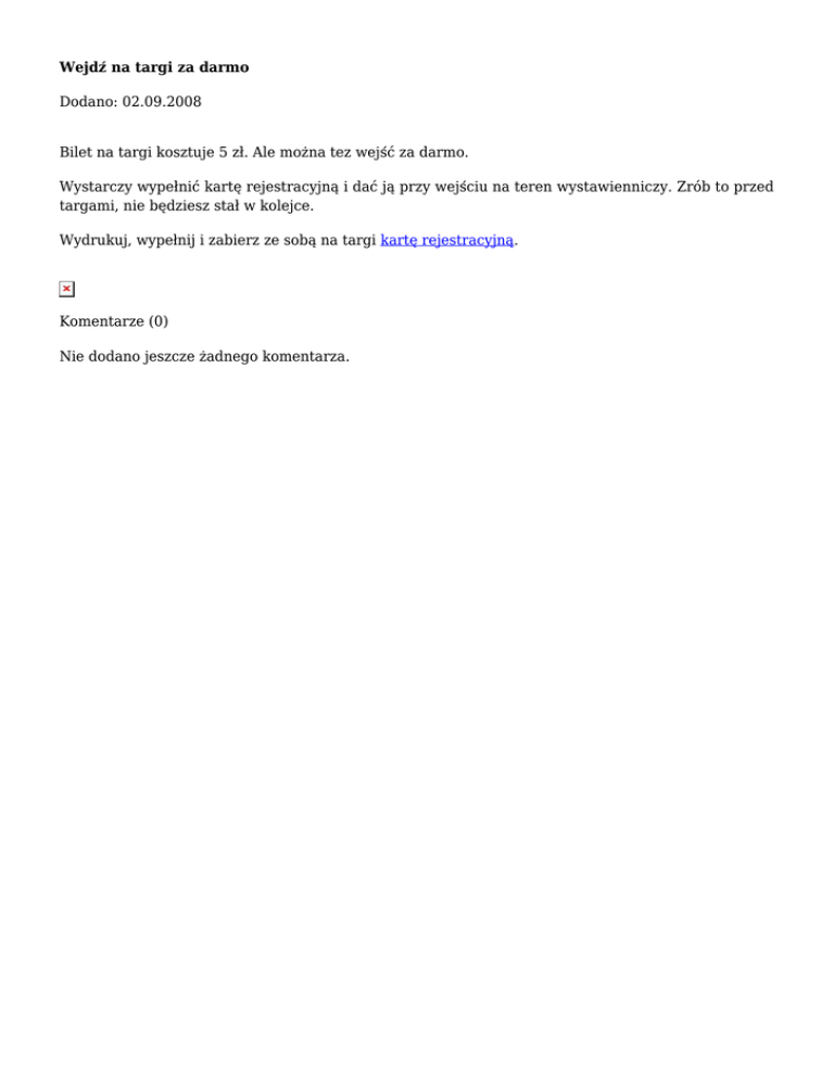 Wejdź na targi za darmo Dodano: 02.09.2008 Bilet na targi kosztuje 5 zł. Ale można tez wejść za darmo. Wystarczy wypełnić kartę rejestracyjną i dać ją przy wejściu na teren wystawienniczy. Zrób to przed targami, nie będziesz stał w kolejce. Wydrukuj, wypełnij i zabierz ze sobą na targi kartę rejestracyjną. Komentarze (0) Nie dodano jeszcze żadnego komentarza.