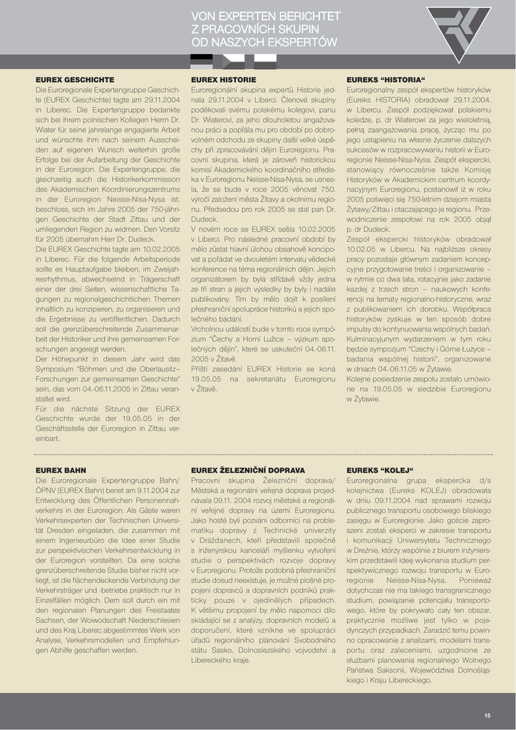 EUREX GESCHICHTE Die Euroregionale Expertengruppe Geschichte (EUREX Geschichte) tagte am 29.11.2004 in Liberec. Die Expertengruppe bedankte sich bei ihrem polnischen Kollegen Herrn Dr. Wiater für seine jahrelange engagierte Arbeit und wünschte ihm nach seinem Ausscheiden auf eigenen Wunsch weiterhin große Erfolge bei der Aufarbeitung der Geschichte in der Euroregion. Die Expertengruppe, die gleichzeitig auch die Historikerkommission des Akademischen Koordinierungszentrums in der Euroregion Neisse-Nisa-Nysa ist, beschloss, sich im Jahre 2005 der 750-jährigen Geschichte der Stadt Zittau und der umliegenden Region zu widmen. Den Vorsitz für 2005 übernahm Herr Dr. Dudeck. Die EUREX Geschichte tagte am 10.02.2005 in Liberec. Für die folgende Arbeitsperiode sollte es Hauptaufgabe bleiben, im Zweijahresrhythmus, abwechselnd in Trägerschaft einer der drei Seiten, wissenschaftliche Tagungen zu regionalgeschichtlichen Themen inhaltlich zu konzipieren, zu organisieren und die Ergebnisse zu veröffentlichen. Dadurch soll die grenzüberschreitende Zusammenarbeit der Historiker und ihre gemeinsamen Forschungen angeregt werden. Der Höhepunkt in diesem Jahr wird das Symposium “Böhmen und die Oberlausitz– Forschungen zur gemeinsamen Geschichte“ sein, das vom 04.-06.11.2005 in Zittau veranstaltet wird. Für die nächste Sitzung der EUREX Geschichte wurde der 19.05.05 in der Geschäftsstelle der Euroregion in Zittau vereinbart. EUREX HISTORIE Euroregionální skupina expertů Historie jednala 29.11.2004 v Liberci. Členové skupiny poděkovali svému polskému kolegovi, panu Dr. Wiaterovi, za jeho dlouholetou angažovanou práci a popřála mu pro období po dobrovolném odchodu ze skupiny další velké úspěchy při zpracovávání dějin Euroregionu. Pracovní skupina, která je zároveň historickou komisí Akademického koordinačního střediska v Euroregionu Neisse-Nisa-Nysa, se usnesla, že se bude v roce 2005 věnovat 750. výročí založení města Žitavy a okolnímu regionu. Předsedou pro rok 2005 se stal pan Dr. Dudeck. V novém roce se EUREX sešla 10.02.2005 v Liberci. Pro následné pracovní období by mělo zůstat hlavní úlohou obsahově koncipovat a pořádat ve dvouletém intervalu vědecké konference na téma regionálních dějin. Jejich organizátorem by byla střídavě vždy jedna ze tří stran a jejich výsledky by byly i nadále publikovány. Tím by mělo dojít k posílení přeshraniční spolupráce historiků a jejich společného bádání. Vrcholnou událostí bude v tomto roce sympózium “Čechy a Horní Lužice – výzkum společných dějin”, které se uskuteční 04.-06.11. 2005 v Žitavě. Příští zasedání EUREX Historie se koná 19.05.05 na sekretariátu Euroregionu v Žitavě. EUREKS “HISTORIA“ Euroregionalny zespół ekspertów historyków (Eureks HISTORIA) obradował 29.11.2004. w Libercu. Zespół podziękował polskiemu koledze, p. dr Wiaterowi za jego wieloletnią, pełną zaangażowania pracę, życząc mu po jego ustąpieniu na własne życzenie dalszych sukcesów w rozpracowywaniu historii w Euroregionie Neisse-Nisa-Nysa. Zespół ekspercki, stanowiący równocześnie także Komisję Historyków w Akademickim centrum koordynacyjnym Euroregionu, postanowił iż w roku 2005 poświęci się 750-letnim dziejom miasta Żytawy/Zittau i otaczającego je regionu. Przewodniczenie zespołowi na rok 2005 objął p. dr Dudeck. Zespół ekspercki historyków obradował 10.02.05 w Libercu. Na najbliższe okresy pracy pozostaje głównym zadaniem koncepcyjne przygotowanie treści i organizowanie – w rytmie co dwa lata, rotacyjnie jako zadanie kazdej z trzech stron – naukowych konferencji na tematy regionalno-historyczne, wraz z publikowaniem ich dorobku. Współpraca historyków zyskuje w ten sposób dobre impulsy do kontynuowania wspólnych badań. Kulminacyjunym wydarzeniem w tym roku będzie sympozjum “Czechy i Górne Łużyce – badania wspólnej historii”, organizowane w dniach 04.-06.11.05 w Żytawie. Kolejne posiedzenie zespołu zostało umówione na 19.05.05 w siedzibie Euroregionu w Żytawie. EUREX BAHN Die Euroregionale Expertengruppe Bahn/ ÖPNV (EUREX Bahn) beriet am 9.11.2004 zur Entwicklung des Öffentlichen Personennahverkehrs in der Euroregion. Als Gäste waren Verkehrsexperten der Technischen Universität Dresden eingeladen, die zusammen mit einem Ingenieurbüro die Idee einer Studie zur perspektivischen Verkehrsentwicklung in der Euroregion vorstellten. Da eine solche grenzüberschreitende Studie bisher nicht vorliegt, ist die flächendeckende Verbindung der Verkehrsträger und -betriebe praktisch nur in Einzelfällen möglich. Dem soll durch ein mit den regionalen Planungen des Freistaates Sachsen, der Woiwodschaft Niederschlesien und des Kraj Liberec abgestimmtes Werk von Analyse, Verkehrsmodellen und Empfehlungen Abhilfe geschaffen werden. EUREX ŽELEZNIČNÍ DOPRAVA Pracovní skupina Železniční doprava/ Městská a regionální veřejná doprava projednávala 09.11. 2004 rozvoj městské a regionální veřejné dopravy na území Euroregionu. Jako hosté byli pozváni odborníci na problematiku dopravy z Technické univerzity v Drážďanech, kteří představili společně s inženýrskou kanceláří myšlenku vytvoření studie o perspektivách rozvoje dopravy v Euroregionu. Protože podobná přeshraniční studie dosud neexistuje, je možné plošné propojení dopravců a dopravních podniků prakticky pouze v ojedinělých případech. K většímu propojení by mělo napomoci dílo skládající se z analýzy, dopravních modelů a doporučení, které vznikne ve spolupráci úřadů regionálního plánování Svobodného státu Sasko, Dolnoslezského vojvodství a Libereckého kraje. EUREKS “KOLEJ“ Euroregionalna grupa ekspercka d/s kolejnictwa (Eureks KOLEJ) obradowała w dniu 09.11.2004 nad sprawami rozwoju publicznego transportu osobowego bliskiego zasięgu w Euroregionie. Jako gości