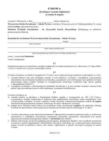 UMOWA określająca warunki odpłatności za studia II stopnia zawarta w Warszawie, w dniu , której stronami są: Warszawska Szkoła Zarządzania – Szkoła Wyższa z siedzibą w Warszawie, przy ul. Siedmiogrodzkiej 3A, zwana dalej Uczelnią, reprezentowana przez: Dziekana Wydziału Zarządzania – dr. Krzysztofa Zaczek Zaczyńskiego działającego na podstawie pełnomocnictwa Rektora, i Kandydat/ka na Studenta Warszawskiej Szkoły Zarządzania – Szkoły Wyższej PESEL: (imię i nazwisko) (adres stałego zameldowania) (adres korespondencyjny jeśli jest inny niż stałego zameldowania) zwany / zwana dalej Studentem o treści następującej: §1 Przedmiotem umowy jest określenie warunków odpłatności za studia na podstawie art. 160a ustawy z 27 lipca 2005r. - Prawo o szkolnictwie wyższym zwanej dalej Ustawą. §2 Uczelnia oświadcza, że spełnia wymagania art. 9 Ustawy oraz wydanych na jego podstawie rozporządzeń, a w tym: 1. warunki kadrowe oraz inne niezbędne warunki, w tym lokalowe i związane z niezbędnym wyposażeniem materialnym, do prowadzenia kształcenia na kierunku „zarządzanie” oraz zobowiązuje się je spełniać do końca planowanego okresu studiów Studenta (z uwzględnieniem możliwego wydłużenia tego okresu zgodnie z „Regulaminem Studiów”), 2. wymagania wynikające z obowiązujących standardów kształcenia, a w tym warunki związane z łączną liczbą godzin zajęć prowadzonych przez osoby spełniające wymagania kwalifikacyjne. §3 Uczelnia oświadcza, że: a) warunki studiów są określone w Regulaminie Studiów zgodnie z wymaganiami art. 160 i 161 Ustawy, a szczegółowe warunki studiowania w kolejnym roku akademickim, zawierające wykaz przedmiotów wraz z liczbą godzin wykładów, ćwiczeń i praktyk, zostały określone w Ramowym programie studiów II stopnia określonym Rozporządzeniem ministra, właściwego do spraw szkolnictwa wyższego. b) podjęte przez Studenta studia kończą się uzyskaniem tytułu zawodowego magistra do nadawania, którego Uczelnia ma uprawnienia i zobowiązuje się je utrzymywać do końca okresu wskazanego w § 2 pkt 1. §4 1. Uczelnia zobowiązuje się do zapewnienia Studentowi odpowiednich warunków pobierania nauki, tj. możliwości uczestnictwa w wykładach, ćwiczeniach, seminariach, lektoratach, egzaminach, zaliczeniach oraz innych zajęciach przewidzianych programem studiów w dwuletnim toku studiów. 2. Student zobowiązuje się do bezwzględnego przestrzegania „Regulaminu Studiów” oraz wszelkich unormowań zawartych w innych regulaminach i dokumentach, decyzjach, uchwałach, etc. wydawanych przez uprawnione organy Uczelni na podstawie ustawy oraz statutu i ogłaszanych w sposób zwyczajowo przyjęty na terenie Uczelni. Strona 1 z 2 §5 1. Z tytułu wykonywania przez Uczelnię świadczeń opisanych w § 4 ust. 1, Student zobowiązuje się do ponoszenia kosztów za każdy rozpoczęty semestr nauki według zasad określonych w „Regulaminie Opłat”, stanowiącym załącznik nr 1 do niniejszej umowy. 2. Szczegółowe warunki, wysokość i terminy opłat czesnego zawarte są w „Zobowiązaniu dotyczącym opłacania czesnego dla Kandydata na Studenta WSZ-SW” (załącznik Nr 2 do umowy) oraz „Regulaminie Opłat”. 3. W każdym kolejnym roku akademickim wysokość czesnego i innych opłat związanych z tokiem studiów podlega zwiększeniu o wskaźnik równy wskaźnikowi wzrostu cen towarów i usług konsumpcyjnych za rok kalendarzowy poprzedzający rok, w którym dokonuje się waloryzacji, ogłoszony przez Prezesa Głównego Urzędu Statystycznego. Pierwszym rokiem waloryzacji jest rok akademicki następujący po pierwszym roku 4. obowiązywania umowy. 5. Uczelnia może dokonać waloryzacji, o której mowa w pkt. 3, o wartość niższą lub od niej odstąpić. 6. Uczelnia informuje studentów o wysokości czesnego i opłat po waloryzacji, w terminie do 30 czerwca, w sposób zwyczajowo przyjęty na terenie Uczelni. 7. Na dzień podpisania umowy czesne oraz pozostałe opłaty związane z tokiem studiów są zwolnione z podatku VAT. W przypadku zmiany przepisów czesne lub dodatkowe opłaty związane z tokiem studiów zostaną powiększone o podatek VAT według obowiązującej stawki. 8. Powyższe opłaty nie obejmują kosztów podręczników oraz kosztów badań profilaktycznych, zakwaterowania, wyżywienia, etc. §6 1. W przypadku pisemnej rezygnacji ze studiów lub skreślenia z listy studentów WSZ-SW czesne podlega zwrotowi w kwocie pozostałej po wykorzystaniu, tj. za przyszłe miesiące nauki od miesiąca następującego po złożeniu rezygnacji bądź skreślenia z listy studentów. 2. Wniesienie opłat nie czyni Studenta udziałowcem lub akcjonariuszem Uczelni, ani nie stanowi o nadaniu Studentowi jakichkolwiek uprawnień kontrolnych wobec Uczelni. 3. Student oświadcza, że zapoznał się z „Regulaminem Studiów” stanowiącym załącznik nr 3 do niniejszej umowy. 4. W razie opóźnienia w zapłacie czesnego przekraczającego jeden miesiąc, Uczelnia ma prawo do rozwiązania umowy, które następuje z końcem nieopłaconego okresu i skreślenia studenta z listy studentów. Rozwiązanie umowy winno zostać poprzedzone pisemnym wezwaniem do zapłaty. §7 1. Wszelka korespondencja pomiędzy stronami w ramach realizacji niniejszej umowy będzie kierowana na adresy stron wskazane w nagłówku umowy. W razie zmiany adresu, strony zobowiązane są do bezzwłocznego wskazania nowego adresu do korespondencji. W przypadku zaniechania powyższego obowiązku korespondencja wysłana do drugiej strony listem poleconym na dotychczasowy adres będzie uznana za doręczoną z upływem 15-go dnia od daty nadania takiego listu. 2. W sprawach nieuregulowanych zastosowanie mają przepisy Kodeksu Cywilnego oraz ustawy Prawo o szkolnictwie wyższym. 3. Umowę sporządzono w dwóch jednobrzmiących egzemplarzach po jednym dla każdej ze stron. 4. Niniejsza umowa zawarta jest z warunkiem zawieszającym poleg