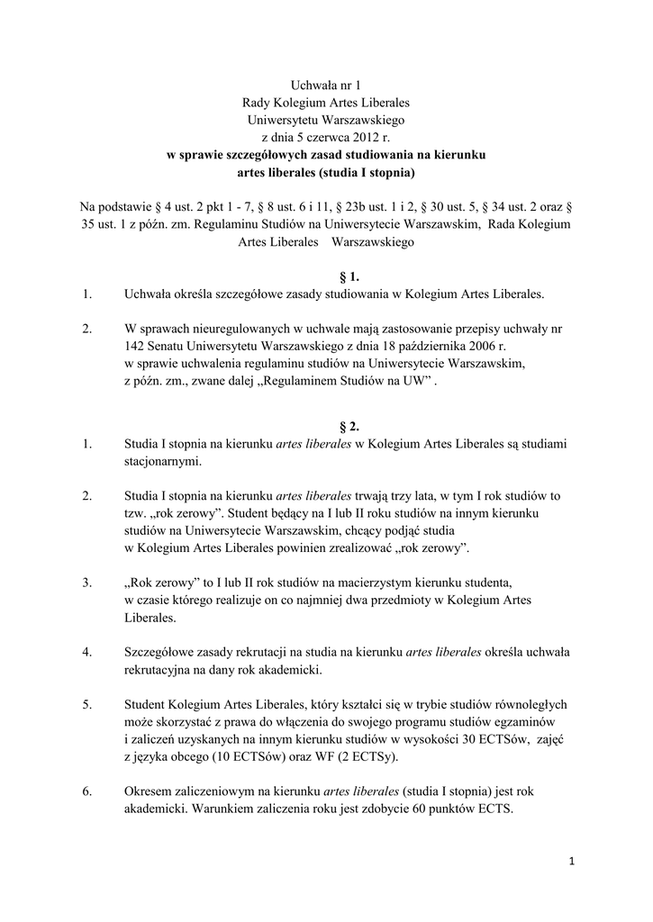 Uchwała nr 1 Rady Kolegium Artes Liberales Uniwersytetu Warszawskiego z dnia 5 czerwca 2012 r. w sprawie szczegółowych zasad studiowania na kierunku artes liberales (studia I stopnia) Na podstawie § 4 ust. 2 pkt 1 - 7, § 8 ust. 6 i 11, § 23b ust. 1 i 2, § 30 ust. 5, § 34 ust. 2 oraz § 35 ust. 1 z późn. zm. Regulaminu Studiów na Uniwersytecie Warszawskim, Rada Kolegium Artes Liberales Warszawskiego 1. 2. 1. § 1. Uchwała określa szczegółowe zasady studiowania w Kolegium Artes Liberales. W sprawach nieuregulowanych w uchwale mają zastosowanie przepisy uchwały nr 142 Senatu Uniwersytetu Warszawskiego z dnia 18 października 2006 r. w sprawie uchwalenia regulaminu studiów na Uniwersytecie Warszawskim, z późn. zm., zwane dalej „Regulaminem Studiów na UW” . § 2. Studia I stopnia na kierunku artes liberales w Kolegium Artes Liberales są studiami stacjonarnymi. 2. Studia I stopnia na kierunku artes liberales trwają trzy lata, w tym I rok studiów to tzw. „rok zerowy”. Student będący na I lub II roku studiów na innym kierunku studiów na Uniwersytecie Warszawskim, chcący podjąć studia w Kolegium Artes Liberales powinien zrealizować „rok zerowy”. 3. „Rok zerowy” to I lub II rok studiów na macierzystym kierunku studenta, w czasie którego realizuje on co najmniej dwa przedmioty w Kolegium Artes Liberales. 4. Szczegółowe zasady rekrutacji na studia na kierunku artes liberales określa uchwała rekrutacyjna na dany rok akademicki. 5. Student Kolegium Artes Liberales, który kształci się w trybie studiów równoległych może skorzystać z prawa do włączenia do swojego programu studiów egzaminów i zaliczeń uzyskanych na innym kierunku studiów w wysokości 30 ECTSów, zajęć z języka obcego (10 ECTSów) oraz WF (2 ECTSy). 6. Okresem zaliczeniowym na kierunku artes liberales (studia I stopnia) jest rok akademicki. Warunkiem zaliczenia roku jest zdobycie 60 punktów ECTS. 1 7. Każdy Student tworzy swój indywidualny plan studiów w każdym semestrze danego roku akademickiego. 8. Warunkiem zaliczenia etapu studiów jest spełnienie wszystkich wymagań przewidzianych planem studiów danego etapu studiów. 9. Student ma prawo do dwóch nieobecności na zajęciach w czasie semestru. Dotyczy to zarówno nieobecności związanych z chorobą, jak i z innych powodów. Trzecia i czwarta nieobecność wymagają indywidualnego zaliczenia zajęć. Większa liczba nieobecności powoduje niezaliczenie zajęć i konieczność ich powtarzania. W szczególnie uzasadnionych wypadkach Kierownik Kolegium Artes Liberales może odstąpić od pobrania opłaty za powtarzanie zajęć. 10. Zaliczenie może mieć formę ustną lub pisemną. Wykładowca ustala formę zaliczenia przedmiotu. W przypadku zaliczenia ma ono miejsce w ostatnim tygodniu zajęć lub w czasie sesji egzaminacyjnej. W przypadku egzaminu wykładowca ustala termin zerowy egzaminu, który musi się odbyć nie później niż w ostatnim tygodniu zajęć. Student, który z egzaminu zerowego otrzymał ocenę niedostateczną, przystępuje do egzaminu bez konsekwencji w zwykłym terminie. 11. Student, który w sesji egzaminacyjnej otrzymał ocenę pozytywną, ma prawo do poprawy oceny w sesji poprawkowej. Jeśli w sesji poprawkowej otrzyma ocenę lepszą od oceny otrzymanej w sesji właściwej, ta ocena brana jest pod uwagę przy zaliczeniu roku. 12. W Kolegium Artes Liberales ustala się limit zajęć ponadplanowych niewymaganych do zaliczenia studiów, za które nie pobiera się opłat, na 30 punktów ECTS. 1. § 3. Student Kolegium Artes Liberales zobowiązany jest do złożenia w sekretariacie Kolegium Artes Liberales dwóch planów semestralnych i jednego planu rocznego. . Plan roczny musi być tak skonstruowany, by: 1) spełniał kryteria wynikające z programu studiów 2) uwzględniał zajęcia o sumarycznej wartości co najmniej 60 ECTS 2. Plany semestralne składa się najpóźniej do końca miesiąca, w którym rozpoczął się dany semestr. Plan roczny składa się najpóźniej do końca października roku akademickiego, którego plan dotyczy. 3. Plany semestralne oraz plan roczny zatwierdza Kierownik Kolegium Artes Liberales. 2 1. 2. 1. § 4. Warunkiem zaliczenia przedmiotu jest uprzednie zapisanie się na zajęcia z tego przedmiotu zgodnie z planem studiów i zasadami tych zapisów. Student może skorzystać z prawa do rezygnacji z zaliczenia przedmiotu, złożonej przed rozpoczęciem sesji egzaminacyjnej. § 5. Student, który nie spełnił wszystkich wymagań przewidzianych planem studiów danego etapu studiów, może ubiegać się o przyznanie warunkowego zaliczenia i wpis na kolejny etap studiów jedynie przy braku zaliczenia z jednego przedmiotu (zaliczenie z oceną, egzamin). Powtarzanie zajęć oznacza konieczność wniesienia odpowiedniej opłaty. Opłatę trzeba wnieść nie później niż 7 dni po uzyskaniu zgody Kierownika Kolegium Artes Liberales na wpis warunkowy. Potwierdzenie opłaty należy złożyć w Sekretariacie Kolegium Artes Liberales. 2. Wniosek o warunkowe zaliczenie i wpis na kolejny etap studiów wraz z uzasadnieniem składa się nie później niż 7 dni po zakończeniu egzaminacyjnej sesji poprawkowej semestru letniego. 3. Decyzję o przyznaniu warunkowego zaliczenia i wpisaniu na kolejny etap studiów podejmuje Kierownik Kolegium Artes Liberales. 4. Student może zostać skierowany na powtarzanie etapu studiów. 5. Wniosek o skierowanie na powtarzanie etapu studiów wraz z uzasadnieniem składa się nie później niż 7 dni po zakończeniu egzaminacyjnej sesji poprawkowej semestru letniego. 6. Decyzję o skierowaniu na powtarzanie etapu studiów podejmuje Kierownik Kolegium Artes Liberales biorąc pod uwagę w szczególności braki w realizacji programu. Powtarzanie roku oznacza konieczność wniesienia odpowiedniej opłaty za powtarzanie roku. Opłatę trzeba wnieść nie później niż 7 dni po uzyskaniu zgody Kierownika Kolegium Artes Liberales na powtarzanie roku