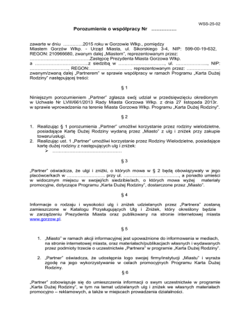 WSS-25-02 Porozumienie o współpracy Nr …………… zawarte w dniu ………….2015 roku w Gorzowie Wlkp., pomiędzy Miastem Gorzów Wlkp. - Urząd Miasta, ul. Sikorskiego 3-4, NIP: 599-00-19-632, REGON: 210966680, zwanym dalej „Miastem”, reprezentowanym przez: …………………………………Zastępcę Prezydenta Miasta Gorzowa Wlkp. a ……………………………..z siedzibą w …………………………, ul. ………………..., NIP: ……………………., REGON:………………………. reprezentowanym przez: …………………. zwanym/zwaną dalej „Partnerem” w sprawie współpracy w ramach Programu „Karta Dużej Rodziny” następującej treści: §1 Niniejszym porozumieniem „Partner” zgłasza swój udział w przedsięwzięciu określonym w Uchwale Nr LVIII/661/2013 Rady Miasta Gorzowa Wlkp. z dnia 27 listopada 2013r. w sprawie wprowadzenia na terenie Miasta Gorzowa Wlkp. Programu „Karta Dużej Rodziny". §2 1. Realizując § 1 porozumienia „Partner” umożliwi korzystanie przez rodziny wielodzietne, posiadające Kartę Dużej Rodziny wydaną przez „Miasto” z ulg i zniżek przy zakupie towaru/usługi. 2. Realizując ust. 1 „Partner” umożliwi korzystanie przez Rodziny Wielodzietne, posiadające kartę dużej rodziny z następujących ulg i zniżek: ……………………………………… §3 „Partner” oświadcza, że ulgi i zniżki, o których mowa w § 2 będą obowiązywały w jego placówce/kach w ……………………. przy ul. ………………………………, a ponadto umieści w widocznym miejscu w swojej/ich siedzibie/ach, o których mowa wyżej materiały promocyjne, dotyczące Programu „Karta Dużej Rodziny”, dostarczone przez „Miasto”. §4 Informacje o rodzaju i wysokości ulg i zniżek udzielanych przez „Partnera” zostaną zamieszczone w Katalogu Przysługujących Ulg i Zniżek, który określony będzie w zarządzeniu Prezydenta Miasta oraz publikowany na stronie internetowej miasta www.gorzow.pl. §5 1. „Miasto” w ramach akcji informacyjnej jest upoważnione do informowania w mediach, na stronie internetowej miasta, oraz materiałach/publikacjach własnych i wydawanych przez podmioty trzecie o uczestnictwie „Partnera” w programie „Karta Dużej Rodziny”. 2. „Partner” oświadcza, że udostępnia logo swojej firmy/instytucji „Miastu” i wyraża zgodę na jego wykorzystywanie w celach promocyjnych Programu Karta Dużej Rodziny. §6 „Partner” zobowiązuje się do umieszczenia informacji o swym uczestnictwie w programie „Karta Dużej Rodziny”, w tym na temat udzielanych ulg i zniżek we własnych materiałach promocyjno – reklamowych, a także w miejscach prowadzenia działalności. §7 Porozumienie zawiera się na czas nieokreślony. §8 Partner zobowiązuje się do finansowania udzielonych ulg i zniżek we własnym zakresie, a z tytułu realizacji postanowień niniejszego porozumienia, strony nie będą kierować wobec siebie żadnych roszczeń finansowych. §9 Zmiana warunków porozumienia wymaga zachowania formy pisemnej pod rygorem nieważności. § 10 Każda ze stron ma prawo rozwiązać porozumienie z zachowaniem 1 miesięcznego okresu wypowiedzenia, poprzez przekazanie drugiej stronie pisemnego oświadczenia o rozwiązaniu porozumienia. § 11 Porozumienie sporządzono w 2 jednobrzmiących egzemplarzach, po jednym dla każdej ze stron. Partner Programu Karta Dużej Rodziny Miasto Gorzów Wlkp.