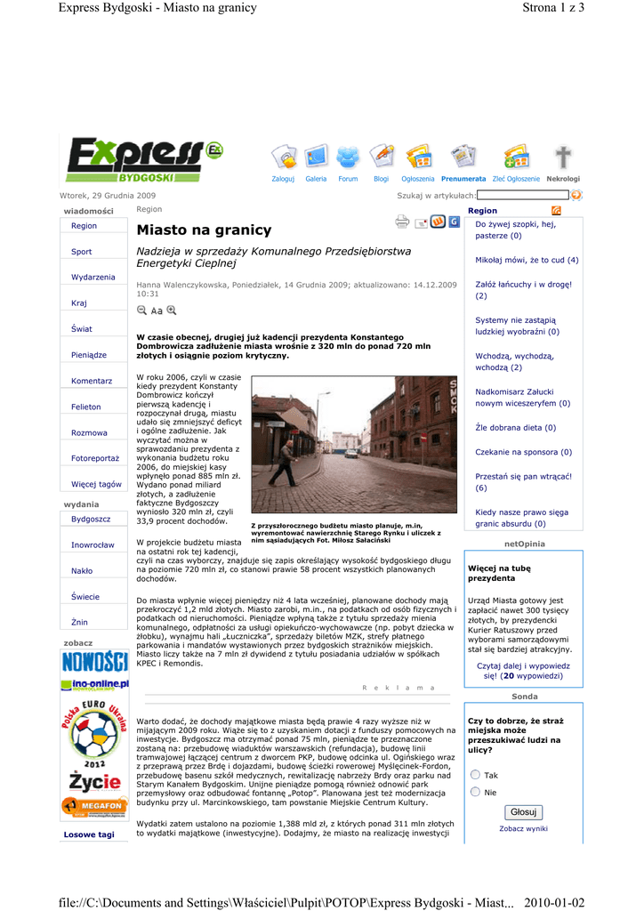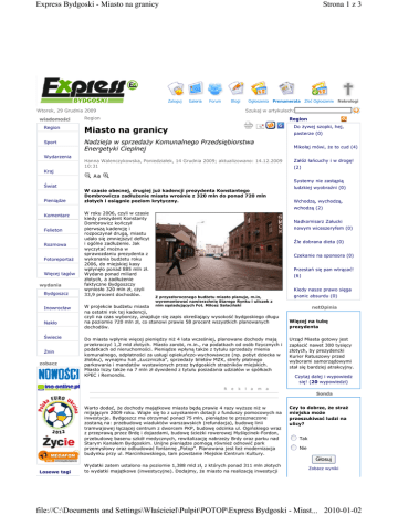 Express Bydgoski - Miasto na granicy Strona 1 z 3 Zaloguj Galeria Forum Blogi Wtorek, 29 Grudnia 2009 wiadomości Ogłoszenia Prenumerata Zleć Ogłoszenie Nekrologi Szukaj w artykułach: Region Region Do Ŝywej szopki, hej, Region Miasto na granicy Sport Nadzieja w sprzedaŜy Komunalnego Przedsiębiorstwa Energetyki Cieplnej Mikołaj mówi, Ŝe to cud (4) Hanna Walenczykowska, Poniedziałek, 14 Grudnia 2009; aktualizowano: 14.12.2009 10:31 ZałóŜ łańcuchy i w drogę! (2) pasterze (0) Wydarzenia Kraj Systemy nie zastąpią Świat Pieniądze Komentarz Felieton Rozmowa FotoreportaŜ Więcej tagów wydania Bydgoszcz Inowrocław Nakło Świecie śnin zobacz W czasie obecnej, drugiej juŜ kadencji prezydenta Konstantego Dombrowicza zadłuŜenie miasta wrośnie z 320 mln do ponad 720 mln złotych i osiągnie poziom krytyczny. W roku 2006, czyli w czasie kiedy prezydent Konstanty Dombrowicz kończył pierwszą kadencję i rozpoczynał drugą, miastu udało się zmniejszyć deficyt i ogólne zadłuŜenie. Jak wyczytać moŜna w sprawozdaniu prezydenta z wykonania budŜetu roku 2006, do miejskiej kasy wpłynęło ponad 885 mln zł. Wydano ponad miliard złotych, a zadłuŜenie faktyczne Bydgoszczy wyniosło 320 mln zł, czyli 33,9 procent dochodów. ludzkiej wyobraźni (0) Wchodzą, wychodzą, wchodzą (2) Nadkomisarz Załucki nowym wiceszeryfem (0) Źle dobrana dieta (0) Czekanie na sponsora (0) Przestań się pan wtrącać! (6) Kiedy nasze prawo sięga Z przyszłorocznego budŜetu miasto planuje, m.in, wyremontować nawierzchnię Starego Rynku i uliczek z nim sąsiadujących Fot. Miłosz Sałaciński W projekcie budŜetu miasta na ostatni rok tej kadencji, czyli na czas wyborczy, znajduje się zapis określający wysokość bydgoskiego długu na poziomie 720 mln zł, co stanowi prawie 58 procent wszystkich planowanych dochodów. Do miasta wpłynie więcej pieniędzy niŜ 4 lata wcześniej, planowane dochody mają przekroczyć 1,2 mld złotych. Miasto zarobi, m.in., na podatkach od osób fizycznych i podatkach od nieruchomości. Pieniądze wpłyną takŜe z tytułu sprzedaŜy mienia komunalnego, odpłatności za usługi opiekuńczo-wychowawcze (np. pobyt dziecka w Ŝłobku), wynajmu hali „Łuczniczka”, sprzedaŜy biletów MZK, strefy płatnego parkowania i mandatów wystawionych przez bydgoskich straŜników miejskich. Miasto liczy takŜe na 7 mln zł dywidend z tytułu posiadania udziałów w spółkach KPEC i Remondis. R e k l a m granic absurdu (0) netOpinia Więcej na tubę prezydenta Urząd Miasta gotowy jest zapłacić nawet 300 tysięcy złotych, by prezydencki Kurier Ratuszowy przed wyborami samorządowymi stał się bardziej atrakcyjny. Czytaj dalej i wypowiedz się! (20 wypowiedzi) a Sonda Warto dodać, Ŝe dochody majątkowe miasta będą prawie 4 razy wyŜsze niŜ w mijającym 2009 roku. WiąŜe się to z uzyskaniem dotacji z funduszy pomocowych na inwestycje. Bydgoszcz ma otrzymać ponad 75 mln, pieniądze te przeznaczone zostaną na: przebudowę wiaduktów warszawskich (refundacja), budowę linii tramwajowej łączącej centrum z dworcem PKP, budowę odcinka ul. Ogińskiego wraz z przeprawą przez Brdę i dojazdami, budowę ścieŜki rowerowej Myślęcinek-Fordon, przebudowę basenu szkół medycznych, rewitalizację nabrzeŜy Brdy oraz parku nad Starym Kanałem Bydgoskim. Unijne pieniądze pomogą równieŜ odnowić park przemysłowy oraz odbudować fontannę „Potop”. Planowana jest teŜ modernizacja budynku przy ul. Marcinkowskiego, tam powstanie Miejskie Centrum Kultury. Czy to dobrze, Ŝe straŜ miejska moŜe przeszukiwać ludzi na ulicy? Tak Nie Głosuj Losowe tagi Wydatki zatem ustalono na poziomie 1,388 mld zł, z których ponad 311 mln złotych to wydatki majątkowe (inwestycyjne). Dodajmy, Ŝe miasto na realizację inwestycji Zobacz wyniki file://C:\Documents and Settings\Właściciel\Pulpit\POTOP\Express Bydgoski - Miast... 2010-01-02 Express Bydgoski - Miasto na granicy Macierzyństwo Ocean Strona 2 z 3 przeznaczyło rekordową kwotę 237 mln, a za resztę (ok. 68 mln) zamierza nabyć akcje i udziały. Komentarze [11] Atmosfera Bezdomni Studia Wojna Gądecz Anime Cyrk - W związku z trudną sytuacją gospodarczą wydatki bieŜące zostały ograniczone do niezbędnego minimum - czytamy w projekcie budŜetu miasta na 2010 r. Podobnie jak w latach minionych, najwięcej pieniędzy miasto przeznaczy na: oświatę (ponad 410 mln zł), transport (324 mln zł), pomoc społeczną (ponad 158 mln zł). Fajerwerki Pedofilia Działki Autostop Urząd Wojewódzki Le parkour Szczury DyŜur eksperta Mrocza Oczywiste jest, Ŝe w przyszłym roku realizowane będą takŜe inne, niefinansowane z funduszy pomocowych zadania. Warto wymienić choćby remonty dróg (15 mln zł) i nakłady na informację turystyczną wraz z promocją miasta w mediach branŜowych (150 tys. zł). Miasto na utrzymanie swojego urzędu wyda ponad 70 mln złotych, a na promocję Bydgoszczy aŜ 11 mln. Bydgoska Rada Miasta pochłonie ponad milion zł, z czego na diety 31 radnych zarezerwowano 887 tys. zł. Balistyka ZagroŜenie Rzemieślnictwo Warzyn Segregacja Samorząd Rumunia Czego w przyszłorocznych planach nie ma? OtóŜ nie uwzględniono potencjalnego dochodu ze sprzedaŜy Komunalnego Przedsiębiorstwa Energetyki Cieplnej. Szacuje się, Ŝe miasto moŜe dostać za tę spółkę od 230 do 300 mln zł. W dokumencie tym nie ma teŜ deklaracji dotyczącej budowy kina w Fordonie oraz szybkiego rozpoczęcia budowy aquaparku. Pływanie w płetwach Mistrzostwa Świata Indie Mimo to, w ostatnim roku tej kadencji realizowanych inwestycji będzie tak duŜo, Ŝe co jakiś czas będzie moŜna tryumfalnie przecinać wstęgi. Słupy Czernikowo Dragacz Ekstraliga Juwenalia Skauci PoŜyczki Zdaniem radnych. BudŜet Bydgoszczy na 2010 rok BudŜet jest dobry i podoba mi się to, Ŝe prezydent znalazł oszczędności tam, gdzie powinien, czyli w administracji. Nie ograniczył wydatków na inwestycje. Posiadam raport, z k