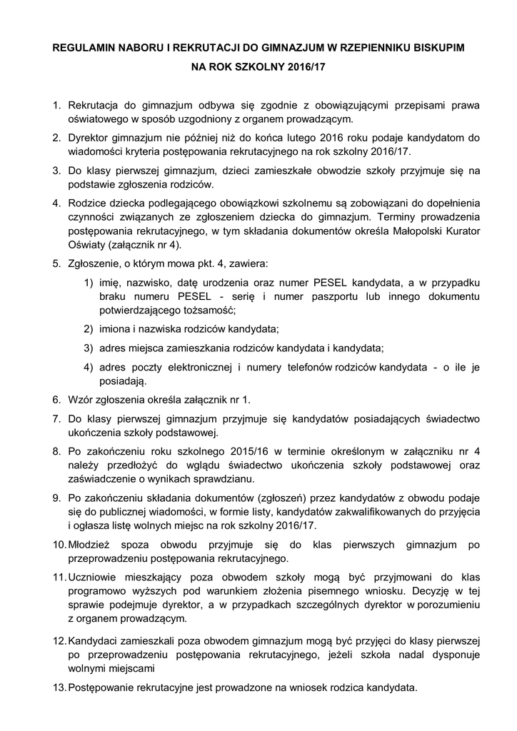 REGULAMIN NABORU I REKRUTACJI DO GIMNAZJUM W RZEPIENNIKU BISKUPIM NA ROK SZKOLNY 2016/17 1. Rekrutacja do gimnazjum odbywa się zgodnie z obowiązującymi przepisami prawa oświatowego w sposób uzgodniony z organem prowadzącym. 2. Dyrektor gimnazjum nie później niż do końca lutego 2016 roku podaje kandydatom do wiadomości kryteria postępowania rekrutacyjnego na rok szkolny 2016/17. 3. Do klasy pierwszej gimnazjum, dzieci zamieszkałe obwodzie szkoły przyjmuje się na podstawie zgłoszenia rodziców. 4. Rodzice dziecka podlegającego obowiązkowi szkolnemu są zobowiązani do dopełnienia czynności związanych ze zgłoszeniem dziecka do gimnazjum. Terminy prowadzenia postępowania rekrutacyjnego, w tym składania dokumentów określa Małopolski Kurator Oświaty (załącznik nr 4). 5. Zgłoszenie, o którym mowa pkt. 4, zawiera: 1) imię, nazwisko, datę urodzenia oraz numer PESEL kandydata, a w przypadku braku numeru PESEL - serię i numer paszportu lub innego dokumentu potwierdzającego tożsamość; 2) imiona i nazwiska rodziców kandydata; 3) adres miejsca zamieszkania rodziców kandydata i kandydata; 4) adres poczty elektronicznej i numery telefonów rodziców kandydata - o ile je posiadają. 6. Wzór zgłoszenia określa załącznik nr 1. 7. Do klasy pierwszej gimnazjum przyjmuje się kandydatów posiadających świadectwo ukończenia szkoły podstawowej. 8. Po zakończeniu roku szkolnego 2015/16 w terminie określonym w załączniku nr 4 należy przedłożyć do wglądu świadectwo ukończenia szkoły podstawowej oraz zaświadczenie o wynikach sprawdzianu. 9. Po zakończeniu składania dokumentów (zgłoszeń) przez kandydatów z obwodu podaje się do publicznej wiadomości, w formie listy, kandydatów zakwalifikowanych do przyjęcia i ogłasza listę wolnych miejsc na rok szkolny 2016/17. 10. Młodzież spoza obwodu przyjmuje się do przeprowadzeniu postępowania rekrutacyjnego. klas pierwszych gimnazjum po 11. Uczniowie mieszkający poza obwodem szkoły mogą być przyjmowani do klas programowo wyższych pod warunkiem złożenia pisemnego wniosku. Decyzję w tej sprawie podejmuje dyrektor, a w przypadkach szczególnych dyrektor w porozumieniu z organem prowadzącym. 12. Kandydaci zamieszkali poza obwodem gimnazjum mogą być przyjęci do klasy pierwszej po przeprowadzeniu postępowania rekrutacyjnego, jeżeli szkoła nadal dysponuje wolnymi miejscami 13. Postępowanie rekrutacyjne jest prowadzone na wniosek rodzica kandydata. 14. Jeżeli przyjęcie ucznia, o którym mowa w pkt. 12, wymaga przeprowadzenia zmian organizacyjnych pracy gimnazjum powodujących dodatkowe skutki finansowe, dyrektor szkoły może przyjąć ucznia po uzyskaniu zgody organu prowadzącego. 15. Wniosek o przyjęcie do gimnazjum składa się do dyrektora szkoły. 16. Wniosek zawiera: 1) imię, nazwisko, datę urodzenia oraz numer PESEL kandydata, a w przypadku braku numeru PESEL - serię i numer paszportu lub innego dokumentu potwierdzającego tożsamość; 2) imiona i nazwiska rodziców kandydata; 3) adres miejsca zamieszkania rodziców i kandydata; 4) adres poczty elektronicznej i numery telefonów rodziców kandydata, o ile je posiadają. 17. Wzór wniosku określa załącznik nr 2. 18. W postępowaniu rekrutacyjnym są brane pod uwagę kryteria określone przez organ prowadzący. 19. Określa się następujące kryteria wraz z liczbą punktów w postępowaniu rekrutacyjnym do klas pierwszych publicznych gimnazjów, dla których organem prowadzącym jest Gmina Rzepiennik Strzyżewski dla kandydatów zamieszkujących poza obwodem gimnazjum: 1) w gimnazjum obowiązek szkolny spełnia rodzeństwo ucznia – 10 pkt. 2) miejsce pracy co najmniej jednego z rodziców znajduje się w obwodzie gimnazjum – 7 pkt. 20. W celu wskazania spełnienie kryterium o którym mowa w pkt. 19 podpunkt 2 rodzice ucznia zobowiązani są dostarczyć oświadczenie dotyczące miejsca zatrudnienia. 21. Wzór oświadczenia określa załącznik nr 3. 22. W postępowaniu rekrutacyjnym brane są ponadto pod uwagę następujące kryteria: 1) wyniki sprawdzianu po klasie szóstej; 2) świadectwo ukończenia szkoły podstawowej z wyróżnieniem; 3) oceny na świadectwie z następujących przedmiotów: język polski, język angielski, historia, matematyka, przyroda; 4) ocena z zachowania; 5) inne osiągnięcia wypisane na świadectwie ukończenia szkoły podstawowej. 23. Spełnienie powyższych kryteriów przelicza się na punkty według następujących zasad: 1) wyniki sprawdzianu po klasie szóstej – wynik przedstawiony w procentach z części pierwszej i wynik przedstawiony w procentach z części drugiej sprawdzianu mnoży się przez 0,2; 2) świadectwo ukończenia szkoły podstawowej z wyróżnieniem – 5 pkt.; 3) za oceny wyrażone w stopniu: a) celującym – przyznaje się po 20 pkt.; b) bardzo dobrym – przyznaje się po 18 pkt.; c) dobrym – przyznaje się po 12 pkt.; d) dostatecznym – przyznaje się po 8 pkt.; e) dopuszczającym – przyznaje się po 2 pkt.; 4) za oceny zachowania: a) wzorowe – przyznaje się 6 pkt.; b) bardzo dobre – przyznaje się 5 pkt.; c) dobre – przyznaje się 4 pkt.; d) poprawne – przyznaje się 3 pkt.; e) nieodpowiednie – przyznaje się 2 pkt.; 5) inne osiągnięcia wypisane na świadectwie ukończenia szkoły podstawowej – 1 pkt. – 5 pkt.; 24. Do wniosku dołącza się; 1) dokumenty potwierdzające spełnianie przez kandydata kryteriów określonych przez organ prowadzący, o których mowa w pkt. 19; 2) świadectwo ukończenia szkoły podstawowej; 3) zaświadczenie o szczegółowych wynikach sprawdzianu. 25. W celu zapewnienia dziecku podczas pobytu w gimnazjum odpowiedniej opieki oraz metod opiekuńczo-wychowawczych rodzic dziecka przekazuje dyrektorowi szkoły uznane przez niego za istotne dane o stanie zdrowia i rozwoju psychofizycznym dziecka. 26. Postępowanie rekrutacyjne do gimnazjum przeprowadza komisja rekrutacyjna powołana przez dyrektora szkoły. Dyrektor wyznac