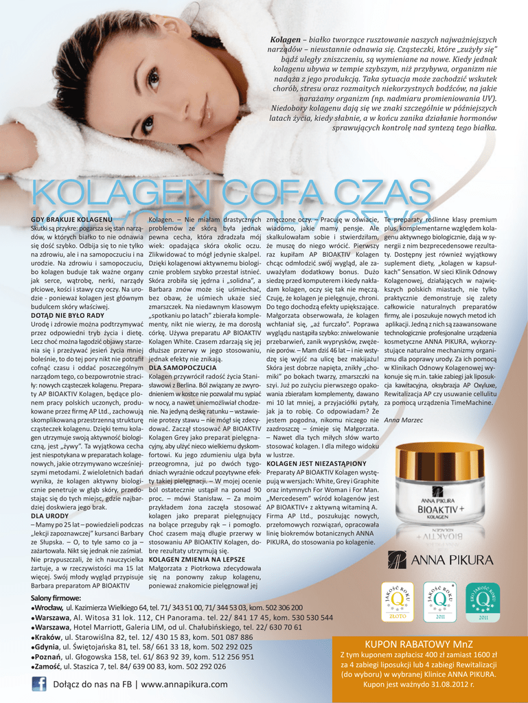 Kolagen – białko tworzące rusztowanie naszych najważniejszych narządów – nieustannie odnawia się. Cząsteczki, które „zużyły się” bądź uległy zniszczeniu, są wymieniane na nowe. Kiedy jednak kolagenu ubywa w tempie szybszym, niż przybywa, organizm nie nadąża z jego produkcją. Taka sytuacja może zachodzić wskutek chorób, stresu oraz rozmaitych niekorzystnych bodźców, na jakie narażamy organizm (np. nadmiaru promieniowania UV). Niedobory kolagenu dają się we znaki szczególnie w późniejszych latach życia, kiedy słabnie, a w końcu zanika działanie hormonów sprawujących kontrolę nad syntezą tego białka. KOLAGEN COFA CZAS GDY BRAKUJE KOLAGENU Skutki są przykre: pogarsza się stan narządów, w których białko to nie odnawia się dość szybko. Odbija się to nie tylko na zdrowiu, ale i na samopoczuciu i na urodzie. Na zdrowiu i samopoczuciu, bo kolagen buduje tak ważne organy jak serce, wątrobę, nerki, narządy płciowe, kości i stawy czy oczy. Na urodzie - ponieważ kolagen jest głównym budulcem skóry właściwej. DOTĄD NIE BYŁO RADY Urodę i zdrowie można podtrzymywać przez odpowiedni tryb życia i dietę. Lecz choć można łagodzić objawy starzenia się i przeżywać jesień życia mniej boleśnie, to do tej pory nikt nie potrafił cofnąć czasu i oddać poszczególnym narządom tego, co bezpowrotnie straciły: nowych cząsteczek kolagenu. Preparaty AP BIOAKTIV Kolagen, będące plonem pracy polskich uczonych, produkowane przez firmę AP Ltd., zachowują skomplikowaną przestrzenną strukturę cząsteczek kolagenu. Dzięki temu kolagen utrzymuje swoją aktywność biologiczną, jest „żywy”. Ta wyjątkowa cecha jest niespotykana w preparatach kolagenowych, jakie otrzymywano wcześniejszymi metodami. Z wieloletnich badań wynika, że kolagen aktywny biologicznie penetruje w głąb skóry, przedostając się do tych miejsc, gdzie najbardziej doskwiera jego brak. DLA URODY – Mamy po 25 lat – powiedzieli podczas „lekcji zapoznawczej” kursanci Barbary ze Słupska. – O, to tyle samo co ja – zażartowała. Nikt się jednak nie zaśmiał. Nie przypuszczali, że ich nauczycielka żartuje, a w rzeczywistości ma 15 lat więcej. Swój młody wygląd przypisuje Barbara preparatom AP BIOAKTIV Kolagen. – Nie miałam drastycznych problemów ze skórą była jednak pewna cecha, która zdradzała mój wiek: opadająca skóra okolic oczu. Zlikwidować to mógł jedynie skalpel. Dzięki kolagenowi aktywnemu biologicznie problem szybko przestał istnieć. Skóra zrobiła się jędrna i „solidna”, a Barbara znów może się uśmiechać, bez obaw, że uśmiech ukaże sieć zmarszczek. Na niedawnym klasowym „spotkaniu po latach” zbierała komplementy, nikt nie wierzy, że ma dorosłą córkę. Używa preparatu AP BIOAKTIV Kolagen White. Czasem zdarzają się jej dłuższe przerwy w jego stosowaniu, jednak efekty nie znikają. DLA SAMOPOCZUCIA Kolagen przywrócił radość życia Stanisławowi z Berlina. Ból związany ze zwyrodnieniem w kostce nie pozwalał mu sypiać w nocy, a nawet uniemożliwiał chodzenie. Na jedyną deskę ratunku – wstawienie protezy stawu – nie mógł się zdecydować. Zaczął stosować AP BIOAKTIV Kolagen Grey jako preparat pielęgnacyjny, aby ulżyć nieco wielkiemu dyskomfortowi. Ku jego zdumieniu ulga była przeogromna, już po dwóch tygodniach wyraźnie odczuł pozytywne efekty takiej pielęgnacji. – W mojej ocenie ból ostatecznie ustąpił na ponad 90 proc. – mówi Stanisław. – Za moim przykładem żona zaczęła stosować kolagen jako preparat pielęgnujący na bolące przeguby rąk – i pomogło. Choć czasem mają długie przerwy w stosowaniu AP BIOAKTIV Kolagen, dobre rezultaty utrzymują się. KOLAGEN ZMIENIA NA LEPSZE Małgorzata z Piotrkowa zdecydowała się na ponowny zakup kolagenu, ponieważ znakomicie pielęgnował jej zmęczone oczy. – Pracuję w oświacie, wiadomo, jakie mamy pensje. Ale skalkulowałam sobie i stwierdziłam, że muszę do niego wrócić. Pierwszy raz kupiłam AP BIOAKTIV Kolagen chcąc odmłodzić swój wygląd, ale zauważyłam dodatkowy bonus. Dużo siedzę przed komputerem i kiedy nakładam kolagen, oczy się tak nie męczą. Czuję, że kolagen je pielęgnuje, chroni. Do tego dochodzą efekty upiększające. Małgorzata obserwowała, że kolagen wchłaniał się, „aż furczało”. Poprawa wyglądu nastąpiła szybko: zniwelowanie przebarwień, zanik wyprysków, zwężenie porów. – Mam dziś 46 lat – i nie wstydzę się wyjść na ulicę bez makijażu! Skóra jest dobrze napięta, znikły „chomiki” po bokach twarzy, zmarszczki na szyi. Już po zużyciu pierwszego opakowania zbierałam komplementy, dawano mi 10 lat mniej, a przyjaciółki pytały, jak ja to robię. Co odpowiadam? Że jestem pogodna, nikomu niczego nie zazdroszczę – śmieje się Małgorzata. – Nawet dla tych miłych słów warto stosować kolagen. I dla miłego widoku w lustrze. KOLAGEN JEST NIEZASTĄPIONY Preparaty AP BIOAKTIV Kolagen występują w wersjach: White, Grey i Graphite oraz intymnych For Woman i For Man. „Mercedesem” wśród kolagenów jest AP BIOAKTIV+ z aktywną witaminą A. Firma AP Ltd., poszukując nowych, przełomowych rozwiązań, opracowała linię biokremów botanicznych ANNA PIKURA, do stosowania po kolagenie. Te preparaty roślinne klasy premium plus, komplementarne względem kolagenu aktywnego biologicznie, dają w synergii z nim bezprecedensowe rezultaty. Dostępny jest również wyjątkowy suplement diety, „kolagen w kapsułkach” Sensation. W sieci Klinik Odnowy Kolagenowej, działających w największych polskich miastach, nie tylko praktycznie demonstruje się zalety całkowicie naturalnych preparatów firmy, ale i poszukuje nowych metod ich aplikacji. Jedną z nich są zaawansowane technologicznie profesjonalne urządzenia kosmetyczne ANNA PIKURA, wykorzystujące naturalne mechanizmy organizmu dla poprawy urody. Za ich pomocą w 