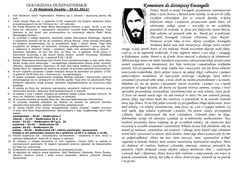 OGŁOSZENIA DUSZPASTERSKIE / IV Niedziela Zwykła - 29.01.2012/ 1. 2. 3. 4. 5. 6. 7. 8. 9. 10. 11. 12. 13. 14. 15. 16. Dziś Światowy Dzień Trędowatych. Módlmy się o zdrowie i skuteczną pomoc dla nich. Także dzisiaj Mszą św. o godzinie 12.00 rozpocznie się kolejne spotkanie dzieci przygotowujących się do I Komunii św. i ich rodziców. We środę Nowenna do Matki Bożej Nieustającej Pomocy o godz. 18.00, a po niej Msza św. wieczorna – zapraszamy wszystkich Czcicieli Matki Najświętszej. Taca zbierana w ten dzień jest przeznaczona na renowację ołtarza Matki Bożej Nieustającej Pomocy. W czwartek 2 lutego będziemy obchodzić święto Ofiarowania Pańskiego. Zgodnie z żydowskim prawem 40 dni po urodzeniu Jezusa Maryja i Józef zanieśli Dzieciątko do świątyni jerozolimskiej, by je przedstawić Bogu i złożyć ofiarę. Tego dnia przyjdźmy do świątyni ze świecami. Zostaną pobłogosławione i przez cały rok, a zwłaszcza w chwilach trwogi i cierpienia, będą nam przypominały o Jezusie – Światłości Narodów. W tym też dniu na Mszy św. o godzinie 16.00 dzieci Ikomunijne otrzymają z rąk swoich ojców świece- symbol Chrystusa- Światłości Świata. Pozostałe Msze św. o godzinie 9.00 i 18.00. Święto Ofiarowania Pańskiego jest Dniem Życia Konsekrowanego, a więc osób, które obrały drogę życia zakonnego – szczególnego naśladowania Jezusa przez czystość, ubóstwo i posłuszeństwo. Ogarnijmy ich tego dnia naszą modlitwą i życzliwością. Po każdej Mszy św. odbędzie się zbiórka do puszek na potrzeby zakonów klauzurowych. W tym tygodniu przypada I piątek miesiąca okazja do spowiedzi od godziny 17.00. O godzinie 18.00 Msza św. z Komunią św. wynagradzającą. W piątek przypada wspomnienie świętego Błażeja, biskupa i męczennika, patrona wstawiającego się za cierpiącymi na choroby gardła. Tego dnia na zakończenie Mszy Świętych będziemy mogli przyjąć specjalne błogosławieństwo za przyczyną tego świętego. W sobotę po Mszy św. porannej zapraszamy wszystkich chętnych do pomocy przy demontażu choinek i dekoracji bożonarodzeniowych w kościele. W sobotę z racji I soboty miesiąca do południa ksiądz Łukasz odwiedzi chorych. Po mszy św. Różaniec Fatimski. Zapraszamy ze świecami. W przyszłą niedzielę po każdej Mszy św. adoracja Najświętszego Sakramentu. W przyszłą niedzielę odbędzie się zbiórka do puszek na pokrycie kosztów ubezpieczenia kościołów, plebanii i budynków gospodarczych. W naszej Parafii trwa wizyta duszpasterska zwana „kolędą”. Kapłan przynosi w nasz dom Boże błogosławieństwo. Skorzystajmy z tego wyjątkowego daru! Plan kolędy: poniedziałek – 30.01 – Nadbrzeżna 2 wtorek – 31.01 – Nadbrzeżna 36 a- e środa – 01.02 – Nadbrzeżna 36 f,g,h, 2A czwartek – 02.02. - Nadbrzeżna 24 piątek– 03.02 – Nadbrzeżna 26 sobota – 04.02 – Nadbrzeżna 28 i rodziny pominięte i opuszczone Kolęda w dni powszedni zaczyna się o godzinie 15.00 a w soboty o 14.00. Parafia organizuje bal charytatywny karnawałowo – ostatkowy w dniu 18.02 u państwa Sadowskich. Koszt 60 zł. Zapisy w zakrystii. W związku z kolędą kancelaria w tym tygodniu czynna tylko w sobotę w wyznaczonych godzinach. W nagłych sprawach prosimy zgłaszać się bezpośrednio po Mszy św. wieczornej. Dziękujemy za przygotowanie kościoła do dzisiejszej liturgii. W agendzie do nabycia prasa katolicka: Gość Niedzielny, Niedziela, Pismo Święte, albumy, różańce, znicze i wiele innych artykułów, albumy „Kościoły Diecezji Świdnickiej”. Komentarz do dzisiejszej Ewangelii Święty Marek w swojej Ewangelii przedstawia systematycznie fakty z życia Jezusa, z których jasno wynika, że nie jest On tylko zwykłym człowiekiem. Jest to zwięzła kronika, w której lakoniczne relacje z wydarzeń, przytaczanie opinii ludzi, ich zdziwienia, reakcji, pytań – wszystko to ma czytelnika prowadzić do wniosku, że Jezus jest faktycznie Synem Bożym. Taki właśnie cel postawił sobie św. Marek już w podtytule: „Początek Ewangelii o Jezusie Chrystusie, Synu Bożym”. Ponieważ w tym roku, w tzw. okresie zwykłym, Ewangelia Markowa będzie nam stale towarzyszyć, dlatego warto zwrócić uwagę, w jaki sposób Autor cel ten realizuje. Przede wszystkim ukazuje suche fakty, czyli to, co się naprawdę wydarzyło. A więc najpierw miejsce i czas akcji – synagoga w Kafarnaum, szabat. Potem co się działo: Jezus nauczał, a słuchacze się zdumiewali. Albowiem jego mowa nie miała charakteru wyuczonej i odtwarzanej lekcji, przytaczania swoich wyjaśnień czy interpretacji, lecz była twórczym i samodzielnym wykładem prawdy. Kto przypomina sobie swoje szkolne lata i nauczycieli, wie jak łatwo odróżnić nauczyciela-rzemieślnika, który jedynie wyuczy się jakiejś lekcji i odtwarza z pamięci podręcznikowe wiadomości, od nauczyciela twórczego i myślącego, który dobrze zrozumiał i przyswoił sobie temat, a teraz dzieli się swoimi przemyśleniami z uczniami. Podobnie też ma się sprawa z kazaniami: można recytować z pamięci czy z kartki przepisane od kogoś kazanie, ale można też kazanie tworzyć samemu, czerpiąc z treści uprzednio przyswojonej, przemyślanej i przetłumaczonej na swój własny, żywy język. A Jezus nie musiał nawet tego: On sam tworzył te treści, On sam stanowił prawdę, prawa, fakty. Jego Słowo miało moc stwórczą: co powiedział, to się stawało. Stawało mocą Jego Słowa. To nie były jakieś sztuczki czy przypadkowe zbiegi okoliczności. Jezus miał władzę, i to władzę autonomiczną, samą przez się, a nie z czyjegoś nadania czy woli ogółu. Jego władza wypływała z prawdy. Na pewno znamy, przynajmniej z filmów, ludzi obdarzonych siłą woli i charakteru. Człowiek jakoś im ulega, dobrowolnie uznaje ich autorytet i poddaje się w dobrowolne posłuszeństwo. Tacy urodzeni przywódcy łatwo wspinają się po szczeblach władzy, ale