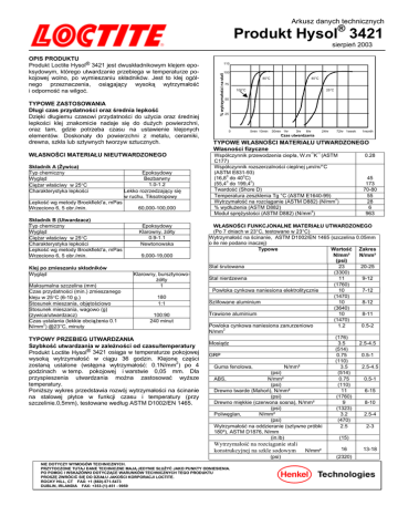 Arkusz danych technicznych Produkt Hysol® 3421 sierpień 2003 TYPOWE ZASTOSOWANIA Długi czas przydatności oraz średnia lepkość Dzięki długiemu czasowi przydatności do użycia oraz średniej lepkości klej znakomicie nadaje się do dużych powierzchni, oraz tam, gdzie potrzeba czasu na ustawienie klejonych elementów. Doskonały do powierzchni z metalu, ceramiki, drewna, szkła lub sztywnych tworzyw sztucznych. WŁASNOŚCI MATERIAŁU NIEUTWARDZONEGO Składnik A (Żywica) Typ chemiczny Wygląd Ciężar właściwy w 25°C Charakterystyka lepkości Lepkość wg metody Brookfield’a, mPas Wrzeciono 6, 5 obr./min. Składnik B (Utwardzacz) Typ chemiczny Wygląd Ciężar właściwy w 25°C Charakterystyka lepkości Lepkość wg metody Brookfield’a, mPas Wrzeciono 6, 5 obr./min. Klej po zmieszaniu składników Wygląd Maksymalna szczelina (mm) Czas przydatności (min.) zmieszanego kleju w 25°C (6-10 g.) Stosunek mieszania, objętościowo Stosunek mieszania, wagowo (g) (żywica/utwardzacz) Czas ustalania (lekkie obciążenia 0.1 2 N/mm ) @23°C, minuty Epoksydowy Bezbarwny 1.0-1.2 Lekko rozrzedzający się w ruchu, Tiksotropowy 60,000-100,000 Epoksydowy Klarowny, żółty 0.9-1.1 Newtonowska 9,000-19,000 Klarowny, bursztynowożółty 1 180 1:1 100:90 240 minut TYPOWY PRZEBIEG UTWARDZANIA Szybkość utwardzania w zależności od czasu/temperatury Produkt Loctite Hysol® 3421 osiąga w temperaturze pokojowej wysoką wytrzymałość w ciągu 36 godzin. Klejone części zostaną ustalone (wstępna wytrzymałość: 0.1N/mm2) po 4 godzinach w temp. pokojowej i warstwie 0,05 mm. Dla przyspieszenia utwardzania można zastosować wyższe temperatury. Poniższy wykres przedstawia rozwój wytrzymałości na ścinanie na stalowej płytce w funkcji czasu i temperatury (przy szczelinie.0,5mm), testowane według ASTM D1002/EN 1465. 110 100 % wytrzymałości na stali OPIS PRODUKTU Produkt Loctite Hysol® 3421 jest dwuskładnikowym klejem epoksydowym, którego utwardzanie przebiega w temperaturze pokojowej wolno, po wymieszaniu składników. Jest to klej ogólnego przeznaczenia, osiągający wysoką wytrzymałość i odporność na wilgoć. 80°C 40°C 75 100°C 25°C 50 25 0 5min 10min 30min 1hr 3hr 6hr 24hr 72hr 1week 1month Czas utwardzania TYPOWE WŁASNOŚCI MATERIAŁU UTWARDZONEGO Własności fizyczne -1 -1 Współczynnik przewodzenia ciepła, W.m K (ASTM C177) Współczynnik rozszerzalności cieplnej µm/m/°C (ASTM E831-93) 0 0 (16,8 do 40 C) 0 0 (55,4 do 199,4 ) Twardość (Shore D) Temperatura zeszklenia Tg °C (ASTM E1640-99) 2 Wytrzymałość na rozciąganie (ASTM D882) (N/mm ) % wydłużenia (ASTM D882) 2 Moduł sprężystości (ASTM D882) (N/mm ) 0.28 45 173 70-80 55 28 6 963 WŁASNOŚCI FUNKCJONALNE MATERIAŁU UTWARDZONEGO (Po 7 dniach w 23°C, testowane w 23°C) Wytrzymałość na ścinanie, ASTM D1002/EN 1465 (szczelina 0.05mm o ile nie podano inaczej) Typowe Wartość Zakres N/mm² N/mm² (psi) Stal śrutowana 23 20-25 (3300) Stal nierdzewna 11 9-12 (1760) Powłoka cynkowa naniesiona elektrolitycznie 10 7-12 (1470) Szlifowane aluminium 10 8-12 (3640) Trawione aluminium 10 8-11 (1470) 1.2 0.5-2 Powloka cynkowa naniesiona zanurzeniowo 2 N/mm (176) Mosiądz 3.5 2.5-4.5 (514) GRP 0.75 0.5-1 (110) Guma fenolowa, N/mm² 3.5 2.5-4.5 (psi) (514) ABS, N/mm² 0.75 0.5-1 (psi) (110) Drewno twarde (Mahoń), N/mm² 11 6-15 (psi) (1760) Drewno miękkie (czerwona sosna), N/mm² 9 8-10 (psi) (1323) Poliwęglan, N/mm² 3.2 2.5-4 (psi) (470) Wytrzymałość na oddzieranie (sztywne próbki 2.5 2-3 180º), ASTM D1876, N/mm (in.lb) (15) Wytrzymałość na rozciąganie stali konstrukcyjnej na szkle sodowym (psi) NIE DOTYCZY WYMOGÓW TECHNICZNYCH. PRZYTOCZONE TUTAJ DANE TECHNICZNE MAJĄ JEDYNIE SŁUŻYĆ JAKO PUNKTY ODNIESIENIA. PO POMOC I WSKAZÓWKI DOTYCZĄCE WARUNKÓW TECHNICZNYCH TEGO PRODUKTU PROSZĘ ZWRÓCIĆ SIĘ DO DZIAŁU JAKOŚCI KORPORACJI LOCTITE. ROCKY HILL, CT FAX: +1 (860)-571-5473 DUBLIN, IRLANDIA FAX: +353-(1)-451 - 9959 N/mm² 16 (2320) 13-18 TDS Hysol®3421 24 sierpień 2003 TYPOWA ODPORNOŚĆ NA ŚRODOWISKO Proces badawczy: ASTM D1002/EN 1465 Materiał: Śrut. stal konstrukc. (szczelina złącza 0.05 mm) Proces utwardzania: 7 dni w 23°C Wytrzymałość na ścinanie stali N/mm2 Wytrzymałość na temperaturę Badane w temperaturze. 35 30 25 20 15 10 5 0 -15 5 25 45 65 85 105 Temperatura °C Temperatura magazynowania 0 Utwardzane przez 5 dni w 22 C bez szczeliny wstępnej, magazynowane w zadanej temperaturze na powietrzu, testowane w 220C. % początkowej wytrzymalości Temperatura 500 godz. 1000 godz. 3000 godz. 100° 125° 150° 113 119 99 119 111 97 128 116 Odporność chemiczna 0 Przechowywany w zadanych warunkach, testowany w 23 C Medium Olej silnikowy Kwas octowy 10% 7.5% NaCl 6.5% H2SO4 Woda Woda Wilg.powietrza 98% Temp. % wytrzymałości początkowej pozostałej po: 100 hr 400 hr 1000 hr 100 100 50 23°C 73 70 60 23°C 100 100 55 23°C 100 100 100 23°C 100 90 90 60°C 75 75 75 90°C 100 100 100 40°C Wytrzymałość na rozciąganie stali konstrukcyjnej na szkle sodowym Wilg.powietrza 98% 40°C 100 100 INFORMACJA OGÓLNA Nie poleca się stosowania tego produktu do urządzeń z czystym tlenem i/lub bogatych w tlen; nie powinien też być używany jako uszczelniacz do instalacji z chlorem i innych materiałów silnie utleniających. Pełna informacja dotycząca bezpiecznego obchodzenia się z tym produktem znajduje się w arkuszu danych bezpieczeństwa (MSDS). Jeśli do czyszczenia powierzchni przed klejeniem stosuje się wodne urządzenia zmywające, należy koniecznie sprawdzić, czy roztwór wodny jest odpowiedni dla danego kleju. Wskazówki dotyczące stosowania 1. Aby uzyskać jak najlepsze wyniki, należy oczyścić, osuszyć i odtłuścić powierzchnie. Dla uzyskania wysokiej wytrzymałości połączenia klejowego odpowiednie przygotowanie powierzchni może zwiększyć siłę i wytrzymałość połączenia 2. Przed użyciem należy wymieszać żywicę z utwardzaczem na jednoli