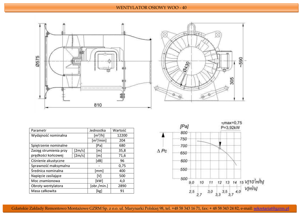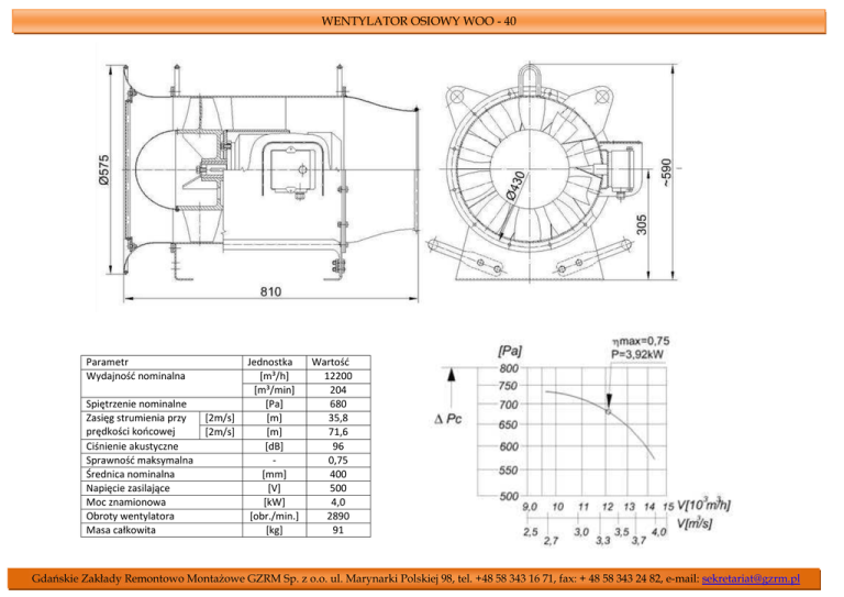 WENTYLATOR OSIOWY WOO - 40 Parametr Wydajność nominalna Spiętrzenie nominalne Zasięg strumienia przy prędkości końcowej Ciśnienie akustyczne Sprawność maksymalna Średnica nominalna Napięcie zasilające Moc znamionowa Obroty wentylatora Masa całkowita [2m/s] [2m/s] Jednostka [m³/h] [m³/min] [Pa] [m] [m] [dB] [mm] [V] [kW] [obr./min.] [kg] Wartość 12200 204 680 35,8 71,6 96 0,75 400 500 4,0 2890 91 Gdańskie Zakłady Remontowo Montażowe GZRM Sp. z o.o. ul. Marynarki Polskiej 98, tel. +48 58 343 16 71, fax: + 48 58 343 24 82, e-mail: [email protected]