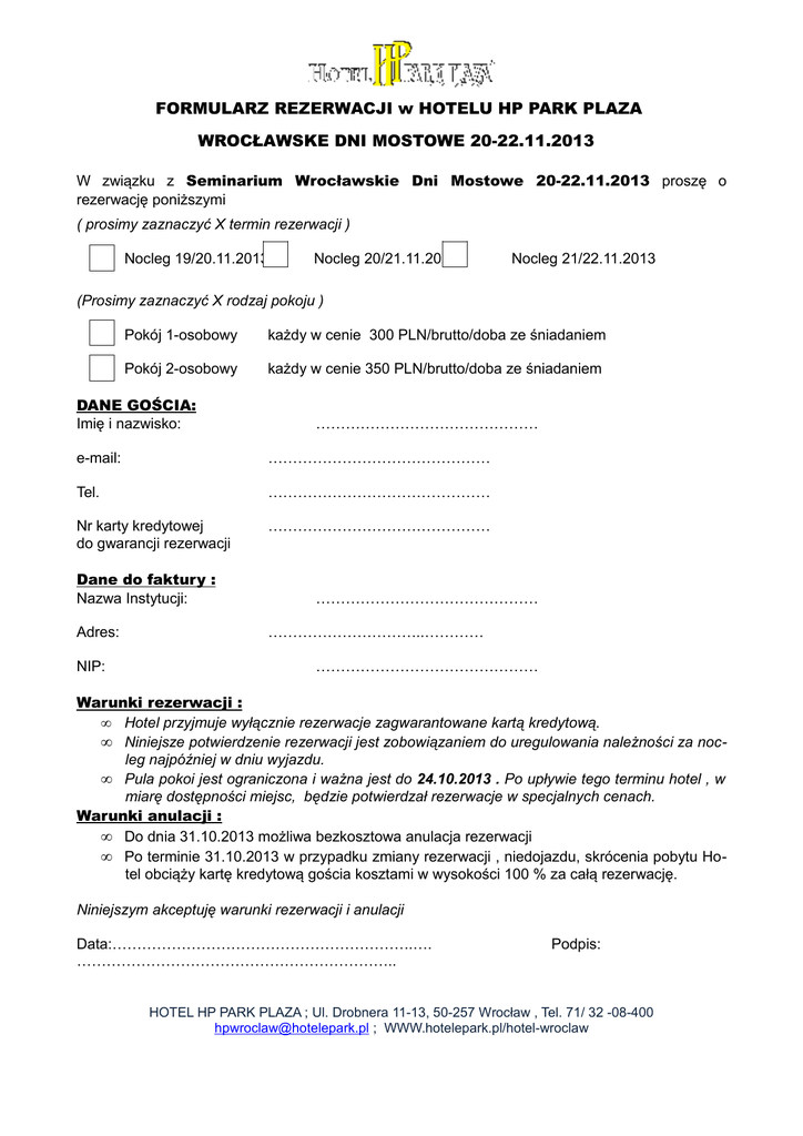 FORMULARZ REZERWACJI w HOTELU HP PARK PLAZA WROCŁAWSKE DNI MOSTOWE 20-22.11.2013 W związku z Seminarium Wrocławskie Dni Mostowe 20-22.11.2013 proszę o rezerwację poniższymi ( prosimy zaznaczyć X termin rezerwacji ) Nocleg 19/20.11.2013 Nocleg 20/21.11.2013 Nocleg 21/22.11.2013 (Prosimy zaznaczyć X rodzaj pokoju ) Pokój 1-osobowy każdy w cenie 300 PLN/brutto/doba ze śniadaniem Pokój 2-osobowy każdy w cenie 350 PLN/brutto/doba ze śniadaniem DANE GOŚCIA: Imię i nazwisko: ……………………………………… e-mail: ……………………………………… Tel. ……………………………………… Nr karty kredytowej do gwarancji rezerwacji ……………………………………… Dane do faktury : Nazwa Instytucji: Adres: NIP: ……………………………………… …………………………..………… ……………………………………… Warunki rezerwacji : • Hotel przyjmuje wyłącznie rezerwacje zagwarantowane kartą kredytową. • Niniejsze potwierdzenie rezerwacji jest zobowiązaniem do uregulowania należności za nocleg najpóźniej w dniu wyjazdu. • Pula pokoi jest ograniczona i ważna jest do 24.10.2013 . Po upływie tego terminu hotel , w miarę dostępności miejsc, będzie potwierdzał rezerwacje w specjalnych cenach. Warunki anulacji : • Do dnia 31.10.2013 możliwa bezkosztowa anulacja rezerwacji • Po terminie 31.10.2013 w przypadku zmiany rezerwacji , niedojazdu, skrócenia pobytu Hotel obciąży kartę kredytową gościa kosztami w wysokości 100 % za całą rezerwację. Niniejszym akceptuję warunki rezerwacji i anulacji Data:…………………………………………………….…. ……………………………………………………….. Podpis: HOTEL HP PARK PLAZA ; Ul. Drobnera 11-13, 50-257 Wrocław , Tel. 71/ 32 -08-400 [email protected] ; WWW.hotelepark.pl/hotel-wroclaw
