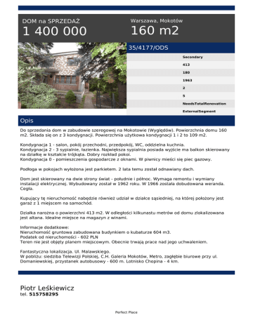 DOM na SPRZEDAŻ 1 400 000 Warszawa, Mokotów 160 m2 35/4177/ODS Secondary 413 180 1963 2 5 NeedsTotalRenovation ExternalSegment Opis Do sprzedania dom w zabudowie szeregowej na Mokotowie (Wyględów). Powierzchnia domu 160 m2. Składa się on z 3 kondygnacji. Powierzchnia użytkowa kondygnacji 1 i 2 to 109 m2. Kondygnacja 1 - salon, pokój przechodni, przedpokój, WC, oddzielna kuchnia. Kondygnacja 2 - 3 sypialnie, łazienka. Największa sypialnia posiada wyjście ma balkon skierowany na działkę w kształcie trójkąta. Dobry rozkład pokoi. Kondygnacja 0 - pomieszczenia gospodarcze z oknami. W piwnicy mieści się piec gazowy. Podłoga w pokojach wyłożona jest parkietem. 2 lata temu został odnawiany dach. Dom jest skierowany na dwie strony świat - południe i północ. Wymaga remontu i wymiany instalacji elektrycznej. Wybudowany został w 1962 roku. W 1966 została dobudowana weranda. Cegła. Kupujący tę nieruchomość nabędzie również udział w działce sąsiedniej, na której położony jest garaż z 1 miejscem na samochód. Działka narożna o powierzchni 413 m2. W odległości kilkunastu metrów od domu zlokalizowana jest altana. Idealne miejsce na magazyn z winami. Informacje dodatkowe: Nieruchomość gruntowa zabudowana budynkiem o kubaturze 604 m3. Podatek od nieruchomości - 602 PLN Teren nie jest objęty planem miejscowym. Obecnie trwają prace nad jego uchwaleniem. Fantastyczna lokalizacja. Ul. Malawskiego. W pobliżu: siedziba Telewizji Polskiej, C.H. Galeria Mokotów, Metro, zagłębie biurowe przy ul. Domaniewskiej, przystanek autobusowy - 600 m. Lotnisko Chopina - 4 km. Piotr Leśkiewicz tel. 515758295 Perfect Place email: [email protected] Perfect Place Powered by TCPDF (www.tcpdf.org)