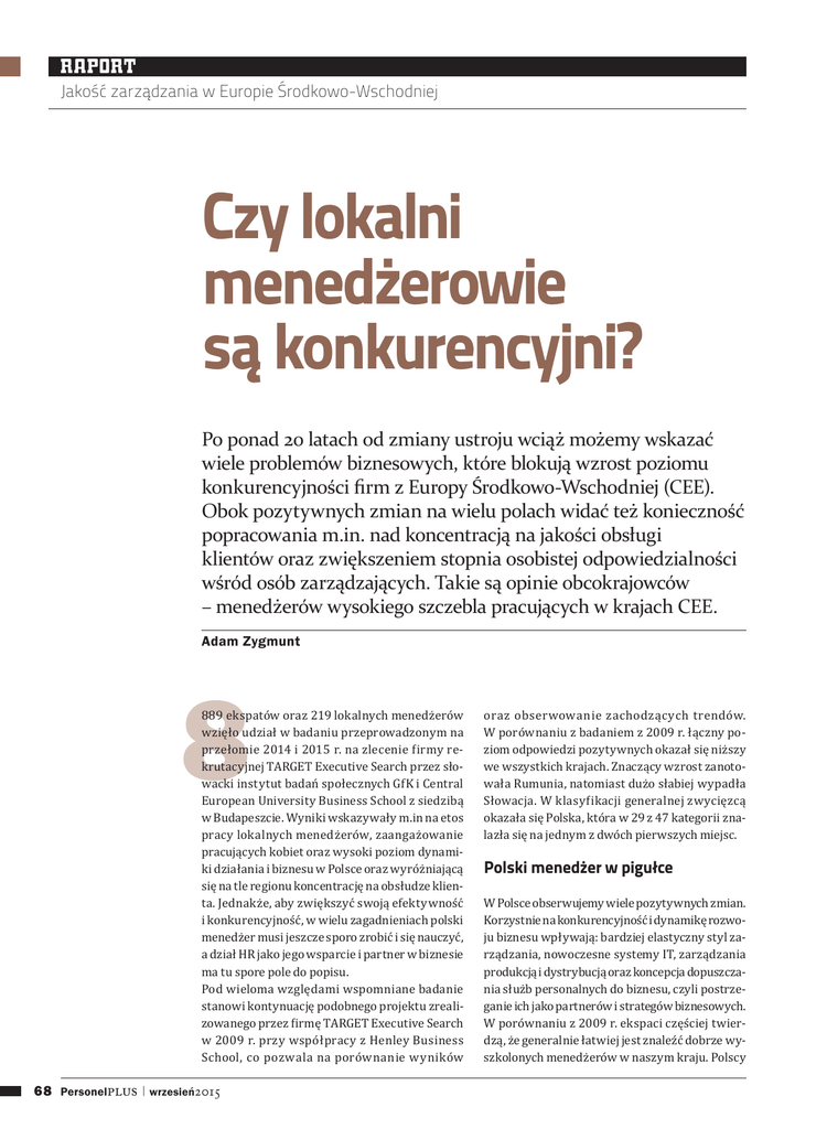 RAPORT Jakość zarządzania w Europie Środkowo-Wschodniej Czy lokalni menedżerowie są konkurencyjni? Po ponad 20 latach od zmiany ustroju wciąż możemy wskazać wiele problemów biznesowych, które blokują wzrost poziomu konkurencyjności firm z Europy Środkowo-Wschodniej (CEE). Obok pozytywnych zmian na wielu polach widać też konieczność popracowania m.in. nad koncentracją na jakości obsługi klientów oraz zwiększeniem stopnia osobistej odpowiedzialności wśród osób zarządzających. Takie są opinie obcokrajowców – menedżerów wysokiego szczebla pracujących w krajach CEE. Adam Zygmunt 8 889 ekspatów oraz 219 lokalnych menedżerów wzięło udział w badaniu przeprowadzonym na przełomie 2014 i 2015 r. na zlecenie irmy rekrutacyjnej TARGET Executive Search przez słowacki instytut badań społecznych GfK i Central European University Business School z siedzibą w Budapeszcie. Wyniki wskazywały m.in na etos pracy lokalnych menedżerów, zaangażowanie pracujących kobiet oraz wysoki poziom dynamiki działania i biznesu w Polsce oraz wyróżniającą się na tle regionu koncentrację na obsłudze klienta. Jednakże, aby zwiększyć swoją efektywność i konkurencyjność, w wielu zagadnieniach polski menedżer musi jeszcze sporo zrobić i się nauczyć, a dział HR jako jego wsparcie i partner w biznesie ma tu spore pole do popisu. Pod wieloma względami wspomniane badanie stanowi kontynuację podobnego projektu zrealizowanego przez irmę TARGET Executive Search w 2009 r. przy współpracy z Henley Business School, co pozwala na porównanie wyników 68 Personelplus | wrzesień2015 oraz obserwowanie zachodzących trendów. W porównaniu z badaniem z 2009 r. łączny poziom odpowiedzi pozytywnych okazał się niższy we wszystkich krajach. Znaczący wzrost zanotowała Rumunia, natomiast dużo słabiej wypadła Słowacja. W klasy ikacji generalnej zwycięzcą okazała się Polska, która w 29 z 47 kategorii znalazła się na jednym z dwóch pierwszych miejsc. Polski menedżer w pigułce W Polsce obserwujemy wiele pozytywnych zmian. Korzystnie na konkurencyjność i dynamikę rozwoju biznesu wpływają: bardziej elastyczny styl zarządzania, nowoczesne systemy IT, zarządzania produkcją i dystrybucją oraz koncepcja dopuszczania służb personalnych do biznesu, czyli postrzeganie ich jako partnerów i strategów biznesowych. W porównaniu z 2009 r. ekspaci częściej twierdzą, że generalnie łatwiej jest znaleźć dobrze wyszkolonych menedżerów w naszym kraju. Polscy menedżerowie ciężko pracują, dostarczając wiele wartości spółkom i ich akcjonariuszom, lubią podejmować inicjatywę w celu uniknięcia i późniejszego rozwiązywania problemów, a terminy biznesowe i harmonogramy są traktowane przez nich w poważny sposób. Poza tym lokalni menedżerowie nie mają kompleksów i nie są urażeni obecnością menedżerów-ekspatów. Potra ią odnaleźć się w międzynarodowym środowisku pracy oraz zaadaptować się do zmian zachodzących na rynku. Jednocześnie więcej ekspatów niż kiedyś zgadza się z tezami, że w Polsce występuje nadal zjawisko „kultury nieefektywnej obecności”, czyli pracy przez długie godziny na pokaz, menedżerowie są mniej skłonni do współpracy i bardziej indywidualistyczni w swoim podejściu do rozwiązywania problemów, środowisko biznesowe jest trochę mniej aktywne i dynamiczne, lokalnym spółkom częściej brakuje klarownej strategii biznesu (patrz wykres: „Posiadanie jasnej strategii biznesowej”). Zdolności interpersonalne są nadal zbyt nisko cenione kosztem kwali ikacji i specjalistycznego doświadczenia, a relacje z klientem zewnętrznym i wewnętrznym nadal opierają się bardziej na relacjach nieformalnych niż na spełnianiu ich faktycznych potrzeb i oczekiwań. Ekspaci słabiej ocenili także aktywność i umiejętności sprzedażowe lokalnych menedżerów (w dobie kryzysu), a kobiety w ich oczach rzadziej wydawały się bardziej ► efektywnymi menedżerami niż mężczyźni na tym samym stanowisku. Jednocześnie potwierdzili, że polskie kobiety nadal są dyskryminowane w obszarze zarobków i możliwości awansu. Relacyjność a rzeczywiste nastawienie na potrzeby klienta Respondenci-obcokrajowcy ponownie podkreślali, że mieszkańcy regionu Europy Centralnej i Wschodniej są na ogół towarzyscy, a nawiązanie osobistych relacji jest istotne w biznesie. Szczególnie widać to w przypadku orientacji proklienckiej, gdy zdaniem obcokrajowców ich lokalni koledzy wyżej stawiają dobre relacje z odbiorcami niż faktyczną koncentrację na ich rzeczywistych potrzebach w prowadzonych działaniach. Niewielu pytanych zgodziło się z twierdzeniem, że biznes i handel są w tych krajach mocno zorientowane na klienta (pogląd taki był wśród najrzadziej wyrażanych w całym badaniu), natomiast przyjazne stosunki z odbiorcami są postrzegane jako kluczowy element sukcesu. Dział HR – poprzez odpowiednią politykę i weryikację szkoleń – mógłby przenieść środek ciężkości na merytoryczne przygotowanie kadry menedżerskiej z obszaru zarządzania profesjonalną sprzedażą i obsługą klienta (również umożliwiających im prowadzenie praktyk szkoleniowych i mentoringowych w stosunku do własnych Posiadanie jasnej strategii biznesowej (w proc.) Reakcje na twierdzenie: „Lokalne spółki zazwyczaj mają jasną strategię biznesową”. 14 %XğJDULD &]HFK\ 1 36 22 5 5XPXQLD 5 3 6ğRZDFMD 0 28 29 3ROVND 13 33 3 :ĎJU\ 32 36 22 28 22 10 20 30 ²1LH]JDG]DPVLĎZSURF 26 36 40 2 27 50 3 60 4 70 5 1 9 1 6 23 40 1 15 21 39 5 3 7 1 7 1 80 90 100 ²=JDG]DPVLĎZSURF ■ Źródło | raport Konkurencyjność menedżerów z Europy Środkowo-Wschodniej. Opinie 1108 menedżerów lokalnych i ekspatów na temat kultury zarządzania w Bułgarii, Czechach, na Węgrzech, w Polsce, w Rumunii i na Słowacji. Aktualizacja badania z 2009 r., TARGET Executive Search, Gfk, CEU Business School, 2015. wrzesień2015 | Pe