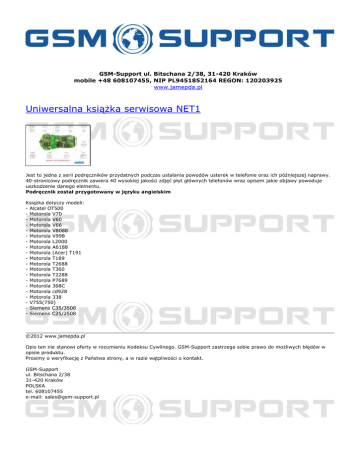 GSM-Support ul. Bitschana 2/38, 31-420 Kraków mobile +48 608107455, NIP PL9451852164 REGON: 120203925 www.jamepda.pl Uniwersalna książka serwisowa NET1 Jest to jedna z serii podręczników przydatnych podczas ustalania powodów usterek w telefonie oraz ich późniejszej naprawy. 40-stronicowy podręcznik zawiera 40 wysokiej jakości zdjęć płyt głównych telefonów wraz opisem jakie objawy powoduje uszkodzenie danego elementu. Podręcznik został przygotowany w języku angielskim Książka dotyczy modeli: - Alcatel OT500 - Motorola V70 - Motorola V60 - Motorola V66 - Motorola V8088 - Motorola V998 - Motorola L2000 - Motorola A6188 - Motorola (Acer) T191 - Motorola T189 - Motorola T2688 - Motorola T360 - Motorola T2288 - Motorola P7689 - Motorola 368C - Motorola cd928 - Motorola 338 - V755(750) - Siemens C35/3508 - Siemens C25/2508 ©2012 www.jamepda.pl Opis ten nie stanowi oferty w rozumieniu Kodeksu Cywilnego. GSM-Support zastrzega sobie prawo do możliwych błędów w opisie produktu. Prosimy o weryfikację z Państwa strony, a w razie wątpliwości o kontakt. GSM-Support ul. Bitschana 2/38 31-420 Kraków POLSKA tel. 608107455 e-mail: [email protected] Powered by TCPDF (www.tcpdf.org)