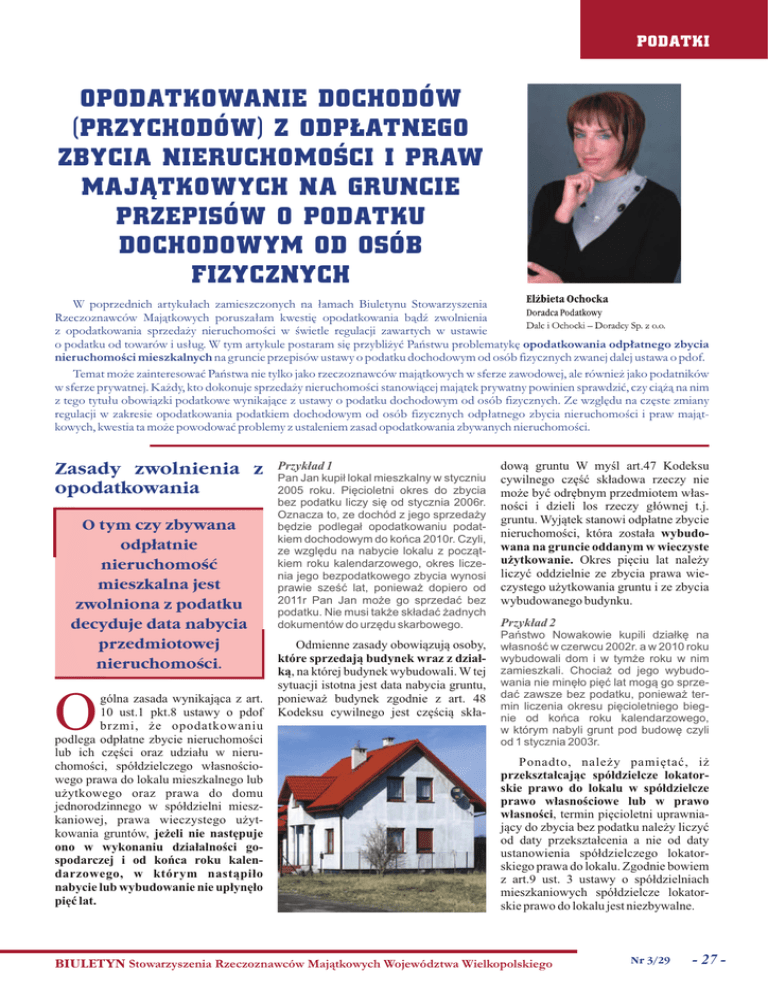 PODATKI OPODATKOWANIE DOCHODÓW (PRZYCHODÓW) Z ODP£ATNEGO ZBYCIA NIERUCHOMOŒCI I PRAW MAJ¥TKOWYCH NA GRUNCIE PRZEPISÓW O PODATKU DOCHODOWYM OD OSÓB FIZYCZNYCH W poprzednich artyku³ach zamieszczonych na ³amach Biuletynu Stowarzyszenia Rzeczoznawców Maj¹tkowych porusza³am kwestiê opodatkowania b¹dŸ zwolnienia z opodatkowania sprzeda¿y nieruchomoœci w œwietle regulacji zawartych w ustawie o podatku od towarów i us³ug. W tym artykule postaram siê przybli¿yæ Pañstwu problematykê opodatkowania odp³atnego zbycia nieruchomoœci mieszkalnych na gruncie przepisów ustawy o podatku dochodowym od osób fizycznych zwanej dalej ustawa o pdof. Temat mo¿e zainteresowaæ Pañstwa nie tylko jako rzeczoznawców maj¹tkowych w sferze zawodowej, ale równie¿ jako podatników w sferze prywatnej. Ka¿dy, kto dokonuje sprzeda¿y nieruchomoœci stanowi¹cej maj¹tek prywatny powinien sprawdziæ, czy ci¹¿¹ na nim z tego tytu³u obowi¹zki podatkowe wynikaj¹ce z ustawy o podatku dochodowym od osób fizycznych. Ze wzglêdu na czêste zmiany regulacji w zakresie opodatkowania podatkiem dochodowym od osób fizycznych odp³atnego zbycia nieruchomoœci i praw maj¹tkowych, kwestia ta mo¿e powodowaæ problemy z ustaleniem zasad opodatkowania zbywanych nieruchomoœci. Zasady zwolnienia z opodatkowania O tym czy zbywana odp³atnie nieruchomoœæ mieszkalna jest zwolniona z podatku decyduje data nabycia przedmiotowej nieruchomoœci. O gólna zasada wynikaj¹ca z art. 10 ust.1 pkt.8 ustawy o pdof brzmi, ¿e opodatkowaniu podlega odp³atne zbycie nieruchomoœci lub ich czêœci oraz udzia³u w nieruchomoœci, spó³dzielczego w³asnoœciowego prawa do lokalu mieszkalnego lub u¿ytkowego oraz prawa do domu jednorodzinnego w spó³dzielni mieszkaniowej, prawa wieczystego u¿ytkowania gruntów, je¿eli nie nastêpuje ono w wykonaniu dzia³alnoœci gospodarczej i od koñca roku kalendarzowego, w którym nast¹pi³o nabycie lub wybudowanie nie up³ynê³o piêæ lat. Przyk³ad 1 Pan Jan kupi³ lokal mieszkalny w styczniu 2005 roku. Piêcioletni okres do zbycia bez podatku liczy siê od stycznia 2006r. Oznacza to, ze dochód z jego sprzeda¿y bêdzie podlega³ opodatkowaniu podatkiem dochodowym do koñca 2010r. Czyli, ze wzglêdu na nabycie lokalu z pocz¹tkiem roku kalendarzowego, okres liczenia jego bezpodatkowego zbycia wynosi prawie szeœæ lat, poniewa¿ dopiero od 2011r Pan Jan mo¿e go sprzedaæ bez podatku. Nie musi tak¿e sk³adaæ ¿adnych dokumentów do urzêdu skarbowego. Odmienne zasady obowi¹zuj¹ osoby, które sprzedaj¹ budynek wraz z dzia³k¹, na której budynek wybudowali. W tej sytuacji istotna jest data nabycia gruntu, poniewa¿ budynek zgodnie z art. 48 Kodeksu cywilnego jest czêœci¹ sk³a- dow¹ gruntu W myœl art.47 Kodeksu cywilnego czêœæ sk³adowa rzeczy nie mo¿e byæ odrêbnym przedmiotem w³asnoœci i dzieli los rzeczy g³ównej t.j. gruntu. Wyj¹tek stanowi odp³atne zbycie nieruchomoœci, która zosta³a wybudowana na gruncie oddanym w wieczyste u¿ytkowanie. Okres piêciu lat nale¿y liczyæ oddzielnie ze zbycia prawa wieczystego u¿ytkowania gruntu i ze zbycia wybudowanego budynku. Przyk³ad 2 Pañstwo Nowakowie kupili dzia³kê na w³asnoœæ w czerwcu 2002r. a w 2010 roku wybudowali dom i w tym¿e roku w nim zamieszkali. Chocia¿ od jego wybudowania nie minê³o piêæ lat mog¹ go sprzedaæ zawsze bez podatku, poniewa¿ termin liczenia okresu piêcioletniego biegnie od koñca roku kalendarzowego, w którym nabyli grunt pod budowê czyli od 1 stycznia 2003r. Ponadto, nale¿y pamiêtaæ, i¿ przekszta³caj¹c spó³dzielcze lokatorskie prawo do lokalu w spó³dzielcze prawo w³asnoœciowe lub w prawo w³asnoœci, termin piêcioletni uprawniaj¹cy do zbycia bez podatku nale¿y liczyæ od daty przekszta³cenia a nie od daty ustanowienia spó³dzielczego lokatorskiego prawa do lokalu. Zgodnie bowiem z art.9 ust. 3 ustawy o spó³dzielniach mieszkaniowych spó³dzielcze lokatorskie prawo do lokalu jest niezbywalne. BIULETYN Stowarzyszenia Rzeczoznawców Maj¹tkowych Województwa Wielkopolskiego Nr 3/29 - 27 - PODATKI Przyk³ad 3 Spó³dzielnia Mieszkaniowa ustanowi³a na rzecz Pani Karczmarek w 1998r. spó³dzielcze lokatorskie prawo do lokalu mieszkalnego, które w 2006 przekszta³ci³a w spó³dzielcze w³asnoœciowe prawo do lokalu. Mo¿e wiêc sprzedaæ mieszkanie bez podatku dopiero w 2012r. Nale¿y równie¿ zwróciæ uwagê na przepisy obowi¹zuj¹ce do 31 grudnia 2006r. Zgodnie z art. 21 ust. 1 pkt. 32 lit.d ustawy o pdof, wolne od podatku by³y przychody ze sprzeda¿y nieruchomoœci i praw maj¹tkowych nabytych w drodze spadku i darowizny. Przyk³ad 4 Pani Magda dosta³a w drodze darowizny w roku 2006 mieszkanie od rodziców. Sprzeda³a je w roku 2011 i nie zap³aci³a z tego tytu³u podatku, choæ od nabycia nie up³ynê³o piêæ lat, poniewa¿ otrzyma³a je w darowiŸnie w okresie, kiedy przepisy zwalnia³y tê czynnoœæ z opodatkowania. Podsumowanie Zwolnione co do zasady z opodatkowania jest zawsze odp³atne zbycie nieruchomoœci i praw maj¹tkowych bêd¹cych maj¹tkiem prywatnym dokonywane po up³ywie 5 lat licz¹c od koñca roku kalendarzowego w którym nast¹pi³o nabycie. Zasady opodatkowania nieruchomoœci zbywanych odp³atnie przed up³ywem 5 lat od daty ich nabycia O tym, jakie zasady nale¿y stosowaæ przy opodatkowaniu dochodu (przychodu) z odp³atnego zbycia nieruchomoœci i praw maj¹tkowych decyduje stan prawny wynikaj¹cy z ustawy o pdof obowi¹zuj¹cy w dacie nabycia nieruchomoœci i praw maj¹tkowych. I. Nieruchomoœci i prawa maj¹tkowe nabyte do 31 grudnia 2006r. Zgodnie z przepisem przejœciowym, zawartym w art. 7 ust. 1 ustawy z dnia 16 listopada 2006r. o zmianie ustawy o pdof oraz zmianie niektórych innych ustaw(Dz.U.Nr217, poz.1588), do przychodu (dochodu) z odp³atnego zbycia nieruchomoœci i praw maj¹tkowych, nabytych lub wybudowanych (oddanych do u¿ytkowania) do 31 grudnia 2006r. stosuje siê zasady, okreœlone w ustawie