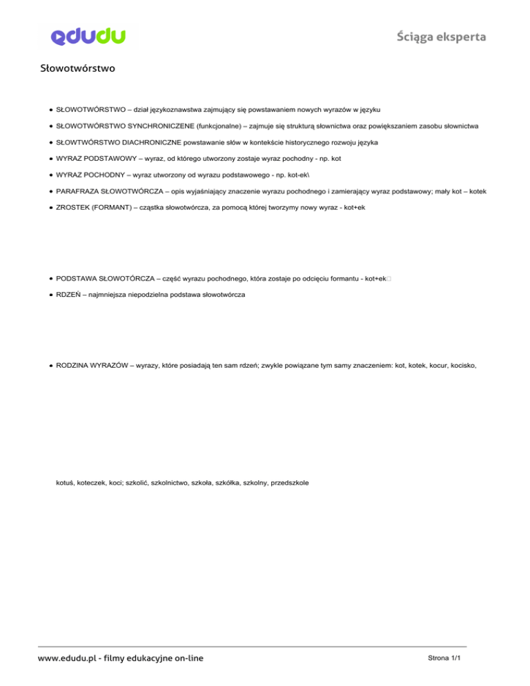 Ściąga eksperta Słowotwórstwo SŁOWOTWÓRSTWO – dział językoznawstwa zajmujący się powstawaniem nowych wyrazów w języku SŁOWOTWÓRSTWO SYNCHRONICZENE (funkcjonalne) – zajmuje się strukturą słownictwa oraz powiększaniem zasobu słownictwa SŁOWTWÓRSTWO DIACHRONICZNE powstawanie słów w kontekście historycznego rozwoju języka WYRAZ PODSTAWOWY – wyraz, od którego utworzony zostaje wyraz pochodny - np. kot WYRAZ POCHODNY – wyraz utworzony od wyrazu podstawowego - np. kot-ek\ PARAFRAZA SŁOWOTWÓRCZA – opis wyjaśniający znaczenie wyrazu pochodnego i zamierający wyraz podstawowy; mały kot – kotek ZROSTEK (FORMANT) – cząstka słowotwórcza, za pomocą której tworzymy nowy wyraz - kot+ek PODSTAWA SŁOWOTÓRCZA – część wyrazu pochodnego, która zostaje po odcięciu formantu - kot+ek RDZEŃ – najmniejsza niepodzielna podstawa słowotwórcza RODZINA WYRAZÓW – wyrazy, które posiadają ten sam rdzeń; zwykle powiązane tym samy znaczeniem: kot, kotek, kocur, kocisko, kotuś, koteczek, koci; szkolić, szkolnictwo, szkoła, szkółka, szkolny, przedszkole www.edudu.pl - filmy edukacyjne on-line Powered by TCPDF (www.tcpdf.org) Strona 1/1
