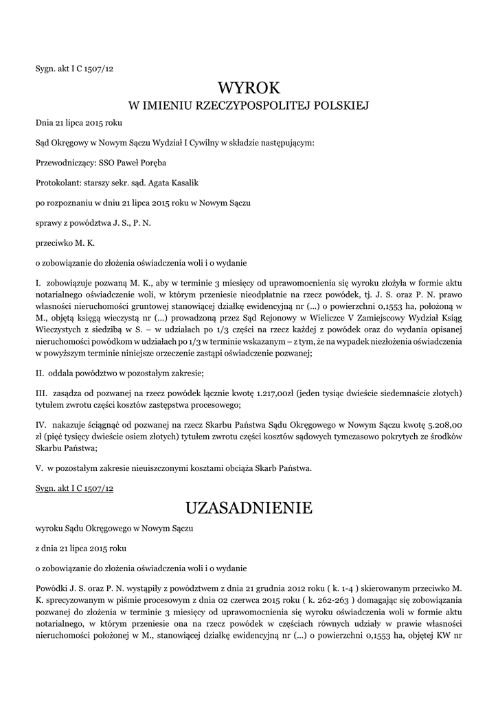 Sygn. akt I C 1507/12 WYROK W IMIENIU RZECZYPOSPOLITEJ POLSKIEJ Dnia 21 lipca 2015 roku Sąd Okręgowy w Nowym Sączu Wydział I Cywilny w składzie następującym: Przewodniczący: SSO Paweł Poręba Protokolant: starszy sekr. sąd. Agata Kasalik po rozpoznaniu w dniu 21 lipca 2015 roku w Nowym Sączu sprawy z powództwa J. S., P. N. przeciwko M. K. o zobowiązanie do złożenia oświadczenia woli i o wydanie I. zobowiązuje pozwaną M. K., aby w terminie 3 miesięcy od uprawomocnienia się wyroku złożyła w formie aktu notarialnego oświadczenie woli, w którym przeniesie nieodpłatnie na rzecz powódek, tj. J. S. oraz P. N. prawo własności nieruchomości gruntowej stanowiącej działkę ewidencyjną nr (...) o powierzchni 0,1553 ha, położoną w M., objętą księgą wieczystą nr (...) prowadzoną przez Sąd Rejonowy w Wieliczce V Zamiejscowy Wydział Ksiąg Wieczystych z siedzibą w S. – w udziałach po 1/3 części na rzecz każdej z powódek oraz do wydania opisanej nieruchomości powódkom w udziałach po 1/3 w terminie wskazanym – z tym, że na wypadek niezłożenia oświadczenia w powyższym terminie niniejsze orzeczenie zastąpi oświadczenie pozwanej; II. oddala powództwo w pozostałym zakresie; III. zasądza od pozwanej na rzecz powódek łącznie kwotę 1.217,00zł (jeden tysiąc dwieście siedemnaście złotych) tytułem zwrotu części kosztów zastępstwa procesowego; IV. nakazuje ściągnąć od pozwanej na rzecz Skarbu Państwa Sądu Okręgowego w Nowym Sączu kwotę 5.208,00 zł (pięć tysięcy dwieście osiem złotych) tytułem zwrotu części kosztów sądowych tymczasowo pokrytych ze środków Skarbu Państwa; V. w pozostałym zakresie nieuiszczonymi kosztami obciąża Skarb Państwa. Sygn. akt I C 1507/12 UZASADNIENIE wyroku Sądu Okręgowego w Nowym Sączu z dnia 21 lipca 2015 roku o zobowiązanie do złożenia oświadczenia woli i o wydanie Powódki J. S. oraz P. N. wystąpiły z powództwem z dnia 21 grudnia 2012 roku ( k. 1-4 ) skierowanym przeciwko M. K. sprecyzowanym w piśmie procesowym z dnia 02 czerwca 2015 roku ( k. 262-263 ) domagając się zobowiązania pozwanej do złożenia w terminie 3 miesięcy od uprawomocnienia się wyroku oświadczenia woli w formie aktu notarialnego, w którym przeniesie ona na rzecz powódek w częściach równych udziały w prawie własności nieruchomości położonej w M., stanowiącej działkę ewidencyjną nr (...) o powierzchni 0,1553 ha, objętej KW nr (...) Sądu Rejonowego w Wieliczce V Zamiejscowego Wydziału Ksiąg Wieczystych z siedzibą w S.. Wniosły nadto o zobowiązanie pozwanej do wydania przedmiotowej nieruchomości. Uzasadniając żądanie powódki podniosły( k. 2-4 ), iż są spadkobierczyniami po zmarłym W. N.. Trzecia spadkobierczyni N. N. nie występuje w sprawie. W. N. zamieszkujący w Stanach Zjednoczonych zakupił w Polsce nieruchomość położoną w M., opisaną powyżej. Środki pieniężne na tę nieruchomość zmarły przelał z rachunku w S. na rachunek banku w N. w kwocie 100.000 USD, które odpowiadały kwocie 322.500,00zł. W dniu 21 stycznia 2009 roku została zawarta umowa nabycia nieruchomości. Ponieważ W. N. zamieszkiwał w S., jako kupująca w umowie została wskazana jego matka A. N.. Równocześnie w tym samym dniu przed notariuszem sporządziła testament, w którym uczyniła zapis nabytej nieruchomości na rzecz syna. Niestety W. N. zmarł przed matką, w wypadku samolotowym w dniu 15 lutego 2010r. A. N. była bezpodstawnie wzbogacona nieruchomością, która została nabyta za środki W. N.. Była zobowiązana do ich zwrotu na rzecz syna, a ponieważ zmarł na rzecz jego spadkobierców. Spadkobierczyniami po nim zostały żona oraz dwie córki w częściach po 1/3. Wbrew ustaleniom poczynionym pomiędzy zmarłym W. N. oraz jego matką A. N. o przejściu nieruchomości na własność W. N., w dniu 05 lipca 2011 roku A. N. darowała nieruchomość córce (pozwanej) M. K.. Tym samym zobowiązaną do zwrotu wzbogacenia jest pozwana. Pozwana M. K. w początkowej fazie postępowania w odpowiedzi na pozew ( k. 97 ) uznała żądanie pozwu i wyraziła zgodę na przeniesienie na rzecz powódek własności nieruchomości opisanej w pozwie, lecz z zaznaczeniem, że wyczerpuje to wszelkie roszczenia powódek mogące wynikać z przyszłego dziedziczenia po A. N. – matce W. N.. Powódki w odpowiedzi na pozew w piśmie procesowym z 29 sierpnia 2013 roku oświadczyły ( k. 104-105 ), iż nie wyrażają zgody na taką propozycje i zarzuciły, że jest ona dla nich niekorzystna. W piśmie procesowym z dnia 14 października 2013 roku ( k. 120-121 ) powódki oświadczyły, iż skłonne w ramach dążenia do ugody zrezygnować jedynie żądania zwrotu kosztów postępowania w razie ugodowego zakończenia sprawy. Pozwana M. K. w piśmie z 10 lutego 2014 roku ( k. 141-142 ) złożonym na rozprawie z dnia 11 lutego 2014 roku ( k. 152 od 00:08:48 ) godziła się na wydanie i nieodpłatne przeniesienie na rzecz powódek oraz N. N. prawa własności nieruchomości położonej w M. oznaczonej jako działka nr (...) pod warunkiem rezygnacji przez powódki z kosztów procesu objętych niniejszym postępowaniem, poniesienia przez powódki kosztów czynności notarialnej oraz rezygnacji przez powódki z roszczeń wobec pozwanej związanych z posiadaniem przez nią z przedmiotowej nieruchomości położonej w M.. Pomimo deklaracji ugodowych wskazywanych na rozprawie z 11 lutego 2014 roku i zakreślonego terminu ( k. 152/2 od 00:13:59 ), powódki w piśmie procesowym z dnia 07 marca 2014 roku ( k. 158 ) nie przystały na propozycję ugody zgłoszoną przez pozwaną i nie zgłosiły już dalszych propozycji. W piśmie procesowym z dnia 01 września 2014 roku pozwana M. K. wniosła ( k. 189-192 ) o oddalenie powództwa zarzucając, iż przedmiotowa nieruchomość w M. została zakupiona za pieniądze pochodzące z darowizny poczynionej na rzecz matki A. N. przez jej syna W. N. i pozwaną M. K.. Środk