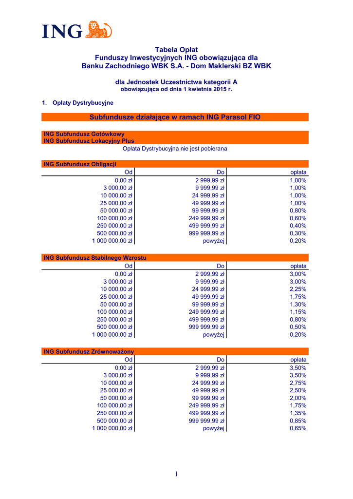 Tabela Opłat Funduszy Inwestycyjnych ING obowiązująca dla Banku Zachodniego WBK S.A. - Dom Maklerski BZ WBK dla Jednostek Uczestnictwa kategorii A obowiązująca od dnia 1 kwietnia 2015 r. 1. Opłaty Dystrybucyjne Subfundusze działające w ramach ING Parasol FIO ING Subfundusz Gotówkowy ING Subfundusz Lokacyjny Plus Opłata Dystrybucyjna nie jest pobierana ING Subfundusz Obligacji Do 2 999,99 zł 9 999,99 zł 24 999,99 zł 49 999,99 zł 99 999,99 zł 249 999,99 zł 499 999,99 zł 999 999,99 zł powyżej opłata 1,00% 1,00% 1,00% 1,00% 0,80% 0,60% 0,40% 0,30% 0,20% ING Subfundusz Stabilnego Wzrostu Od 0,00 zł 3 000,00 zł 10 000,00 zł 25 000,00 zł 50 000,00 zł 100 000,00 zł 250 000,00 zł 500 000,00 zł 1 000 000,00 zł Do 2 999,99 zł 9 999,99 zł 24 999,99 zł 49 999,99 zł 99 999,99 zł 249 999,99 zł 499 999,99 zł 999 999,99 zł powyżej opłata 3,00% 3,00% 2,25% 1,75% 1,30% 1,15% 0,80% 0,50% 0,20% ING Subfundusz Zrównoważony Od 0,00 zł 3 000,00 zł 10 000,00 zł 25 000,00 zł 50 000,00 zł 100 000,00 zł 250 000,00 zł 500 000,00 zł 1 000 000,00 zł Do 2 999,99 zł 9 999,99 zł 24 999,99 zł 49 999,99 zł 99 999,99 zł 249 999,99 zł 499 999,99 zł 999 999,99 zł powyżej opłata 3,50% 3,50% 2,75% 2,50% 2,00% 1,75% 1,35% 0,85% 0,65% Od 0,00 zł 3 000,00 zł 10 000,00 zł 25 000,00 zł 50 000,00 zł 100 000,00 zł 250 000,00 zł 500 000,00 zł 1 000 000,00 zł 1 ING Subfundusz Akcji ING Subfundusz Średnich i Małych Spółek ING Subfundusz Akcji Środkowoeuropejskich ING Subfundusz Środkowoeuropejski Budownictwa i Nieruchomości ING Subfundusz Selektywny Od Do 0,00 zł 2 999,99 zł 3 000,00 zł 9 999,99 zł 10 000,00 zł 24 999,99 zł 25 000,00 zł 49 999,99 zł 50 000,00 zł 99 999,99 zł 100 000,00 zł 249 999,99 zł 250 000,00 zł 499 999,99 zł 500 000,00 zł 999 999,99 zł 1 000 000,00 zł powyżej opłata 4,00% 4,00% 3,25% 2,75% 2,25% 2,00% 1,50% 1,00% 0,75% Subfundusze działające w ramach ING SFIO ING Subfundusz Depozytowy (L) Opłata Dystrybucyjna nie jest pobierana ING Subfundusz Globalny Spółek Dywidendowych (L) ING Subfundusz Spółek Dywidendowych USA (L) ING Subfundusz Europejski Spółek Dywidendowych (L) ING Subfundusz Japonia (L) ING Subfundusz Nowej Azji (L) ING Subfundusz Spółek Dywidendowych Rynków Wschodzących (L) ING Subfundusz Ameryki Łacińskiej (L) ING Subfundusz Globalnych Możliwości (L) Od Do 0,00 zł 2 999,99 zł 3 000,00 zł 9 999,99 zł 10 000,00 zł 24 999,99 zł 25 000,00 zł 49 999,99 zł 50 000,00 zł 99 999,99 zł 100 000,00 zł 249 999,99 zł 250 000,00 zł 499 999,99 zł 500 000,00 zł 999 999,99 zł 1 000 000,00 zł powyżej opłata 4,75% 4,25% 3,25% 2,75% 2,25% 2,00% 1,50% 1,00% 0,75% ING Subfundusz Globalny Długu Korporacyjnego (L) Od Opłata Do 0,00 zł 3 000,00 zł 10 000,00 zł 25 000,00 zł 50 000,00 zł 100 000,00 zł 250 000,00 zł 500 000,00 zł 1 000 000,00 zł 2 999,99 zł 9 999,99 zł 24 999,99 zł 49 999,99 zł 99 999,99 zł 249 999,99 zł 499 999,99 zł 999 999,99 zł powyżej 2 1,50% 1,25% 1,00% 1,00% 0,75% 0,50% 0,40% 0,40% 0,20% Towarzystwo pobiera Opłatę Dystrybucyjną w walucie polskiej. W przypadku wpłaty w dolarach amerykańskich lub euro, do celów pobrania Opłaty Dystrybucyjnej przelicza się wpłatę na walutę polską według średniego kursu z Dnia Wyceny, w którym następuje zbycie Jednostek Uczestnictwa, wyliczonego przez Narodowy Bank Polski. Przy pobieraniu Opłaty Dystrybucyjnej stosowana jest zasada kumulacji, co oznacza, że określając procentową stawkę Opłaty Dystrybucyjnej uwzględnia się wartość wszystkich jednostek uczestnictwa Uczestnika zgromadzonych w ramach jego Numeru Uczestnika, łącznie z bieżącą wpłatą. Dla jednostek uczestnictwa zgromadzonych w ramach Numeru Uczestnika, nabytych za wpłaty dokonane w dolarach amerykańskich lub euro, zasada kumulacji stosowana jest w ten sposób, że wartość posiadanych jednostek uczestnictwa przeliczana jest na walutę polską według średniego kursu z Dnia Wyceny, w którym następuje zbycie Jednostek Uczestnictwa, wyliczonego przez Narodowy Bank Polski. Opłaty określone w Tabeli Opłat będą stosowane przy zbywaniu Jednostek Uczestnictwa zapisywanych na rejestrach otwartych za pośrednictwem BZ WBK S.A. - Domu Maklerskiego BZ WBK. O zastosowaniu opłat określonych w Tabeli Opłat decyduje: - data zaksięgowania wpłaty na rachunku bankowym funduszu albo data otrzymania zlecenia otwarcia rejestru, w zależności, która z tych dat jest późniejsza – w przypadku pierwszego nabycia jednostek uczestnictwa, - data zaksięgowania wpłaty na rachunku bankowym funduszu – w przypadku nabywania jednostek uczestnictwa w drodze wpłaty na rachunek bankowy funduszu przez Uczestnika posiadającego otwarty rejestr (Wpłaty Bezpośredniej), - data otrzymania zlecenia przez Agenta Transferowego – w przypadku nabywania jednostek uczestnictwa w drodze Konwersji/Zamiany. 2. Opłata za Konwersję Opłata za Konwersję wynosi 0% (opłata nie jest pobierana). Oplata za Konwersję nie jest tożsama z Opłatą Dystrybucyjną. Zasady pobierania Opłaty Dystrybucyjnej przy realizacji zlecenia Konwersji, w tym zasady zwolnienia od Opłaty Dystrybucyjnej, zostały szczegółowo opisane w punkcie dot. Opłat Dystrybucyjnych. 3. Opłata za Zamianę Opłata za Zamianę wynosi 0% (opłata nie jest pobierana). Oplata za Zamianę nie jest tożsama z Opłatą Dystrybucyjną. Zasady pobierania Opłaty Dystrybucyjnej przy realizacji zlecenia Zamiany, w tym zasady zwolnienia od Opłaty Dystrybucyjnej, zostały szczegółowo opisane w punkcie dot. Opłat Dystrybucyjnych. 3