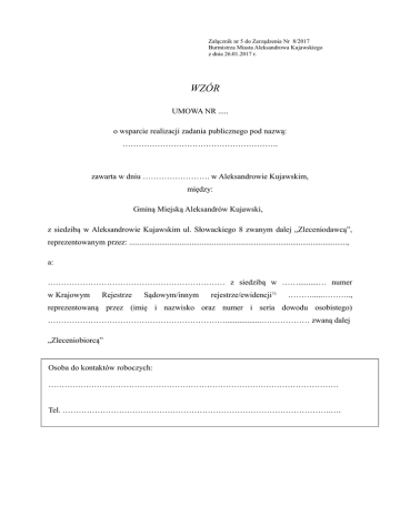 Załącznik nr 5 do Zarządzenia Nr 8/2017 Burmistrza Miasta Aleksandrowa Kujawskiego z dnia 26.01.2017 r. WZÓR UMOWA NR ..... o wsparcie realizacji zadania publicznego pod nazwą: …………………………………………………. zawarta w dniu ……………………. w Aleksandrowie Kujawskim, między: Gminą Miejską Aleksandrów Kujawski, z siedzibą w Aleksandrowie Kujawskim ul. Słowackiego 8 zwanym dalej „Zleceniodawcą”, reprezentowanym przez: ............................................................................................................, a: ………………………………………………………… z siedzibą w ……..........… numer w Krajowym Rejestrze Sądowym/innym rejestrze/ewidencji 1) ……….....……….., reprezentowaną przez (imię i nazwisko oraz numer i seria dowodu osobistego) …………………………………………………………..................……………… zwaną dalej „Zleceniobiorcą” Osoba do kontaktów roboczych: ……………………………………………………………………………………………… Tel. ……………………………………………………………………………………….…. § 1. Przedmiot umowy 1. Zleceniodawca zleca Zleceniobiorcy, zgodnie z przepisami ustawy z dnia 25 czerwca 2010 r. o sporcie ((Dz.U. 2016 r. poz. 176) zwanej dalej „ustawą”, Uchwały Nr XVI/114/16 Rady Miejskiej Aleksandrowa Kujawskiego dnia 15 stycznia 2016 r. w sprawie określenia warunków i trybu wspierania finansowego rozwoju sportu na terenie Gminy Miejskiej Aleksandrów Kujawski. realizację zadania publicznego pod tytułem: …………………………………………………………………………………………………... określonego szczegółowo w ofercie złożonej przez Zleceniobiorcę w dniu ............................, z uwzględnieniem aktualizacji opisu poszczególnych działań/ harmonogramu/ kosztorysu 1),2) zwanego dalej „zadaniem publicznym”, a Zleceniobiorca zobowiązuje się wykonać zadanie publiczne w zakresie i na warunkach określonych w niniejszej umowie. 2. Niniejsza umowa jest umową o wsparcie realizacji zadania publicznego. 3. Wykonanie umowy nastąpi z chwilą zaakceptowania przez Zleceniodawcę sprawozdania końcowego, o którym mowa w § 10 ust. 3. 4. Oferta oraz aktualizacje opisu poszczególnych działań/harmonogramu/kosztorysu 1), 2), o których mowa w ust. 1, stanowią załączniki do niniejszej umowy. § 2. Sposób wykonania zadania publicznego 1. Termin realizacji zadania publicznego ustala się od dnia .................................. do dnia ................................... 2. Zleceniobiorca zobowiązuje się wykonać zadanie publiczne zgodnie z ofertą, z uwzględnieniem aktualizacji opisu poszczególnych działań/harmonogramu/kosztorysu1), 2). 3. Zleceniobiorca zobowiązuje się do wykorzystania przekazanej dotacji zgodnie z celem, na jaki ją uzyskał, i na warunkach określonych niniejszą umową. Dotyczy to także ewentualnych przychodów uzyskanych przy realizacji umowy, których nie można było przewidzieć przy kalkulowaniu wielkości dotacji, oraz odsetek bankowych od przekazanych przez Zleceniodawcę środków, które należy wykorzystać wyłącznie na realizację zadania publicznego. § 3. Wysokość dotacji w całkowitym koszcie zadania 1. Zleceniodawca zobowiązuje się do przekazania na realizację zadania publicznego kwotę dotacji w wysokości ....................... (słownie) ..........................................3), na rachunek bankowy Zleceniobiorcy: nr rachunku: ..............................................., 1) w terminie 30 dni od dnia zawarcia niniejszej umowy; 2) w następujący sposób: I transza w wysokości ....................(słownie)....................................................................... w terminie ............................................... II transza w wysokości .................... (słownie)....................................................................... w terminie ............................................... III transza w wysokości ..................... (słownie)...................................................................... w terminie ............................................... IV transza w wysokości ................... (słownie)....................................................................... w terminie ............................................... 2. Zleceniobiorca oświadcza, że jest jedynym posiadaczem wskazanego w ust. 1 rachunku bankowego i zobowiązuje się do utrzymania wskazanego powyżej rachunku nie krócej niż do chwili dokonania ostatecznych rozliczeń ze Zleceniodawcą, wynikających z umowy. 3. Zleceniobiorca zobowiązuje się do przekazania na realizację zadania: 1) środków finansowych własnych w wysokości............................................................. (słownie) ............................................................................................................; 2) środków finansowych z innych źródeł w wysokości................................................... (słownie) ............................................................................................................…............ 4. Całkowity koszt zadania publicznego, stanowi sumę kwot dotacji, środków finansowych własnych oraz środków finansowych z innych źródeł wynosi ………………………. (słownie)…………………………………………………….................................. 6. Przekazanie kolejnej transzy nastąpi po złożeniu sprawozdania częściowego, o którym mowa w §11. 7. Zleceniodawca uzależnia przekazanie kolejnych transz od wydatkowania co najmniej 25% przekazanych środków dotacji7). § 4. Procentowy udział dotacji w kosztach zadania publicznego 1. Zleceniobiorca jest zobowiązany zachować procentowy udział dotacji, o którym