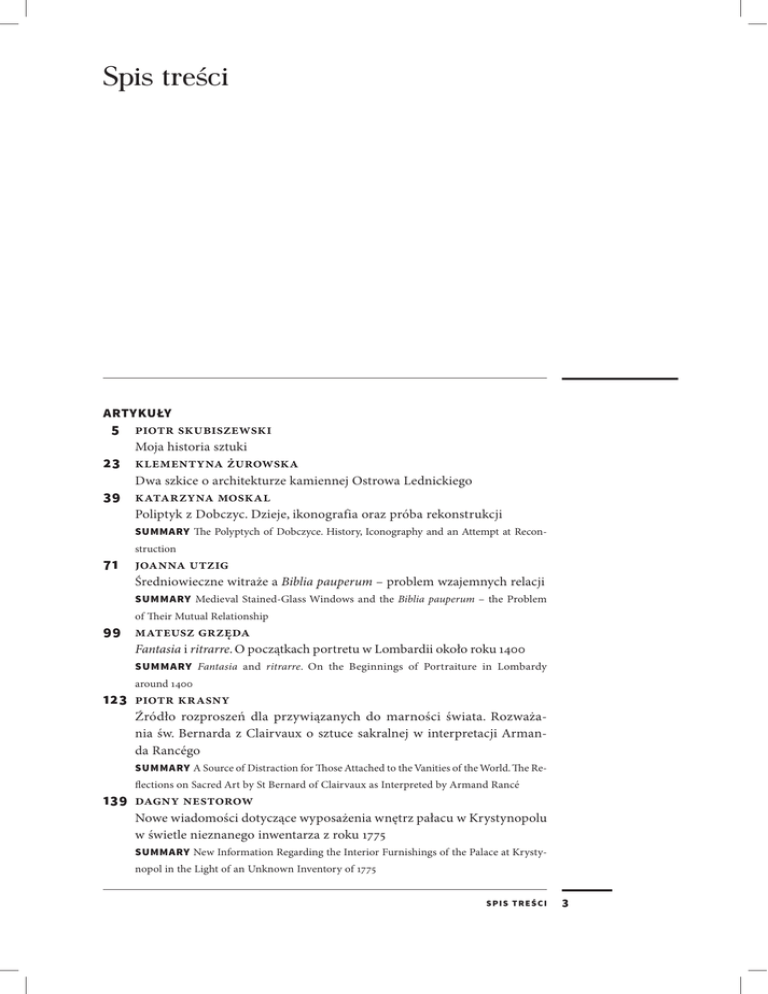 Spis treści modus prace z historii sztuki xiv, 2013 Spis treści ARTYKUŁY 5 piotr skubiszewski Moja historia sztuki 23 klementyna żurowska Dwa szkice o architekturze kamiennej Ostrowa Lednickiego 39 Katarzyna Moskal Poliptyk z Dobczyc. Dzieje, ikonografia oraz próba rekonstrukcji SUMMARY The Polyptych of Dobczyce. History, Iconography and an Attempt at Reconstruction 71 Joanna Utzig Średniowieczne witraże a Biblia pauperum – problem wzajemnych relacji SUMMARY Medieval Stained-Glass Windows and the Biblia pauperum – the Problem of Their Mutual Relationship 99 Mateusz Grzęda Fantasia i ritrarre. O początkach portretu w Lombardii około roku SUMMARY Fantasia and ritrarre. On the Beginnings of Portraiture in Lombardy around 123 Piotr Krasny Źródło rozproszeń dla przywiązanych do marności świata. Rozważania św. Bernarda z Clairvaux o sztuce sakralnej w interpretacji Armanda Rancégo SUMMARY A Source of Distraction for Those Attached to the Vanities of the World. The Reflections on Sacred Art by St Bernard of Clairvaux as Interpreted by Armand Rancé 139 Dagny Nestorow Nowe wiadomości dotyczące wyposażenia wnętrz pałacu w Krystynopolu w świetle nieznanego inwentarza z roku SUMMARY New Information Regarding the Interior Furnishings of the Palace at Krystynopol in the Light of an Unknown Inventory of SPIS TREŚCI 3 157 Anna Markiewicz Wokół kontraktów artystycznych dominikanów lwowskich w epoce nowożytnej (XVII–XVIII w.) SUMMARY Concerning the Contracts for Art Commissions of the Dominicans of Lvov in the Early Modern Period (th–th c.) 181 Zbigniew Michalczyk Wiedeńska Akademie der bildenden Künste a krakowska Szkoła Rysunku i Malarstwa przy Uniwersytecie Jagiellońskim (–) SUMMARY The Akademie der bildenden Künste in Vienna and the School of Drawing and Painting at the Jagiellonian University in Cracow between 1818 and 1833 239 Agata Wójcik Akwarele z widokami Stambułu ze zbiorów Biblioteki Kórnickiej SUMMARY Watercolours with Views of Istanbul in the Collection of the Kórnik Library 249 Agata Dworzak Dwór Heleny i Józefa Badenich w Wadowie SUMMARY The Manor House of Helena and Józef Badeni at Wadów RECENZJE I OMÓWIENIA 267 Anna Wyszyńska Synteza jako zło konieczne? Kilka uwag w kontekście Ozdób i nakryć głowy na ziemiach polskich od X do końca XVIII wieku Anny Drążkowskiej 273 Wojciech Walanus Jan Friedrich Richter, Hans Brüggemann, Deutscher Verlag für Kunstwissenschaft, Berlin , ss. , il. , mapy 279 Marcin Fabiański Jak nie należy pisać prac naukowych i ich wartościować, czyli o nieudanej książce na temat sztuki nowożytnej na Lubelszczyźnie 287 Kronika Instytutu Historii Sztuki UJ za rok 295 Noty o Autorach 4 SPIS TREŚCI