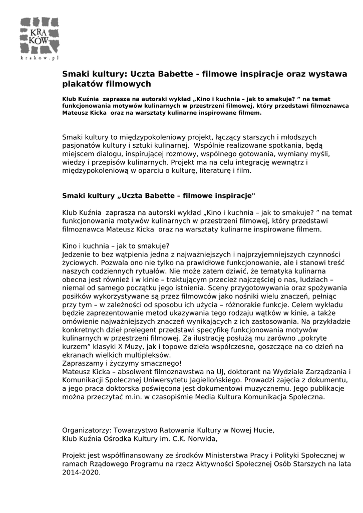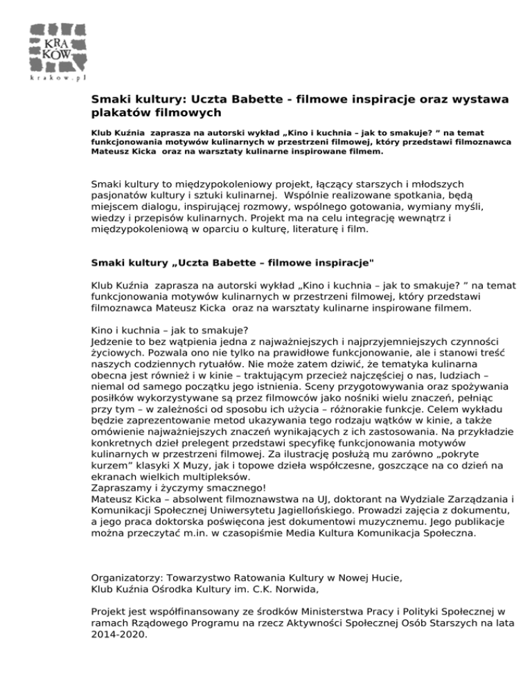 Smaki kultury: Uczta Babette - filmowe inspiracje oraz wystawa plakatów filmowych Klub Kuźnia zaprasza na autorski wykład „Kino i kuchnia – jak to smakuje? ” na temat funkcjonowania motywów kulinarnych w przestrzeni filmowej, który przedstawi filmoznawca Mateusz Kicka oraz na warsztaty kulinarne inspirowane filmem. Smaki kultury to międzypokoleniowy projekt, łączący starszych i młodszych pasjonatów kultury i sztuki kulinarnej. Wspólnie realizowane spotkania, będą miejscem dialogu, inspirującej rozmowy, wspólnego gotowania, wymiany myśli, wiedzy i przepisów kulinarnych. Projekt ma na celu integrację wewnątrz i międzypokoleniową w oparciu o kulturę, literaturę i film. Smaki kultury „Uczta Babette – filmowe inspiracje" Klub Kuźnia zaprasza na autorski wykład „Kino i kuchnia – jak to smakuje? ” na temat funkcjonowania motywów kulinarnych w przestrzeni filmowej, który przedstawi filmoznawca Mateusz Kicka oraz na warsztaty kulinarne inspirowane filmem. Kino i kuchnia – jak to smakuje? Jedzenie to bez wątpienia jedna z najważniejszych i najprzyjemniejszych czynności życiowych. Pozwala ono nie tylko na prawidłowe funkcjonowanie, ale i stanowi treść naszych codziennych rytuałów. Nie może zatem dziwić, że tematyka kulinarna obecna jest również i w kinie – traktującym przecież najczęściej o nas, ludziach – niemal od samego początku jego istnienia. Sceny przygotowywania oraz spożywania posiłków wykorzystywane są przez filmowców jako nośniki wielu znaczeń, pełniąc przy tym – w zależności od sposobu ich użycia – różnorakie funkcje. Celem wykładu będzie zaprezentowanie metod ukazywania tego rodzaju wątków w kinie, a także omówienie najważniejszych znaczeń wynikających z ich zastosowania. Na przykładzie konkretnych dzieł prelegent przedstawi specyfikę funkcjonowania motywów kulinarnych w przestrzeni filmowej. Za ilustrację posłużą mu zarówno „pokryte kurzem” klasyki X Muzy, jak i topowe dzieła współczesne, goszczące na co dzień na ekranach wielkich multipleksów. Zapraszamy i życzymy smacznego! Mateusz Kicka – absolwent filmoznawstwa na UJ, doktorant na Wydziale Zarządzania i Komunikacji Społecznej Uniwersytetu Jagiellońskiego. Prowadzi zajęcia z dokumentu, a jego praca doktorska poświęcona jest dokumentowi muzycznemu. Jego publikacje można przeczytać m.in. w czasopiśmie Media Kultura Komunikacja Społeczna. Organizatorzy: Towarzystwo Ratowania Kultury w Nowej Hucie, Klub Kuźnia Ośrodka Kultury im. C.K. Norwida, Projekt jest współfinansowany ze środków Ministerstwa Pracy i Polityki Społecznej w ramach Rządowego Programu na rzecz Aktywności Społecznej Osób Starszych na lata 2014-2020. Informacje i zapisy na warsztaty: Klub Kuźnia Ośrodka Kultury im. Norwida, os. Złotego Wieku 14, tel. 12 6480886, e-mail: [email protected] Powered by TCPDF (www.tcpdf.org)