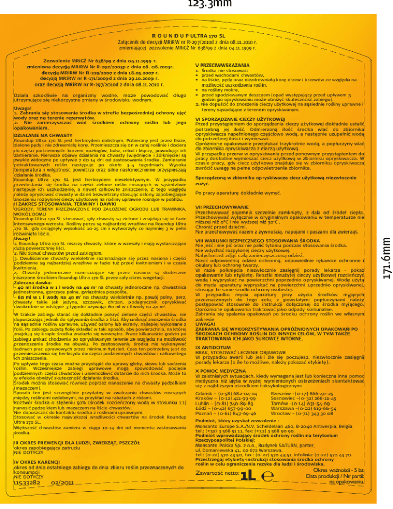 123.3mm R O U N D U P ULTRA 170 SL Załącznik do decyzji MRiRW nr R-297/2010d z dnia 08.11.2010 r. zmieniającej zezwolenie MRiGŻ Nr 638/99 z dnia 04.11.1999 r. Działa szkodliwie na organizmy wodne, może powodować utrzymujące się niekorzystne zmiany w środowisku wodnym. długo Uwaga! 1. Zabrania się stosowania środka w strefie bezpośredniej ochrony ujęć wody oraz na terenie rezerwatów. 2. Nie zanieczyszczać wód środkiem ochrony roślin lub jego opakowaniem. DZIAŁANIE NA CHWASTY Roundup Ultra 170 SL jest herbicydem dolistnym. Pobierany jest przez liście, zielone pędy i nie zdrewniałą korę. Przemieszcza się on w całej roślinie i dociera do części podziemnych: korzeni, rozłogów, bulw, cebul i kłączy, powodując ich zamieranie. Pierwsze objawy działania na chwasty (więdnięcie i żółknięcie) są zwykle widoczne po upływie 7 do 14 dni od zastosowania środka. Zamieranie potraktowanych roślin następuje po około 3-4 tygodniach. Wysoka temperatura i wilgotność powietrza oraz silne nasłonecznienie przyspieszają działanie środka. Roundup Ultra 170 SL jest herbicydem nieselektywnym. W przypadku przedostania się środka na części zielone roślin rosnących w sąsiedztwie następuje ich uszkodzenie, a nawet całkowite zniszczenie. Z tego względu należy opryskiwać chwasty w dzień bezwietrzny stosując osłony zapobiegające znoszeniu rozpylonej cieczy użytkowej na rośliny uprawne rosnące w pobliżu. II ZAKRES STOSOWANIA, TERMINY I DAWKI OGRODY, TERENY PRZEZNACZONE POD ZAŁOŻENIE OGRODU LUB TRAWNIKA, WOKÓŁ DOMU Roundup Ultra 170 SL stosować, gdy chwasty są zielone i znajdują się w fazie intensywnego wzrostu. Rośliny perzu są najbardziej wrażliwe na Roundup Ultra 170 SL, gdy osiągnęły wysokość 10-25 cm i wytworzyły co najmniej 3 w pełni rozwinięte liście. Uwagi! 1. Roundup Ultra 170 SL niszczy chwasty, które w wzeszły i mają wystarczająco dużą powierzchnię liści. 2. Nie ścinać chwastów przed zabiegiem. 3. Dwuliścienne chwasty wieloletnie rozmnażające się przez nasiona i części podziemne są najbardziej wrażliwe w fazie tuż przed kwitnieniem i w czasie kwitnienia. 4. Chwasty jednoroczne rozmnażające się przez nasiona są skutecznie niszczone środkiem Roundup Ultra 170 SL przez cały okres wegetacji. Zalecana dawka: - 40 ml środka w 1 l wody na 40 m2 na chwasty jednoroczne np. chwastnica jednostronna, gorczyca polna, gwiazdnica pospolita, - 60 ml w 1 l wody na 40 m2 na chwasty wieloletnie np. powój polny, perz, chwasty takie jak jeżyna, szczawik, chrzan, podagrycznik opryskiwać dwukrotnie w odstępie 3 tygodni używając 60 ml w 1 l wody na 40 m2. W trakcie zabiegu starać się dokładnie pokryć zielone części chwastów, nie dopuszczając jednak do spływania środka z liści. Aby uniknąć znoszenia środka na sąsiednie rośliny uprawne, używać osłony lub ekrany, najlepiej wykonane z folii. Po zabiegu zużytą folię składać w taki sposób, aby powierzchnia, na której znajdują się krople środka znalazła się wewnątrz. Przez kilkanaście godzin po zabiegu unikać chodzenia po opryskiwanym terenie ze względu na możliwość przenoszenia środka na obuwiu. Po zastosowaniu środka nie wykonywać żadnych prac uprawowych przez minimum tydzień. Czas ten potrzebny jest do przemieszczenia się herbicydu do części podziemnych chwastów i całkowitego ich zniszczenia. Po upływie tego czasu można przystąpić do uprawy gleby, siewu lub sadzenia roślin. Wcześniejsze zabiegi uprawowe mogą spowodować pocięcie podziemnych części chwastów i uniemożliwić dotarcie do nich środka. Może to w efekcie obniżyć skuteczność działania środka. Środek można stosować również poprzez nanoszenie na chwasty pędzelkiem (mazaczem). Sposób ten jest szczególnie przydatny w zwalczaniu chwastów rosnących między roślinami ozdobnymi, na przykład na rabatach z różami. Roztwór środka o stężeniu 50% (środek rozcieńczony wodą w stosunku 1:1) nanosić pędzelkiem lub mazaczem na liście chwastów. Nie dopuszczać do kontaktu środka z roślinami uprawnymi. Stosować w okresie największej wrażliwości chwastów na środek Roundup Ultra 170 SL. Większość chwastów zamiera w ciągu 10-14 dni od momentu zastosowania środka. III OKRES PREWENCJI DLA LUDZI, ZWIERZĄT, PSZCZÓŁ okres zapobiegający zatruciu NIE DOTYCZY IV OKRES KARENCJI okres od dnia ostatniego zabiegu do dnia zbioru roślin przeznaczonych do konsumpcji NIE DOTYCZY 11533282 02/2011 V PRZECIWWSKAZANIA 1. Środka nie stosować: • przed wschodami chwastów, • na liście, pędy oraz niezdrewniałą korę drzew i krzewów ze względu na możliwość uszkodzenia roślin. • na rośliny mokre, • przed spodziewanym deszczem (opad występujący przed upływem 3 godzin po opryskiwaniu może obniżyć skuteczność zabiegu). 2. Nie dopuścić do znoszenia cieczy użytkowej na sąsiednie rośliny uprawne i tereny sąsiadujące z terenem opryskiwanym. VI SPORZĄDZANIE CIECZY UŻYTKOWEJ Przed przystąpieniem do sporządzania cieczy użytkowej dokładnie ustalić potrzebną jej ilość. Odmierzoną ilość środka wlać do zbiornika opryskiwacza napełnionego częściowo wodą, a następnie uzupełnić wodą do potrzebnej ilości i wymieszać. Opróżnione opakowanie przepłukać trzykrotnie wodą, a popłuczyny wlać do zbiornika opryskiwacza z cieczą użytkową. W przypadku przerw w opryskiwaniu przed ponownym przystąpieniem do pracy dokładnie wymieszać ciecz użytkową w zbiorniku opryskiwacza. W czasie pracy, gdy ciecz użytkowa znajduje się w zbiorniku opryskiwacza zwrócić uwagę na pełne odpowietrzenie zbiornika. Sporządzoną w zbiorniku opryskiwacza ciecz użytkową niezwłocznie zużyć. Po pracy aparaturę dokładnie wymyć. VII PRZECHOWYWANIE Przechowywać pojemnik szczelnie zamknięty, z dala od źródeł ciepła. Przechowywać wyłącznie w oryginalnym opakowaniu w temperaturze nie niższej niż 0°C i nie wy