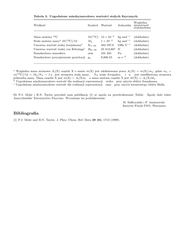 Tabela 3. Uzgodnione miedzynarodowo wartości stalych fizycznych. , Wielkość Symbol Wartość Wzgledna , Jednostka niepewność standardowa Masa molowa 12 C Stala molowa masya M (12 C)/12 Umowna wartość stalej Josephsonab Umowna wartość stalej von Klitzingac Standardowa atmosfera Standardowe przyspieszenie grawitacji M (12 C) Mu KJ−90 RK−90 atm gn 12 × 10−3 1 × 10−3 483 597,9 25 812,807 101 325 9,806 65 kg mol−1 kg mol−1 GHz V−1 Ω Pa m s−2 (dokladnie) (dokladnie) (dokladnie) (dokladnie) (dokladnie) (dokladnie) a Wzgledna masa atomowa Ar (X) czastki X o masie m(X) jest zdefiniowana przez Ar (X) = m(X)/mu , gdzie mu = , , m(12 C)/12 = Mu /NA = 1 u jest atomowa, stala, masy, NA stala, Avogadra, i u jest zunifikowana, atomowa, jednostka, masy. Masa czastki X jest m(X) = Ar (X)u, a masa molowa czastki X jest M (X) = Ar (X)Mu . , , b Uzgodniona miedzynarodowo wartość dla realizacji reprezentacji wolta przy użyciu efektu Josephsona. , c Uzgodniona miedzynarodowo wartość dla realizacji reprezentacji oma przy użyciu kwantowego efektu Halla. , Dr P.J. Mohr i B.N. Taylor przyslali nam publikacje, [1] ze zgoda, na przedrukowanie Tablic. Zgode, dalo także Amerykańskie Towarzystwo Fizyczne. Wyrażamy im podziekowanie. , M. Suffczyński i P. Janiszewski Instytut Fizyki PAN, Warszawa Bibliografia [1] P.J. Mohr and B.N. Taylor, J. Phys. Chem. Ref. Data 28 (6), 1713 (1999).