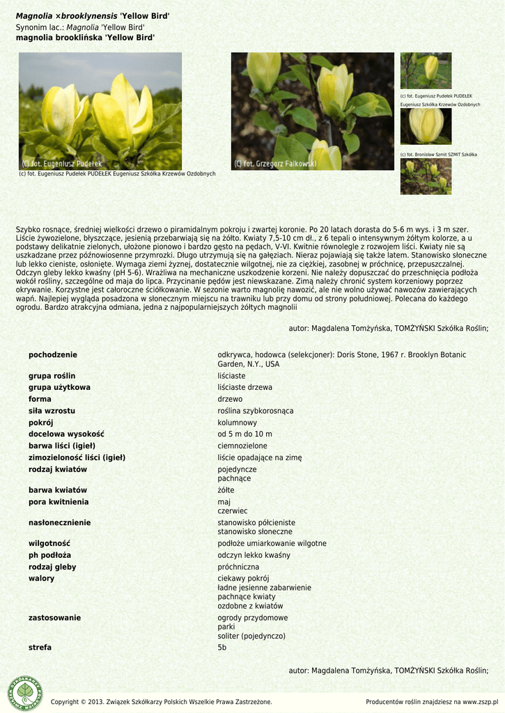 Magnolia ×brooklynensis 'Yellow Bird' Synonim lac.: Magnolia 'Yellow Bird' magnolia brooklińska 'Yellow Bird' (c) fot. Eugeniusz Pudełek PUDEŁEK Eugeniusz Szkółka Krzewów Ozdobnych (c) fot. Bronisław Szmit SZMIT Szkółka (c) fot. Eugeniusz Pudełek PUDEŁEK Eugeniusz Szkółka Krzewów Ozdobnych Szybko rosnące, średniej wielkości drzewo o piramidalnym pokroju i zwartej koronie. Po 20 latach dorasta do 5-6 m wys. i 3 m szer. Liście żywozielone, błyszczące, jesienią przebarwiają się na żółto. Kwiaty 7,5-10 cm dł., z 6 tepali o intensywnym żółtym kolorze, a u podstawy delikatnie zielonych, ułożone pionowo i bardzo gęsto na pędach, V-VI. Kwitnie równolegle z rozwojem liści. Kwiaty nie są uszkadzane przez późnowiosenne przymrozki. Długo utrzymują się na gałęziach. Nieraz pojawiają się także latem. Stanowisko słoneczne lub lekko cieniste, osłonięte. Wymaga ziemi żyznej, dostatecznie wilgotnej, nie za ciężkiej, zasobnej w próchnicę, przepuszczalnej. Odczyn gleby lekko kwaśny (pH 5-6). Wrażliwa na mechaniczne uszkodzenie korzeni. Nie należy dopuszczać do przeschnięcia podłoża wokół rośliny, szczególne od maja do lipca. Przycinanie pędów jest niewskazane. Zimą należy chronić system korzeniowy poprzez okrywanie. Korzystne jest całoroczne ściółkowanie. W sezonie warto magnolię nawozić, ale nie wolno używać nawozów zawierających wapń. Najlepiej wygląda posadzona w słonecznym miejscu na trawniku lub przy domu od strony południowej. Polecana do każdego ogrodu. Bardzo atrakcyjna odmiana, jedna z najpopularniejszych żółtych magnolii autor: Magdalena Tomżyńska, TOMŻYŃSKI Szkółka Roślin; pochodzenie odkrywca, hodowca (selekcjoner): Doris Stone, 1967 r. Brooklyn Botanic Garden, N.Y., USA grupa roślin liściaste grupa użytkowa liściaste drzewa forma drzewo siła wzrostu roślina szybkorosnąca pokrój kolumnowy docelowa wysokość od 5 m do 10 m barwa liści (igieł) ciemnozielone zimozieloność liści (igieł) liście opadające na zimę rodzaj kwiatów pojedyncze pachnące barwa kwiatów żółte pora kwitnienia maj czerwiec nasłonecznienie stanowisko półcieniste stanowisko słoneczne wilgotność podłoże umiarkowanie wilgotne ph podłoża odczyn lekko kwaśny rodzaj gleby próchniczna walory ciekawy pokrój ładne jesienne zabarwienie pachnące kwiaty ozdobne z kwiatów zastosowanie ogrody przydomowe parki soliter (pojedynczo) strefa 5b autor: Magdalena Tomżyńska, TOMŻYŃSKI Szkółka Roślin; Copyright © 2013. Związek Szkółkarzy Polskich Wszelkie Prawa Zastrzeżone. Producentów roślin znajdziesz na www.zszp.pl