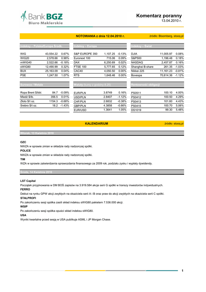 Komentarz poranny 13.04.2010 r. NOTOWANIA z dnia 12.04.2010 r. Indeksy – Polska/Europa Środk. Indeksy – Europa WIG 43,554.22 0.67% S&P EUROPE 350 WIG20 2,578.66 0.98% Euronext 100 mWIG40 2,522.66 -0.18% DAX źródło: Bloomberg, stooq.pl Indeksy – Świat 1,107.25 -0.13% DJIA 11,005.97 0.08% 715.06 0.09% S&P500 1,196.48 0.18% 6,250.69 0.02% NASDAQ 2,457.87 0.16% sWIG80 12,490.99 0.32% FTSE 100 5,777.65 0.12% Shanghai B-share BUX 25,163.09 0.04% CAC40 4,050.50 0.00% Nikkei 225 11,161.23 -0.81% PSE 1,247.50 1.07% RTS 1,648.46 0.00% Bovespa 70,614.36 -1.12% Surowce / Metale Waluty (kursy z godziny 8.25) Ropa Brent $/bbl. Miedź $/lb. Złoto $/t oz. 84.7 -0.09% 261.35 -1.03% Rentowność obligacji EUR/PLN 3.8749 0.16% PS0511 100.10 0.01% USD/PLN 2.8407 -1.12% PS0412 100.50 4.29% 1154.3 -0.68% CHF/PLN 2.6832 -0.38% PS0413 101.60 4.43% 18.2 -1.43% GBP/PLN 4.3858 -0.66% PS0415 100.70 5.06% EUR/USD 1.3641 1.05% DS1019 99.30 5.48% 356.5 Srebro $/t oz. KALENDARIUM 4.00% źródło: stooq.pl Wtorek, 13 Kwietnia 2010 OZC NWZA w sprawie zmian w składzie rady nadzorczej spółki. POLICE NWZA w sprawie zmian w składzie rady nadzorczej spółki. TIM WZA w sprawie zatwierdzenia sprawozdania finansowego za 2009 rok, podziału zysku i wypłaty dywidendy. Środa, 14 Kwietnia 2010 LST Capital Początek przyjmowania w DM BOŚ zapisów na 3.919.584 akcje serii G spółki w transzy inwestorów indywidualnych. FERRO Debiut na rynku GPW akcji zwykłych na okaziciela serii A i B oraz praw do akcji zwykłych na okaziciela serii C spółki. STALPROFI Po zakończeniu sesji spółka zasili skład indeksu sWIG80 pakietem 7.536.000 akcji. WSIP Po zakończeniu sesji spółka opuści skład indeksu sWIG80. USA Wyniki kwartalne przed sesją w USA publikuje ASML i JP Morgan Chase. 1 UNIBEP Publikacja raportu rocznego za 2008 rok oraz skonsolidowanego raportu rocznego za 2008 rok. Komentarz poranny, 22.04.2009 Komentarz poranny, 13.04.2010 r. ANALIZA TECHNICZNA Marcin Lachowski WIG20 Poniedziałkowe zachowanie naszego rynku świadczy o jego dojrzałości i sile. Nawet otwarcie WIG-u20 nastąpiło tylko na minimalnym minusie, a pod koniec sesji indeks ten był wyraźnie mocniejszy od DAXa, czy S&P500. Dalsza poprawa nastąpiłaby w razie przełamania czerwonej linii oporu, która podczas wtorkowej sesji będzie się znajdowała na poziomie 2584. WIG20 2600 2600 OPÓR 2550 2550 2500 2500 WSPARCIE 2450 2450 2400 2400 2350 2350 2300 2300 2250 2250 2200 2200 2150 2150 2100 2100 WYKRES DZIENNY 2050 2050 SKALA ARYTMETYCZNA 2000 2000 Obroty 30000 30000 25000 25000 20000 20000 15000 15000 10000 10000 5000 x100 x1005000 17 24 31 7 14 September 21 28 5 12 October 19 26 2 9 16 November 23 30 7 14 December 21 4 11 2010 18 25 1 8 February 15 22 1 8 March 15 22 29 6 12 April 19 mWIG40 MWIG40 trochę spadł, ale nie spowodowało to pogorszenia jego sytuacji technicznej. Dopiero spadek poniŜej linii wsparcia byłby negatywnym sygnałem. Linia ta podczas wtorkowej sesji będzie się znajdowała na poziomie 2477. Oporem jest ostatni szczyt na poziomie 2545. MWIG40 OPÓR 2550 2550 WYKRES DZIENNY SKALA LOGARYTMICZNA 2500 2500 2450 WSPARCIE 2450 2400 2400 2350 2350 2300 2300 2250 2250 2200 2200 2150 2150 2100 2100 Obroty 55000 50000 45000 40000 35000 30000 25000 20000 15000 10000 5000 x10 17 24 31 7 14 September 21 28 5 12 October 19 26 2 9 16 November 23 30 7 14 December 55000 50000 45000 40000 35000 30000 25000 20000 15000 10000 x10 5000 21 4 11 2010 18 25 1 8 February 15 22 1 8 March 15 22 29 6 12 April 2 Komentarz poranny, 22.04.2009 Komentarz poranny, 13.04.2010 r. ANALIZA TECHNICZNA Marcin Lachowski S&P500 W poniedziałek S&P500 doszedł do górnej linii wzrostowego kanału trendowego widocznego na wykresie. Linia ta zepchnęła indeks trochę w dół, stąd górny knot świecy. Oczekuję kontynuacji obecnego trendu, co w najbliŜszej przyszłości oznaczałoby korektę do dolnej linii kanału. S&P500 1200 1200 WYKRES DZIENNY SKALA ARYTMETYCZNA WSPARCIE 1150 1150 WSPARCIE 1100 1100 1050 1050 7 December 14 21 28 4 2010 11 19 25 1 February 8 16 22 1 March 8 15 22 29 5 April 12 DAX Mimo wzrostu techniczny obraz DAXa raczej się pogorszył z powodu nieudanej próby przełamania oporu wyznaczonego między innymi przez poprzedni szczyt. Czarna świeca w takim miejscu nie jest dobrym sygnałem. PowaŜniejsze pogorszenie nastąpiłoby w razie przełamania linii trendu wzrostowego oraz spadku poniŜej styczniowego szczytu. DAX 6350 6350 WYKRES DZIENNY SKALA ARYTMETYCZNA 6300 6300 OPÓR 6250 6250 6200 6200 6150 6150 6100 6100 WSPARCIE 6050 6050 6000 6000 5950 5950 5900 5900 5850 5850 5800 5800 5750 5750 5700 5700 5650 5650 5600 5600 5550 5550 5500 5500 5450 5450 5400 5400 21 28 4 2010 11 18 25 1 February 8 15 22 1 March 8 15 22 29 6 April 12 19 26 3 ul. śurawia 6/12, 00–503 Warszawa tel. (22) 32 94 300, fax (22) 32 94 303 e-mail: [email protected] www.bgz.pl Doradztwo Inwestycyjne telefon adres email Tomasz Dumała (022) 329 43 40 Marcin Lachowski (022) 329 43 84 Grzegorz Kujawski (022) 329 43 46 Tomasz Manowiec (022) 329 43 44 tomasz.dumał[email protected] [email protected] [email protected] [email protected] Operacje Brokerskie telefon adres email Jarosław Duszczyk Klienci instytucjonalni (022) 329 43 23 Marek Niewiadomski Klienci instytucjonalni (022) 329 43 26 Grzegorz Leszek Klienci instytucjonalni (022) 329 43 25 Monika Dudek Klienci detaliczni (022) 329 43 24/20 Przemysław Borycki Klienci detaliczni (022) 329 43 22 [email protected] [email protected] [email protected] [email protected] przemysł[email protected] telefon adres email [email protected] bogusł[email protected] Oferty Publiczne (IPO) Marek Jaczewski Główny specjalista (022) 329 43 53 Bogusław Bączyk Główny specjalista (022) 329 43 42 Internetowe serwisy transakcyjne strona www Zlecenia na GPW i New Connect http://www.bgz.pl/biuro_maklerskie/zlecenia_gpw.html Zapisy w ofertach publicznych (IPO) http://www.bgz.pl/biuro_maklerskie/zapisy_ipo.html Oddziały ades Bi