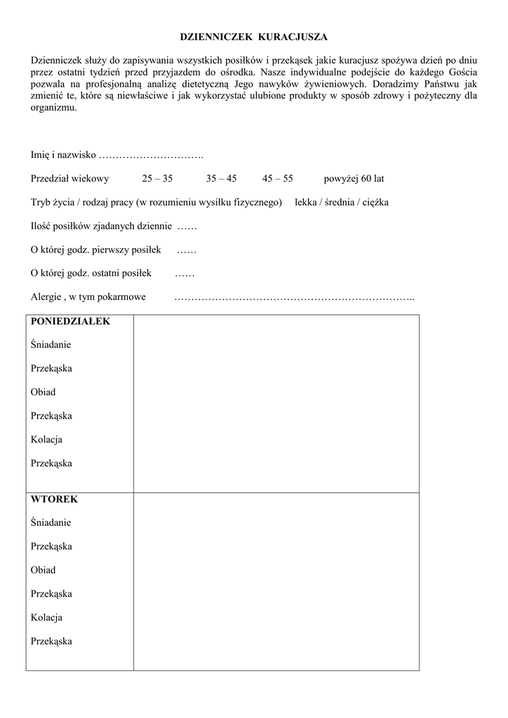 DZIENNICZEK KURACJUSZA Dzienniczek służy do zapisywania wszystkich posiłków i przekąsek jakie kuracjusz spożywa dzień po dniu przez ostatni tydzień przed przyjazdem do ośrodka. Nasze indywidualne podejście do każdego Gościa pozwala na profesjonalną analizę dietetyczną Jego nawyków żywieniowych. Doradzimy Państwu jak zmienić te, które są niewłaściwe i jak wykorzystać ulubione produkty w sposób zdrowy i pożyteczny dla organizmu. Imię i nazwisko …………………………. Przedział wiekowy 25 – 35 35 – 45 45 – 55 Tryb życia / rodzaj pracy (w rozumieniu wysiłku fizycznego) powyżej 60 lat lekka / średnia / ciężka Ilość posiłków zjadanych dziennie …… O której godz. pierwszy posiłek …… O której godz. ostatni posiłek …… Alergie , w tym pokarmowe …………………………………………………………….. PONIEDZIAŁEK Śniadanie Przekąska Obiad Przekąska Kolacja Przekąska WTOREK Śniadanie Przekąska Obiad Przekąska Kolacja Przekąska ŚRODA Śniadanie Przekąska Obiad Przekąska Kolacja Przekąska CZWARTEK Śniadanie Przekąska Obiad Przekąska Kolacja Przekąska PIĄTEK Śniadanie Przekąska Obiad Przekąska Kolacja Przekąska SOBOTA Śniadanie Przekąska Obiad Przekąska Kolacja Przekąska NIEDZIELA Śniadanie Przekąska Obiad Przekąska Kolacja Przekąska
