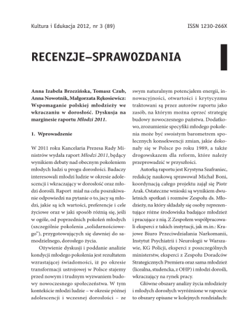 Kultura i Edukacja 2012, nr 3 (89) ISSN 1230-266X RECENZJE–SPRAWOZDANIA Anna Izabela Brzezińska, Tomasz Czub, Anna Nowotnik, Małgorzata Rękosiewicz: Wspomaganie polskiej młodzieży we wkraczaniu w dorosłość. Dyskusja na marginesie raportu Młodzi 2011. 1. Wprowadzenie W 2011 roku Kancelaria Prezesa Rady Ministrów wydała raport Młodzi 2011, będący wynikiem debaty nad obecnym pokoleniem młodych ludzi u progu dorosłości. Badaczy interesowali młodzi ludzie w okresie adolescencji i wkraczający w dorosłość oraz młodzi dorośli. Raport miał na celu poszukiwanie odpowiedzi na pytanie o to, jacy są młodzi, jakie są ich wartości, preferencje i cele życiowe oraz w jaki sposób różnią się, jeśli w ogóle, od poprzednich pokoleń młodych (szczególnie pokolenia „solidarnościowego”), przygotowujących się dawniej do samodzielnego, dorosłego życia. Ożywienie dyskusji i poddanie analizie kondycji młodego pokolenia jest rezultatem wzrastającej świadomości, iż po okresie transformacji ustrojowej w Polsce stajemy przed nowym i trudnym wyzwaniem budowy nowoczesnego społeczeństwa. W tym kontekście młodzi ludzie – w okresie późnej adolescencji i wczesnej dorosłości – ze swym naturalnym potencjałem energii, innowacyjności, otwartości i krytycyzmu traktowani są przez autorów raportu jako zasób, na którym można oprzeć strategię budowy nowoczesnego państwa. Dodatkowo, zrozumienie specyfiki młodego pokolenia może być swoistym barometrem społecznych konsekwencji zmian, jakie dokonały się w Polsce po roku 1989, a także drogowskazem dla reform, które należy przeprowadzić w przyszłości. Autorką raportu jest Krystyna Szafraniec, redakcję naukową sprawował Michał Boni, koordynacją całego projektu zajął się Piotr Arak. Ostateczne wnioski są wynikiem dwuletnich spotkań i rozmów Zespołu ds. Młodzieży, na który składały się osoby reprezentujące różne środowiska badające młodzież i pracujące z nią. Z Zespołem współpracowali eksperci z takich instytucji, jak m.in.: Krajowe Biuro Przeciwdziałania Narkomanii, Instytut Psychiatrii i Neurologii w Warszawie, KG Policji, eksperci z poszczególnych ministerstw, eksperci z Zespołu Doradców Strategicznych Premiera oraz sama młodzież (licealna, studencka, z OHP) i młodzi dorośli, wkraczający na rynek pracy. Główne obszary analizy życia młodzieży i młodych dorosłych wyróżnione w raporcie to obszary opisane w kolejnych rozdziałach: RECENZJE–SPRAWOZDANIA wartości, aspiracje i oczekiwania; edukacja i praca; małżeństwo, rodzina i wybory alternatywne; konsumpcja, czas wolny i media; sfera życia publicznego; zdrowie i zachowania ryzykowne. Całość dopełnia rozdział o sytuacji demograficznej Polski na tle innych krajów europejskich oraz świata. Każdy z rozdziałów zawiera liczne dane liczbowe, które uzyskano z badań własnych Zespołu, a także z innych badań przeprowadzanych w ostatnich latach, w tym m.in. z badań przeprowadzonych przez CBOS 1, SMG KRC2, danych GUS-u3, danych z Diagnozy społecznej4, raportów Komisji Unii Europejskiej5, danych MNiSzW6 czy CKE7. Raport kończy lista 35 rekomendacji dla polityk publicznych. 2. Problem Raport Młodzi 2011 zawiera bardzo bogaty i zróżnicowany zbiór danych oraz szereg istotnych wniosków i refleksji, które składają się na swoistą diagnozę młodego pokolenia, 1 Np. CBOS, Młodzież 2010, Warszawa 2011. Np. SMG KRC, Młodzi 2005. Raport z badań SMG KRC, Warszawa 2006. 3 Np. GUS, Dzieci w Polsce w 2008 roku. Charakterystyka demograficzna, Warszawa 2010. 4 J. Czapiński, T. Panek, Diagnoza społeczna 2009. Warunki i jakość życia Polaków, Warszawa 2010. 5 Np. Komisja UE, Employment in Europe, Raport Komisji Europejskiej, 2010. 6 Np. MNiSzW, Informacja o wynikach rekrutacji na studia na rok akademicki 2010/2011, Warszawa 2010. 7 Np. CKE, Osiągnięcia maturzystów w 2010 roku, Sprawozdanie z egzaminu maturalnego w 2010 roku, Warszawa 2010. 2 259 diagnozę, która może być pomocna przy poszukiwaniu, określaniu i uwspólnianiu najważniejszych kierunków inicjatyw i działań podejmowanych w trosce o rozwój i możliwie najlepsze wykorzystanie potencjału młodości. Dostrzegając tę niepowtarzalną wartość tkwiącą w raporcie, chcielibyśmy spojrzeć nań z perspektywy psychologii i podkreślić znaczenie niektórych przedstawionych w nim ustaleń oraz zarysować pewien kierunek zmian, których wdrożenie mogłoby, naszym zdaniem, istotnie poprawić szanse młodych ludzi nie tylko na skuteczne odnajdywanie satysfakcjonujących dla siebie pozycji w świecie dorosłych, ale przede wszystkich na aktywne zmienianie zastanych i tworzenie nowych warunków dla realizacji planów dotyczących swego dorosłego życia. Podejmując refleksję nad raportem Młodzi 2011 odnosimy się zarówno do jego treści, jak i do Rekomendacji dla polityk publicznych. Opracowanie zawiera unikatowe wg nas zestawienie danych na temat sposobu funkcjonowania i sytuacji młodych ludzi w Polsce. Zwraca jednak uwagę dysproporcja pomiędzy liczbą danych i analiz dotyczących stanu faktycznego a zakresem refleksji nad zebranym materiałem oraz charakterem wniosków i zaleceń sformułowanych na podstawie tego opracowania. Naszym zdaniem materiał zebrany w raporcie może stać się ważnym impulsem do poprawy sytuacji młodych ludzi w Polsce. Warto jednak poddać go dalszej i nieco głębszej refleksji, opierając się na wiedzy z różnych dyscyplin, aby jak najpełniej wykorzystać potencjał tkwiący w tym opracowaniu. Jesteśmy przekonani, że trafne inter- 260 pretacje i odpowiednie wnioski mogą zapoczątkować ważne zmiany społeczne. Mamy na myśli nie tylko takie zmiany, które wymagają decyzji władz i polityków, ale również takie (albo może przede wszystkim takie), które wymagają zmiany świadomości społecznej, zmiany sposobu rozumienia i oceniania zachowań, potrzeb oraz sytuacji, w jakiej zna