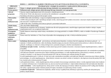 OBSZAR B Zadanie nr 1 Forma pomocy Adresat programu Maksymalna kwota dofinansowania Udział własny Zakres dofinansowania Wymagania dodatkowe Częstotliwość udzielania pomocy Zakres pojęć MODUŁ I – LIKWIDACJA BARIER UTRUDNIAJĄCYCH AKTYWIZACJĘ SPOŁECZNĄ I ZAWODOWĄ Likwidacja barier w dostępie do uczestnictwa w społeczeństwie informacyjnym Pomoc w zakupie sprzętu elektronicznego lub jego elementów oraz oprogramowania Dofinansowanie zakupu sprzętu elektronicznego lub jego elementów oraz oprogramowania Znaczny stopień niepełnosprawności lub orzeczenie o niepełnosprawności, Wiek do lat 18 lub wiek aktywności zawodowej lub zatrudnienie w przypadku osób w wieku emerytalnym Dysfunkcja obu kończyn górnych lub narządu wzroku 30.000 zł dla osoby niewidomej, z czego na urządzenia brajlowskie 20.000 zł 10.000 zł dla pozostałych osób z dysfunkcją narządu wzroku, stanowiącą powód wydania orzeczenia o znacznym stopniu niepełnosprawności lub orzeczenia o niepełnosprawności, 5.000 zł dla osoby z dysfunkcją obu kończyn górnych i pozostałych adresatów 10% ceny brutto zakupu/usługi Elektroniczne urządzenia lub ich elementy i dedykowane dla nich oprogramowanie, umoŜliwiające ograniczanie skutków rodzaju i stopnia niepełnosprawności oraz urządzenia brajlowskie Środki finansowe stanowiące udział własny wnioskodawcy nie mogą pochodzić ze środków PFRON, a takŜe ze środków Narodowego Funduszu Zdrowia Pomoc moŜe być udzielana co 3 lata, licząc od początku roku następującego po roku, w którym udzielono pomocy dysfunkcja obu kończyn górnych – potwierdzony zaświadczeniem lekarskim, wrodzony brak lub amputacja obu kończyn górnych – co najmniej w obrębie przedramienia a takŜe dysfunkcję charakteryzującą się znacznie obniŜoną sprawnością ruchową w zakresie obu kończyn górnych, wynikająca ze schorzeń o róŜnej etiologii (m.in. poraŜenia mózgowe, choroby neuromięśniowe), dysfunkcja narządu wzroku – dysfunkcja wzroku stanowiąca powód wydania orzeczenia o znacznym stopniu niepełnosprawności, a takŜe w przypadku: a) gdy dysfunkcja narządu wzroku nie jest przyczyną wydania orzeczenia o znacznym stopniu niepełnosprawności, ale wnioskodawca przedłoŜy zaświadczenie lekarskie wystawione przez lekarza okulistę potwierdzające, Ŝe osoba niepełnosprawna, której dotyczy wniosek, ma ostrość wzroku (w korekcji ) w oku lepszym równą lub poniŜej 0,05 i/lub ma zwęŜenie pola widzenia poniŜej 20 stopni, b) osób niepełnosprawnych w wieku do 16 roku Ŝycia, gdy wnioskodawca przedłoŜy zaświadczenie lekarskie wystawione przez lekarza okulistę potwierdzające, Ŝe osoba niepełnosprawna , której dotyczy wniosek, ma ostrość wzroku (w korekcji) w oku lepszym równą lub poniŜej 0,06 i/lub ma zwęŜenie pola widzenia poniŜej 30 stopni osoba głuchoniewidoma – osoba niepełnosprawna, która na skutek równoczesnego uszkodzenia słuchu i wzroku napotyka bardzo duŜe trudności w wymianie informacji oraz w komunikowaniu się, stan ten musi być potwierdzony w odpowiednim dokumencie lub zaświadczeniu lekarskim osoba niewidoma – osoba niepełnosprawna, której ostrość wzroku oka lepszego po korekcji szkłami nie przekracza 0,05 według skali Snellena lub osobę z ograniczonym polem widzenia poniŜej 20 stopni, niezaleŜnie od zachowanej ostrości wzroku, urządzenia brajlowskie – elektroniczne urządzenia, zdolne tworzyć wypukłą formę informacji wyjściowej, moŜliwą do odczytania przy pomocy zmysłu dotyku