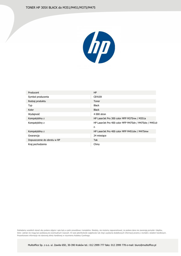 TONER HP 305X BLACK do M351/M451/M375/M475 Producent HP Symbol producenta CE410X Rodzaj produktu Toner Typ Black Kolor Black Wydajność 4 000 stron Kompatybilny z HP LaserJet Pro 300 color MFP M375nw / M351a Kompatybilny z HP LaserJet Pro 400 color MFP M475dn / M475dw / M451dn Kompatybilny z HP LaserJet Pro 400 color MFP M451dw / M475mw Gwarancja 24 miesiące Dopuszczenie do obrotu w RP Tak Kraj pochodzenia Chiny Dokładamy wszelkich starań aby podane zdjęcie i opis były w pełni prawidłowe i kompletne. Niestety, nie możemy zagwarantować, że podane dane nie zawierają pomyłek i błędów, które jednak nie mogą być podstawą do ewentualnych roszczeń. W razie jakichkolwiek wątpliwości lub chęci uzyskania dodatkowych informacji prosimy o kontakt z działem handlowym. Prezentowane informacje nie stanowią oferty handlowej w rozumieniu Kodeksu Cywilnego. Multioffice Sp. z o.o. ul. Zawiła 65D, 30-390 Kraków tel.: 012 2999 777 faks: 012 2999 778 e-mail: [email protected]