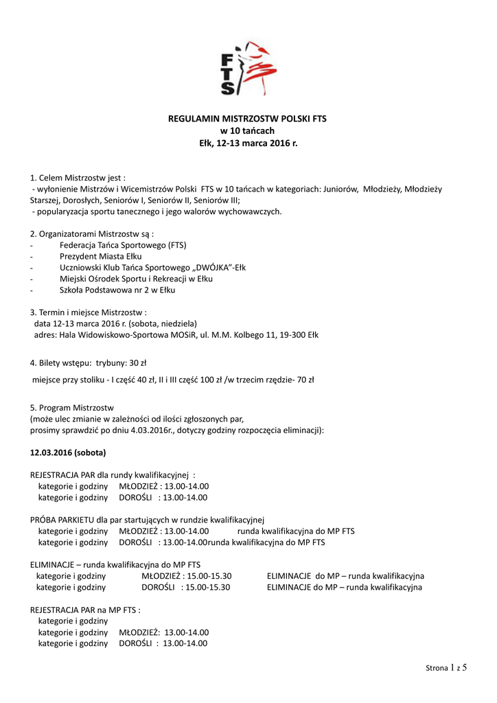REGULAMIN MISTRZOSTW POLSKI FTS w 10 tańcach Ełk, 12-13 marca 2016 r. 1. Celem Mistrzostw jest : - wyłonienie Mistrzów i Wicemistrzów Polski FTS w 10 tańcach w kategoriach: Juniorów, Młodzieży, Młodzieży Starszej, Dorosłych, Seniorów I, Seniorów II, Seniorów III; - popularyzacja sportu tanecznego i jego walorów wychowawczych. 2. Organizatorami Mistrzostw są : Federacja Tańca Sportowego (FTS) Prezydent Miasta Ełku Uczniowski Klub Tańca Sportowego „DWÓJKA”-Ełk Miejski Ośrodek Sportu i Rekreacji w Ełku Szkoła Podstawowa nr 2 w Ełku 3. Termin i miejsce Mistrzostw : data 12-13 marca 2016 r. (sobota, niedziela) adres: Hala Widowiskowo-Sportowa MOSiR, ul. M.M. Kolbego 11, 19-300 Ełk 4. Bilety wstępu: trybuny: 30 zł miejsce przy stoliku - I część 40 zł, II i III część 100 zł /w trzecim rzędzie- 70 zł 5. Program Mistrzostw (może ulec zmianie w zależności od ilości zgłoszonych par, prosimy sprawdzić po dniu 4.03.2016r., dotyczy godziny rozpoczęcia eliminacji): 12.03.2016 (sobota) REJESTRACJA PAR dla rundy kwalifikacyjnej : kategorie i godziny MŁODZIEŻ : 13.00-14.00 kategorie i godziny DOROŚLI : 13.00-14.00 PRÓBA PARKIETU dla par startujących w rundzie kwalifikacyjnej kategorie i godziny MŁODZIEŻ : 13.00-14.00 runda kwalifikacyjna do MP FTS kategorie i godziny DOROŚLI : 13.00-14.00runda kwalifikacyjna do MP FTS ELIMINACJE – runda kwalifikacyjna do MP FTS kategorie i godziny MŁODZIEŻ : 15.00-15.30 kategorie i godziny DOROŚLI : 15.00-15.30 ELIMINACJE do MP – runda kwalifikacyjna ELIMINACJE do MP – runda kwalifikacyjna REJESTRACJA PAR na MP FTS : kategorie i godziny kategorie i godziny MŁODZIEŻ: 13.00-14.00 kategorie i godziny DOROŚLI : 13.00-14.00 Strona 1 z 5 PRÓBA PARKIETU MP FTS: kategorie i godziny MŁODZIEŻ: 13.45-14.45 kategorie i godziny DOROŚLI : 13.45-14.45 ELIMINACJE MP FTS: kategorie i godziny kategorie i godziny MŁODZIEŻ: 15.00-17.00 DOROŚLI : 15.00-17.00 GALA WIECZORNA MP FTS : kategorie i godziny : MŁODZIEŻ: 19.00-21.30 DOROŚLI : 19.00-21.30 13.03.2016 (niedziela) REJESTRACJA PAR do rundy kwalifikacyjnej do MP FTS : kategorie i godziny JUNIOR : 13.00-14.00 kategorie i godziny MŁODZIEŻ STARSZA : 13.00-14.00 PRÓBA PARKIETU dla par startujących w rundzie kwalifikacyjnej do MP FTS kategorie i godziny JUNIOR : 13.45-14.45 runda kwalifikacyjna do MP FTS kategorie i godziny MŁODZIEŻ STARSZA : 13.45-14.45 runda kwalifikacyjna do MP FTS ELIMINACJE – runda kwalifikacyjna do MP FTS kategorie i godziny JUNIOR : 15.00-15.30 runda kwalifikacyjna do MP FTS kategorie i godziny MŁODZIEŻ STARSZA : 15.00-15.30 runda kwalifikacyjna do MP FTS REJESTRACJA PAR NA MP FTS: kategorie i godziny JUNIOR : 13.00-14.00 kategorie i godziny MŁODZIEŻ STARSZA : 13.00-14.00 kategorie i godziny SENIOR I, II, III : 13.00-14.00 PRÓBA PARKIETU MP FTS: kategorie i godziny JUNIOR : 13.45-14.45 kategorie i godziny MŁODZIEŻ STARSZA : 13.45-14.45 kategorie i godziny SENIOR I, II, III : 13.45-14.45 ELIMINACJE MP FTS: kategorie i godziny kategorie i godziny kategorie i godziny JUNIOR : 15.00-17.00 MŁODZIEŻ STARSZA : 15.00-17.00 SENIOR I, II, II : 15.00-17.00 GALA WIECZORNA MP FTS : kategorie i godziny JUNIOR : 19.00-21.30 MłODZIEŻ STARSZA : 19.00-21.30 SENIOR I, II, III : 19.00-21.30 6. Prawo startu w Mistrzostwach mają pary, które : - dokonały wpłaty za licencję startową na dany rok i są odnotowane w Bazie FTS, - są członkami klubu sportowego, który dokonał opłaty za licencję na dany rok i jest odnotowany w Bazie FTS, - przedstawią podczas rejestracji książeczkę startową FTS (zgodnie z pkt. 9 przepisów FTS), Strona 2 z 5 - spełniają warunki uczestnictwa w Mistrzostwach Polski FTS zgodnie z Przepisami Rywalizacji w Sporcie Tanecznym, otrzymały kwalifikacje zgodne z „Dwustopniowym systemem rozgrywania Mistrzostw Polski FTS”. 7. Warunkiem uczestnictwa w Mistrzostwach jest : - Uzyskanie kwalifikacji zgodnie z przepisami FTS; - Rejestracja on-line na stronie www. Mistrzostw zgodnie z terminem zgłoszeń do dnia 4.III.2016 r. wniesienie opłaty startowej na konto organizatora oraz przesłanie kserokopii dowodu wpłaty na adres : Uczniowski Klub Tańca Sportowego „DWÓJKA”-Ełk ul. Małeckich 1, 19-300 Ełk mail: [email protected] Bank Pekao SA konto: 12 1240 5745 1111 0010 5525 3744 Opłata startowa wniesiona do dnia 4 III 2016 wynosi 100 zł od osoby. (decyduje data nadania wpłaty) Opłata wniesiona po dniu 4 III 2016 wynosi 200 zł od osoby (dwukrotność opłaty terminowej); Zamknięcie list startowych nastąpi dnia: 9 marca 2016 r. godz. 24.00. Brak zgłoszenia oraz opłaty startowej na koncie organizatora w tym terminie uniemożliwia start pary w Mistrzostwach. − odebranie numeru startowego najpóźniej 1 godzinę przed rozpoczęciem rundy eliminacyjnej; − organizatorzy przyjmują zgłoszenia par dokonane wyłącznie przez członków wspierających lub zwyczajnych; − członek zwyczajny lub wspierający ma obowiązek podać drogą mailową organizatorowi dane osobowe przedstawiciela członka zwyczajnego lub wspierającego, który będzie obecny podczas mistrzostw, wymieniony przedstawiciel odbiera puchar, gdy para wejdzie do finału, po ogłoszeniu listy finalistów potwierdza swoją obecność przedstawicielowi organizatora , który podaje aktualne dane konferansjerom. - Organizatorzy nie wysyłają potwierdzeń przyjęcia par; - Lista startowa par jest publikowana na stronie internetowej Mistrzostw: www.fts-taniec.pl Zgłoszenia on-line są wiążące tylko i wyłącznie z przesłaniem kserokopii dowodu wpłaty i są podstawą do zarejestrowania pary na liście startowej mistrzostw. Członek zwyczajny lub wspierający, który po terminie zgłoszeń decyduje się na wycofanie pary z udziału w Mistrzostwach, ma obowiązek o tym fakcie powiadomić pisemnie organizatora Mistrzostw. W przypadku niepoinformowania Organizatora Mistrzostw członek zwyczajny lub wspierający ponosi koszty na rzecz organizat
