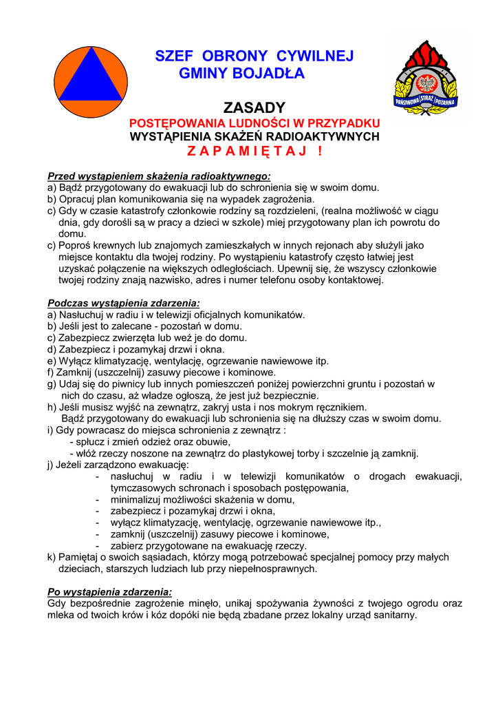 SZEF OBRONY CYWILNEJ GMINY BOJADŁA ZASADY POSTĘPOWANIA LUDNOŚCI W PRZYPADKU WYSTĄPIENIA SKAŻEŃ RADIOAKTYWNYCH ZAPAMIĘTAJ ! Przed wystąpieniem skażenia radioaktywnego: a) Bądź przygotowany do ewakuacji lub do schronienia się w swoim domu. b) Opracuj plan komunikowania się na wypadek zagrożenia. c) Gdy w czasie katastrofy członkowie rodziny są rozdzieleni, (realna możliwość w ciągu dnia, gdy dorośli są w pracy a dzieci w szkole) miej przygotowany plan ich powrotu do domu. c) Poproś krewnych lub znajomych zamieszkałych w innych rejonach aby służyli jako miejsce kontaktu dla twojej rodziny. Po wystąpieniu katastrofy często łatwiej jest uzyskać połączenie na większych odległościach. Upewnij się, że wszyscy członkowie twojej rodziny znają nazwisko, adres i numer telefonu osoby kontaktowej. Podczas wystąpienia zdarzenia: a) Nasłuchuj w radiu i w telewizji oficjalnych komunikatów. b) Jeśli jest to zalecane - pozostań w domu. c) Zabezpiecz zwierzęta lub weź je do domu. d) Zabezpiecz i pozamykaj drzwi i okna. e) Wyłącz klimatyzację, wentylację, ogrzewanie nawiewowe itp. f) Zamknij (uszczelnij) zasuwy piecowe i kominowe. g) Udaj się do piwnicy lub innych pomieszczeń poniżej powierzchni gruntu i pozostań w nich do czasu, aż władze ogłoszą, że jest już bezpiecznie. h) Jeśli musisz wyjść na zewnątrz, zakryj usta i nos mokrym ręcznikiem. Bądź przygotowany do ewakuacji lub schronienia się na dłuższy czas w swoim domu. i) Gdy powracasz do miejsca schronienia z zewnątrz : - spłucz i zmień odzież oraz obuwie, - włóż rzeczy noszone na zewnątrz do plastykowej torby i szczelnie ją zamknij. j) Jeżeli zarządzono ewakuację: - nasłuchuj w radiu i w telewizji komunikatów o drogach ewakuacji, tymczasowych schronach i sposobach postępowania, - minimalizuj możliwości skażenia w domu, - zabezpiecz i pozamykaj drzwi i okna, - wyłącz klimatyzację, wentylację, ogrzewanie nawiewowe itp., - zamknij (uszczelnij) zasuwy piecowe i kominowe, - zabierz przygotowane na ewakuację rzeczy. k) Pamiętaj o swoich sąsiadach, którzy mogą potrzebować specjalnej pomocy przy małych dzieciach, starszych ludziach lub przy niepełnosprawnych. Po wystąpienia zdarzenia: Gdy bezpośrednie zagrożenie minęło, unikaj spożywania żywności z twojego ogrodu oraz mleka od twoich krów i kóz dopóki nie będą zbadane przez lokalny urząd sanitarny.