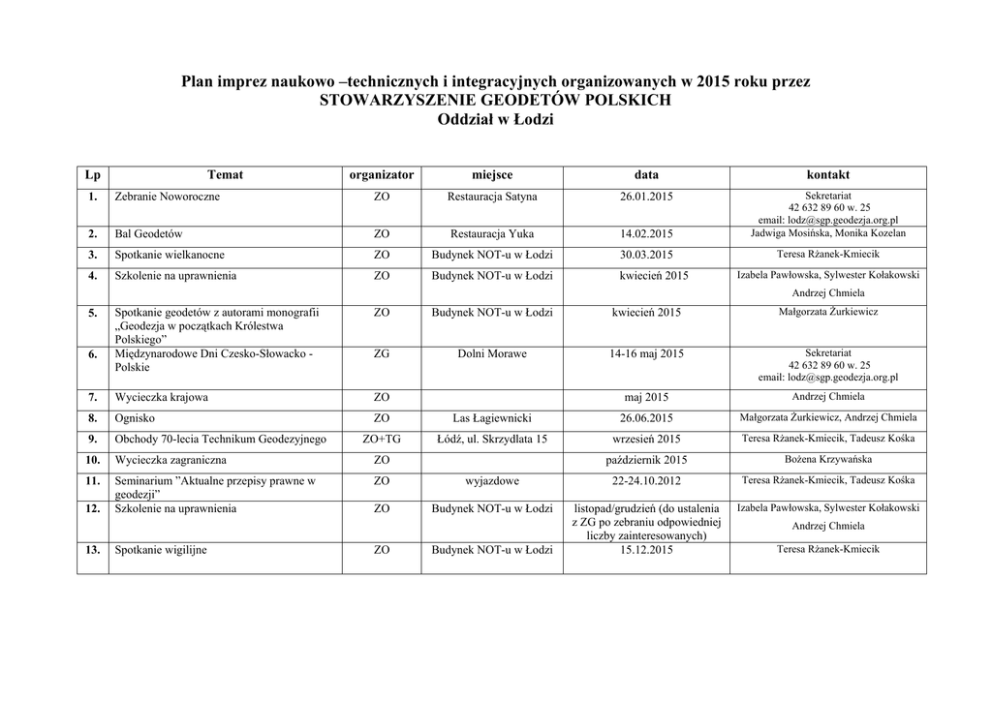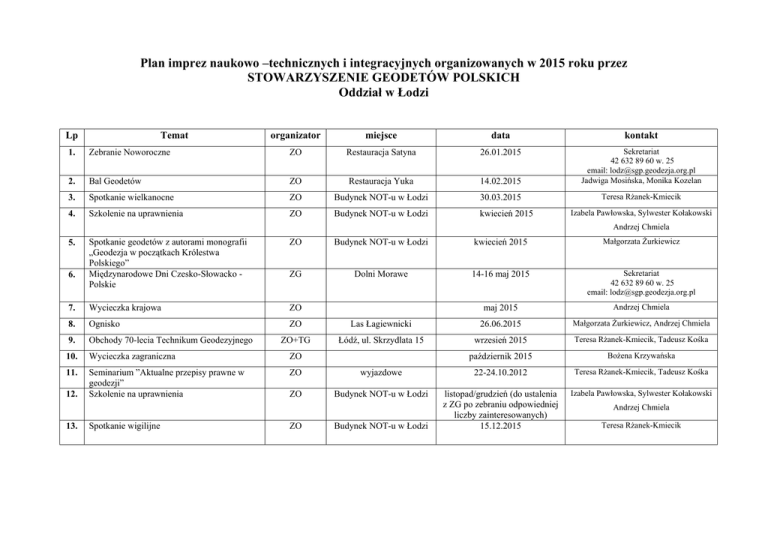 Plan imprez naukowo –technicznych i integracyjnych organizowanych w 2015 roku przez STOWARZYSZENIE GEODETÓW POLSKICH Oddział w Łodzi Lp Temat organizator miejsce data kontakt 1. Zebranie Noworoczne ZO Restauracja Satyna 26.01.2015 2. Bal Geodetów ZO Restauracja Yuka 14.02.2015 Sekretariat 42 632 89 60 w. 25 email: [email protected] Jadwiga Mosińska, Monika Kozelan 3. Spotkanie wielkanocne ZO Budynek NOT-u w Łodzi 30.03.2015 Teresa Rżanek-Kmiecik 4. Szkolenie na uprawnienia ZO Budynek NOT-u w Łodzi kwiecień 2015 Izabela Pawłowska, Sylwester Kołakowski Andrzej Chmiela Spotkanie geodetów z autorami monografii „Geodezja w początkach Królestwa Polskiego” Międzynarodowe Dni Czesko-Słowacko Polskie ZO Budynek NOT-u w Łodzi kwiecień 2015 Małgorzata Żurkiewicz ZG Dolni Morawe 14-16 maj 2015 Sekretariat 42 632 89 60 w. 25 email: [email protected] 7. Wycieczka krajowa ZO maj 2015 Andrzej Chmiela 8. Ognisko ZO Las Łagiewnicki 26.06.2015 Małgorzata Żurkiewicz, Andrzej Chmiela 9. Obchody 70-lecia Technikum Geodezyjnego ZO+TG Łódź, ul. Skrzydlata 15 wrzesień 2015 Teresa Rżanek-Kmiecik, Tadeusz Kośka 10. Wycieczka zagraniczna ZO październik 2015 Bożena Krzywańska 11. Seminarium ”Aktualne przepisy prawne w geodezji” Szkolenie na uprawnienia ZO wyjazdowe 22-24.10.2012 Teresa Rżanek-Kmiecik, Tadeusz Kośka ZO Budynek NOT-u w Łodzi listopad/grudzień (do ustalenia z ZG po zebraniu odpowiedniej liczby zainteresowanych) 15.12.2015 Izabela Pawłowska, Sylwester Kołakowski 5. 6. 12. 13. Spotkanie wigilijne ZO Budynek NOT-u w Łodzi Andrzej Chmiela Teresa Rżanek-Kmiecik