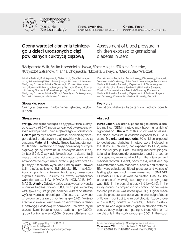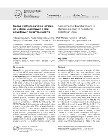 Praca oryginalna Endokrynol. Ped. 2015.14.2.51.37-46. Ocena wartości ciśnienia tętniczego u dzieci urodzonych z ciąż powikłanych cukrzycą ciążową Original Paper Pediatr. Endocrinol. 2015.14.2.51.37-46. Assessment of blood pressure in children exposed to gestational diabetes in utero Małgorzata Wilk, 1Anita Horodnicka-Józwa, 2Piotr Molęda 1Elżbieta Petriczko, 3 Krzysztof Safranow, 4Hanna Chojnacka, 4Elżbieta Gawrych, 1Mieczysław Walczak 1 1 Klinika Pediatrii, Endokrynologii, Diabetologii, Chorób Metabolicznych i Kardiologii Wieku Rozwojowego, Pomorski Uniwersytet Medyczny, Szczecin, 2Klinika Diabetologii i Chorób Wewnętrznych, Pomorski Uniwersytet Medyczny, Szczecin, 3Zakład Biochemii Katedry Biochemii i Chemii Medycznej, Pomorski Uniwersytet Medyczny, Szczecin, 4Klinika Chirurgii Dziecięcej i Onkologicznej, Pomorski Uniwersytet Medyczny, Szczecin 1 Słowa kluczowe Cukrzyca ciążowa, nadciśnienie tętnicze, otyłość u dzieci Key words Gestational diabetes, hypertension, pediatric obesity Streszczenie Abstract Wstęp. Dzieci pochodzące z ciąży powikłanej cukrzycą ciążową (GDM) mogą wykazywać zwiększone ryzyko rozwoju nadciśnienia tętniczego w przyszłości. Celem pracy była analiza wartości ciśnienia tętniczego u dzieci urodzonych z ciąż powikłanych cukrzycą ciążową. Materiał i metody. Grupę badaną stanowiło 50 dzieci urodzonych z ciąży powikłanej cukrzycą ciążową, grupę kontrolną 46 zdrowych dzieci z ciąży bez GDM. Z wywiadu lekarskiego i dokumentacji medycznej uzyskano dane dotyczące parametrów antropometrycznych matki przed ciążą oraz przebiegu ciąży. Oceniono wysokość i masę ciała, obwód talii i bioder, obliczono BMI dziecka iBMI matki.Dokonano pomiaru ciśnienia tętniczego, oznaczono stężenie glukozy i insuliny na czczo, wyznaczono wartości wskaźników HOMA2-IR, HOMA2-B, HOMA2-S. Wyniki. Odsetek dzieci z nadwagą i otyłością w grupie badanej wyniósł 38%, w grupie kontrolnej 41% (p=0,19). W grupie badanej wykazano istotnie wyższe wartości średniego ciśnienia skurczowego w porównaniu z grupą kontrolną (p=0,02). Wyższe średnie ciśnienie skurczowe obserwowano u dzieci z nadwagą i otyłością w porównaniu ze szczupłymi uczestnikami badania (grupa badana – p=0,0002; grupa kontrolna – p=0,008). Średnie ciśnienie roz- Introduction. Children exposed to gestational diabetes mellitus (GDM) in utero may have higher risk of hypertension. The aim of this study was to assess the blood pressure in children exposed to GDM in utero. Material and methods. 50 children exposed to gestational diabetes in utero were included in the study. 46 children, not exposed to GDM, were the control group. Data including mothers’ pregestational anthropometric parameters and the course of pregnancy were obtained from the interview and medical records. Height, body mass, waist and hip circumference were measured, child’s and mother’s BMI were calculated. Blood pressure and values of fasting glucose, insulin were measured. HOMA2-IR, HOMA2-S, HOMA2-B were calculated. Results. The prevalence of overweight/obesity in the study group was 38%, in the control group 41% (p=0,19). In the study group in comparison to control, higher mean systolic pressure was noted (p=0,02). Higher mean systolic pressure was observed in overweight/obese children in contrast to slim participants (study group – p=0,0002; control – p=0,008). Mean diastolic pressure was significantly higher in children with excessive body weight comparing to those with normal weight only in the study group (p=0,03). In the study © Copyright by PTEiDD 2015 [email protected] www.endokrynologiapediatryczna.pl www.pteidd.pl Department of Pediatrics, Endocrinology, Diabetology, Metabolic Diseases and Cardiology of the Developmental Age, Pomeranian Medical University, Szczecin, 2Department of Diabetology and Internal Medicine, Pomeranian Medical University, Szczecin, 3 Chair of Biochemistry and Medical Chemistry, Pomeranian Medical University, Szczecin, 4Department of Pediatric Surgery and Oncology, Pomeranian Medical University, Szczecin Adres do korespondencji / Correspondence address: Małgorzata Wilk, ul. Unii Lubelskiej 1, 71-252 Szczecin, tel. 914253166, fax 914253167, e-mail: [email protected] kurczowe było istotnie wyższe u dzieci z nadmierną masą ciała w porównaniu do dzieci z masą prawidłową jedynie w grupie badanej (p=0,03).W grupie badanej obserwowano korelacje: SD średniego ciśnienia skurczowego z obwodem talii,SD średniego ciśnienia rozkurczowego z SD masy ciała i SD BMI, SD średniego ciśnienia skurczowego dziecka z BMI matki, a także związek średniego ciśnienia rozkurczowego z parametrami gospodarki węglowodanowej (stężeniem insuliny na czczo, HOMA2-IR, HOMA2-B, HOMA2-S). Wnioski. Dzieci pochodzące z ciąży powikłanej cukrzycą ciążową, mimo podobnej częstości występowania nadmiernej masy ciała w porównaniu z grupą rówieśników, mogą mieć zwiększone ryzyko rozwoju nadciśnienia tętniczego. Istotne wydaje się prowadzenie dalszych badań dotyczących ryzyka rozwoju nadciśnienia tętniczego oraz zapobieganie rozwojowi nadwagi i otyłości w tej grupie. cohort the following correlations were noted: mean systolic pressure SD with waist circumference, mean diastolic pressure SD with body mass SD and BMI SD, child’s mean systolic pressure SD with mother’s BMI. The association of mean diastolic pressure and carbohydrate parameters (fasting insulin, HOMA2-IR, HOMA2-B, HOMA2-S) was observed. Conclusions. Children exposed to gestational diabetes in utero, in spite of similar prevalence of overweight/obesity comparing to their non-exposed peers, could have higher risk of hypertension in future. Further studies of this issue and prevention of overweight and obesity in this group of children seems to be essential. Pediatr. Endocrinol. 2015.14.2.51.37-46. © Copyright by PTEiDD 2015 Endokrynol. Ped. 2015.14.2.51.