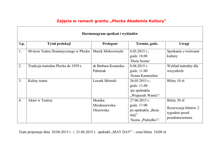 Zajęcia w ramach grantu „Płocka Akademia Kultury” Harmonogram spotkań i wykładów Lp. Tytuł prelekcji Prelegent 1. 40-lecie Teatru Dramatycznego w Płocku Marek Mokrowiecki 2. Tradycja teatralna Płocka do 1939 r. dr Barbara KonarskaPabiniak 3. Kulisy teatru Leszek Skierski 4. Aktor w Teatrze Monika MioduszewskaOlszewska Termin, godz. 6.05.2015 r., godz. 18.00 /Duża Scena/ 8.06.2015 r. godz. 11.00 /Scena Kameralna/ 26.05.2015 r., godz. 11.00 /po spektaklu „Wujaszek Wania”/ 27.06.2015 r. godz. 17.00 po spektaklu „Boże mój” /Scena „Piekiełko”/ Teatr proponuje dnia 20.06.2015 r. i 21.06.2015 r. spektakl „MAY DAY” – cena biletu 10,00 zł. Uwagi Spotkanie z twórcami kultury Wykład teatralny dla wszystkich Bilety 10 zł Bilety 30 zł Rezerwacja biletów 2 tygodnie przed przedstawieniem