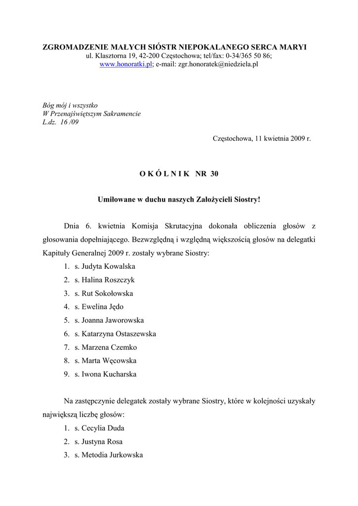 ZGROMADZENIE MAŁYCH SIÓSTR NIEPOKALANEGO SERCA MARYI ul. Klasztorna 19, 42-200 Częstochowa; tel/fax: 0-34/365 50 86; www.honoratki.pl; e-mail: [email protected] Bóg mój i wszystko W Przenajświętszym Sakramencie L.dz. 16 /09 Częstochowa, 11 kwietnia 2009 r. O K Ó L N I K NR 30 Umiłowane w duchu naszych ZałoŜycieli Siostry! Dnia 6. kwietnia Komisja Skrutacyjna dokonała obliczenia głosów z głosowania dopełniającego. Bezwzględną i względną większością głosów na delegatki Kapituły Generalnej 2009 r. zostały wybrane Siostry: 1. s. Judyta Kowalska 2. s. Halina Roszczyk 3. s. Rut Sokołowska 4. s. Ewelina Jędo 5. s. Joanna Jaworowska 6. s. Katarzyna Ostaszewska 7. s. Marzena Czemko 8. s. Marta Węcowska 9. s. Iwona Kucharska Na zastępczynie delegatek zostały wybrane Siostry, które w kolejności uzyskały największą liczbę głosów: 1. s. Cecylia Duda 2. s. Justyna Rosa 3. s. Metodia Jurkowska W załączeniu podaję pełną listę delegatek Kapituły Generalnej 2009 r. Drogie Siostry Delegatki! Zostałyśmy obdarzone zaufaniem Sióstr, które powierzyły nam szczególną troskę o dobro Zgromadzenia. To nakłada na nas odpowiedzialność za nadanie kierunku duchowego rozwoju i działalności naszej rodziny zakonnej. Z wielką wraŜliwością nasłuchujmy czego pragnie dla nas Bóg, czego od nas Ŝąda, czego oczekuje. Przygotowujmy nasze serca do rozpoznawania woli BoŜej. Okazją do wspólnego słuchania Boga będą rekolekcje, na które wszystkie Siostry Delegatki zapraszam. Przypominam, Ŝe rozpoczną się one 20 czerwca br. w Uroczystość Niepokalanego Serca Maryi wieczorem, a zakończą 26 czerwca równieŜ wieczorem. Następnego dnia rozpoczniemy Kapitułę. Jej zakończenie przewidziane jest w sobotę tj. 4. lipca. Zachęcam, w miarę moŜliwości, do przybycia 19 czerwca do Olsztyna, by nie podróŜować w dzień patronalnego święta. Wszystkie Siostry proszę o towarzyszenie modlitwą, ofiarą, umartwieniem, cierpieniem gdyŜ jest to nasza wspólna sprawa, chodzi o naszą rodzinę. KaŜdą Siostrę polecam szczególnej opiece Niepokalanego Serca Maryi m. ElŜbieta Brogowska przełoŜona generalna